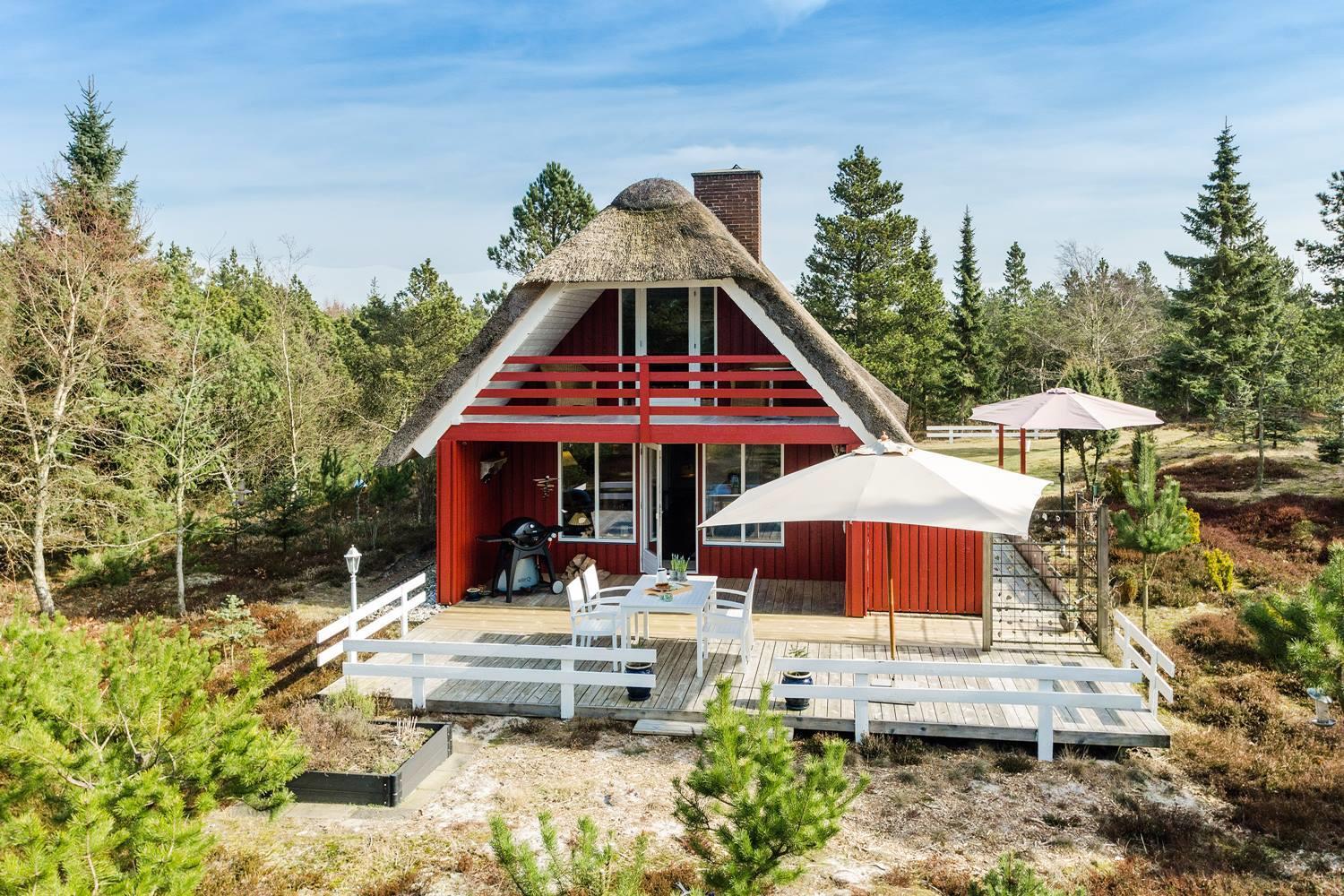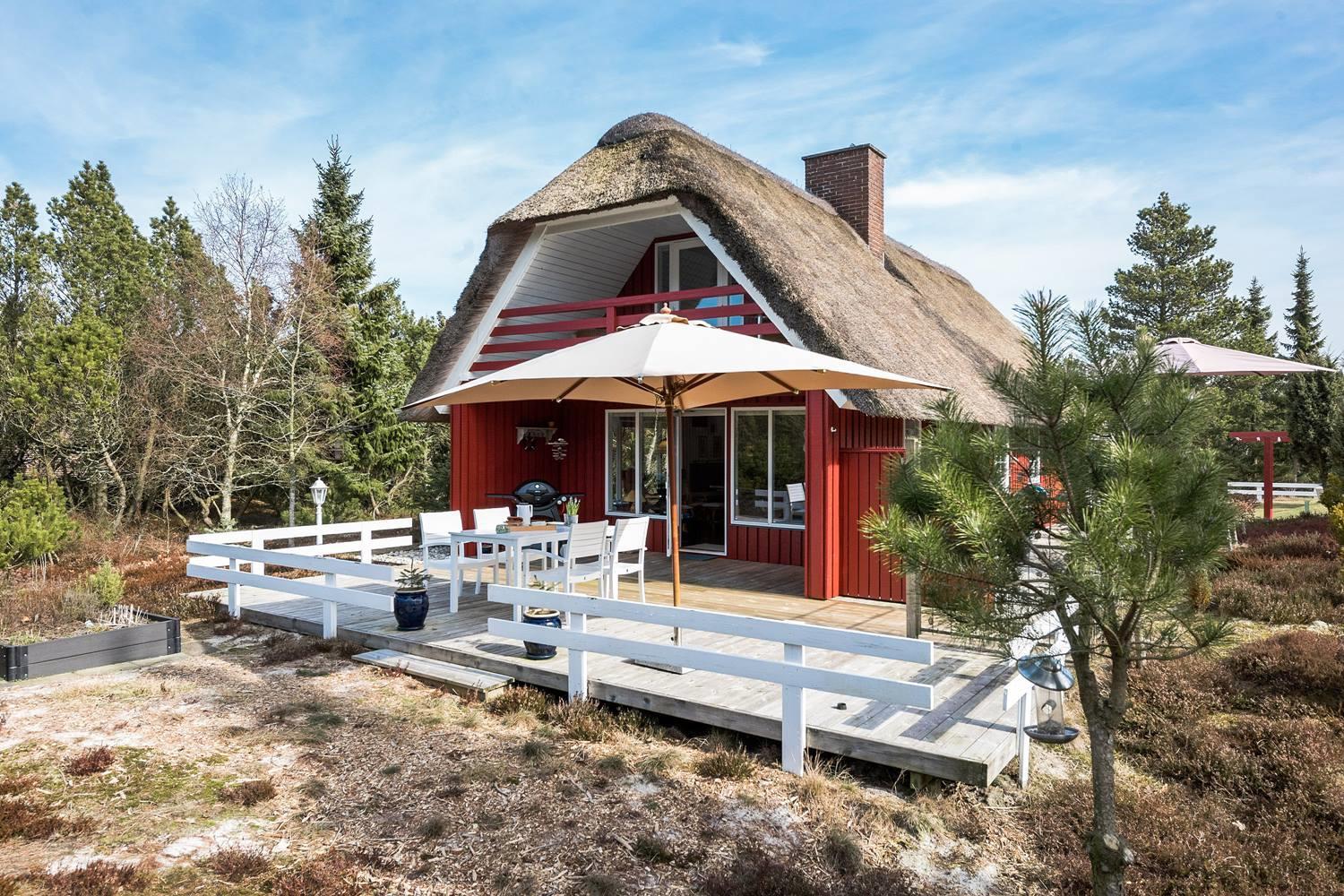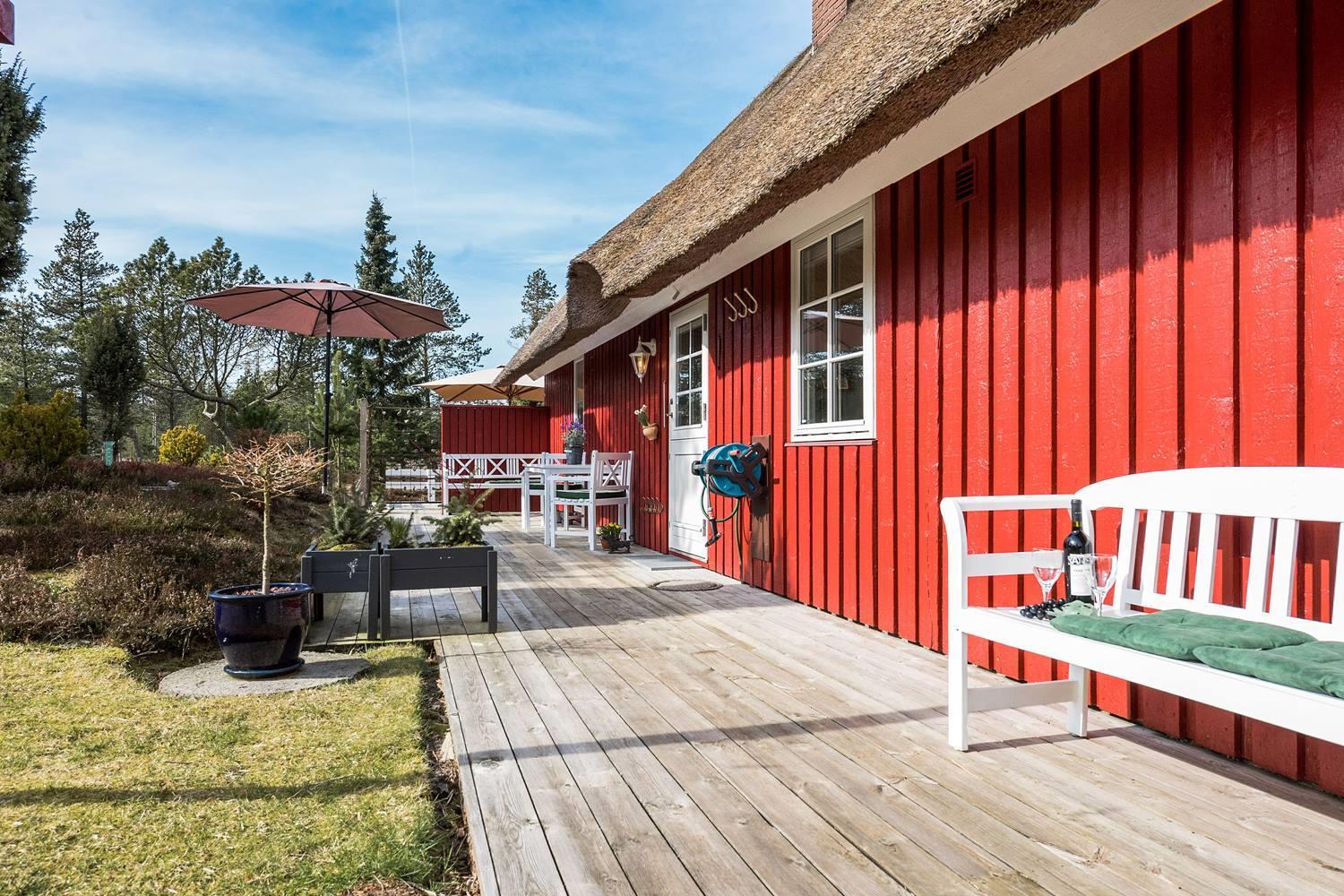 Dette røde sommerhus med stråtag forener klassisk dansk charme med moderne boligkomfort – perfekt til en afslappende ferie ved vestkysten for op til 4 personer.