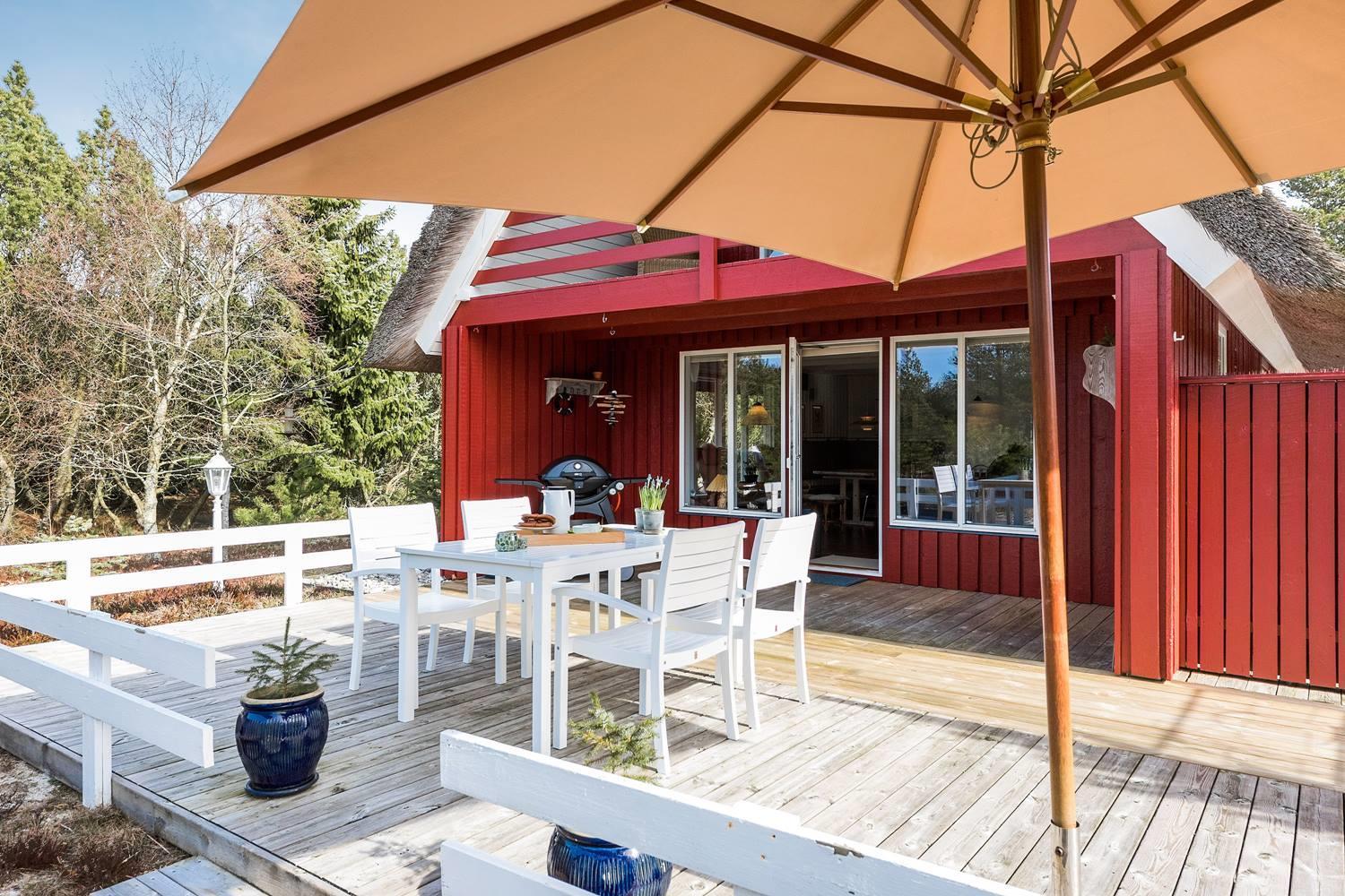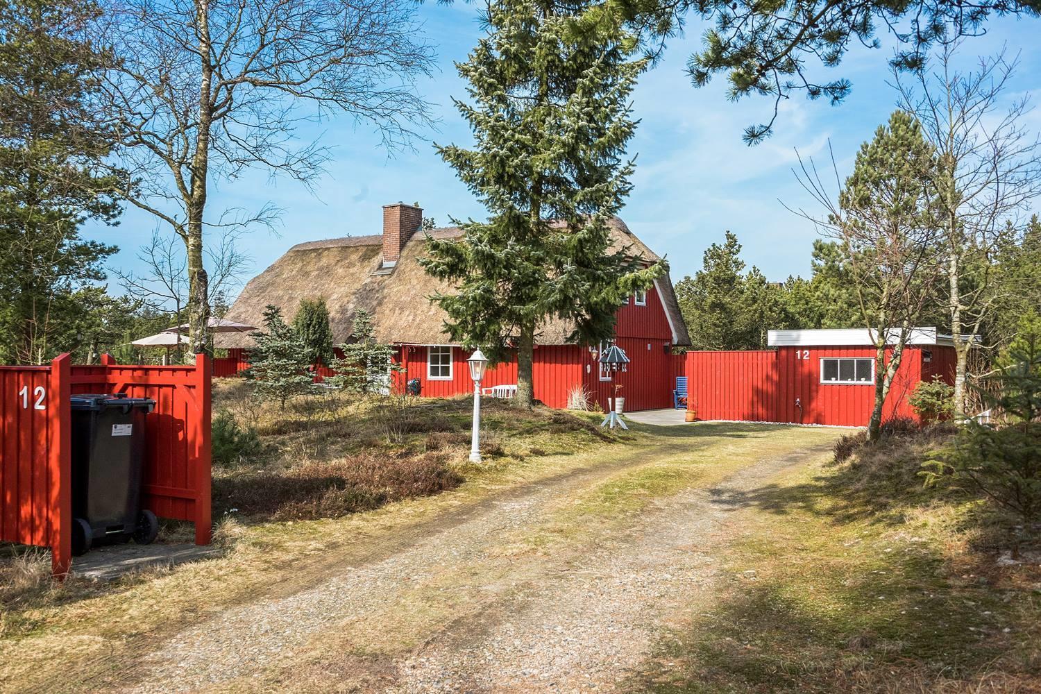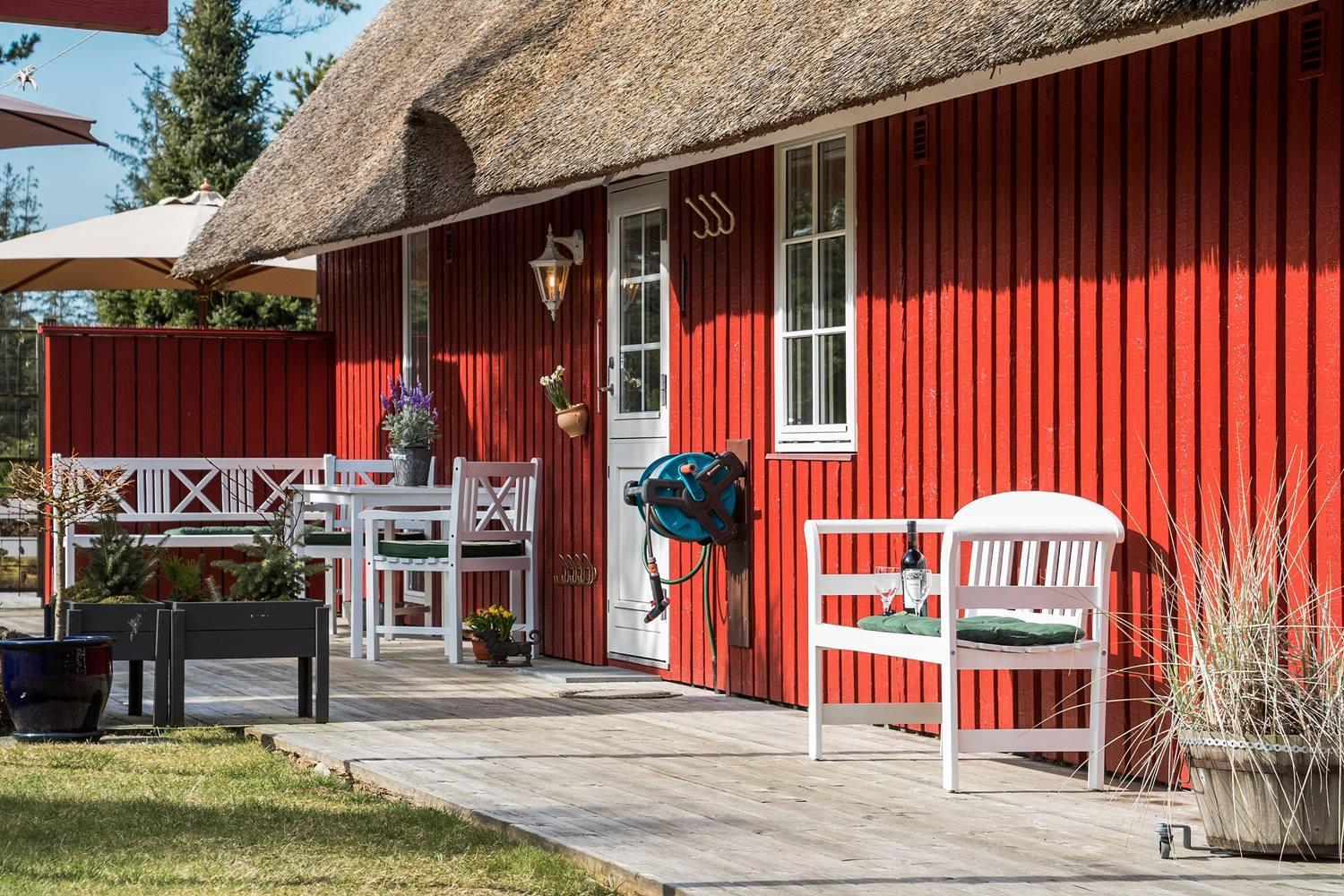 Dette røde sommerhus med stråtag forener klassisk dansk charme med moderne boligkomfort – perfekt til en afslappende ferie ved vestkysten for op til 4 personer.