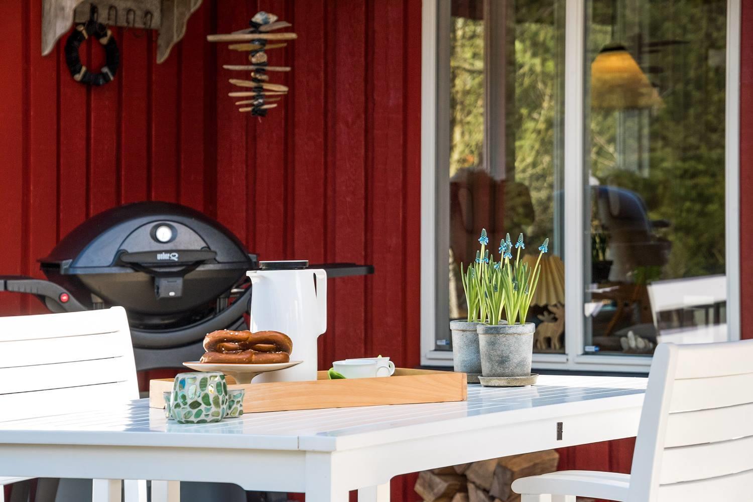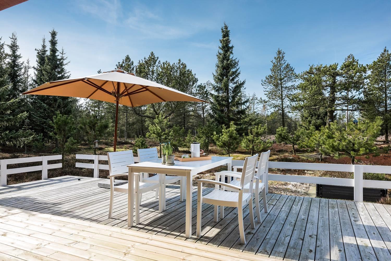 Det rolige udendørsområde indbyder til afslapning og fordybelse. På den overdækkede terrasse kan du starte dagen stille og roligt eller nyde aftenen – uanset vejret. Omgivet af natur får du her masser af fred og privatliv, perfekt til at koble af efter en stranddag eller en spændende udflugt.