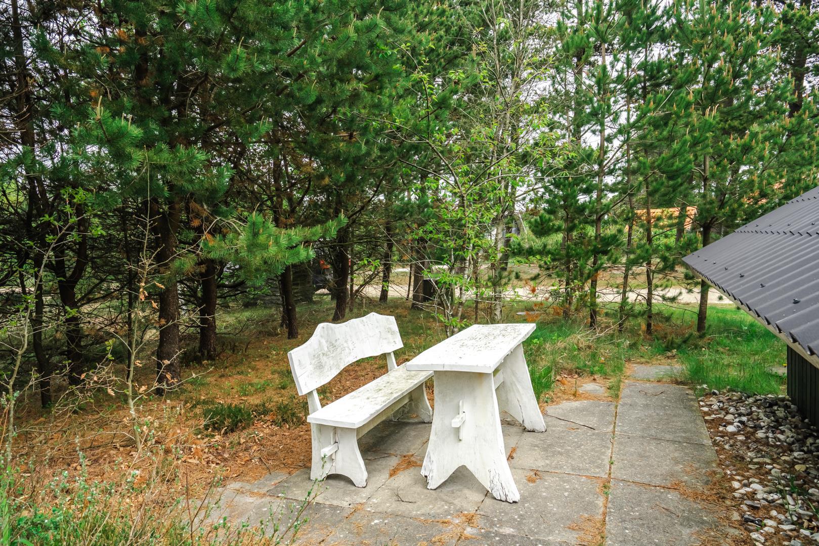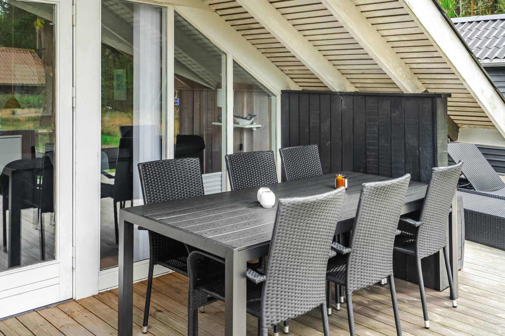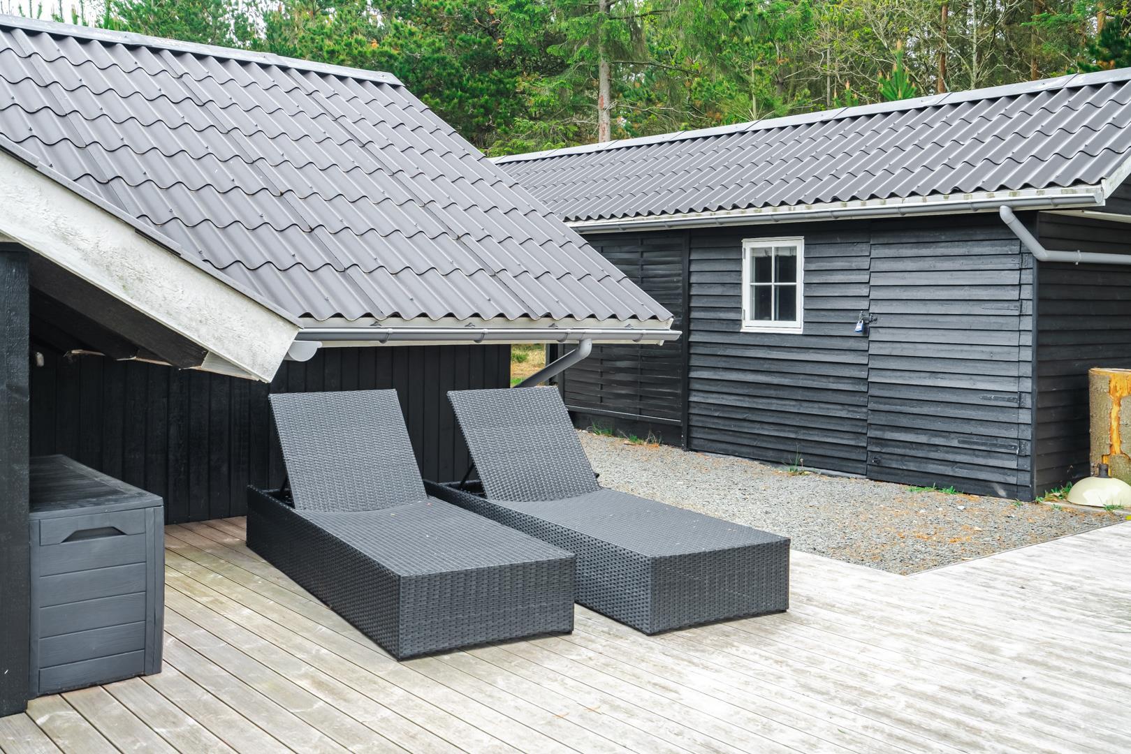 Udenfor venter et hyggeligt og velholdt udeområde, hvor I kan nyde ferien fuldt ud. Den overdækkede terrasse indbyder til morgenkaffe i solen, grillmiddage i al slags vejr og afslapning i den friske vestkystluft.
