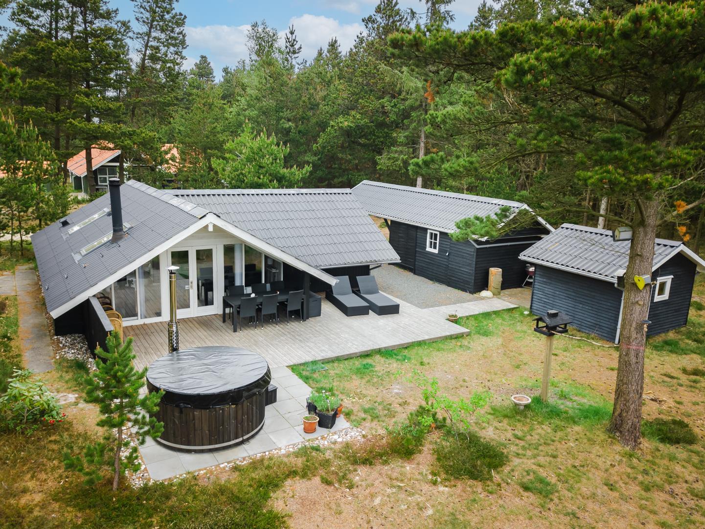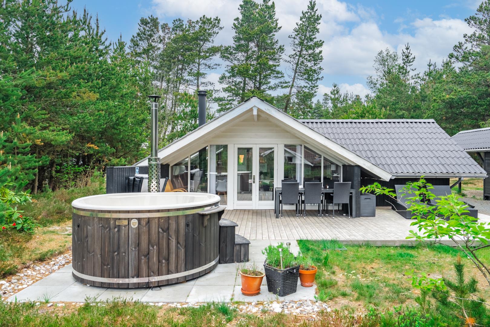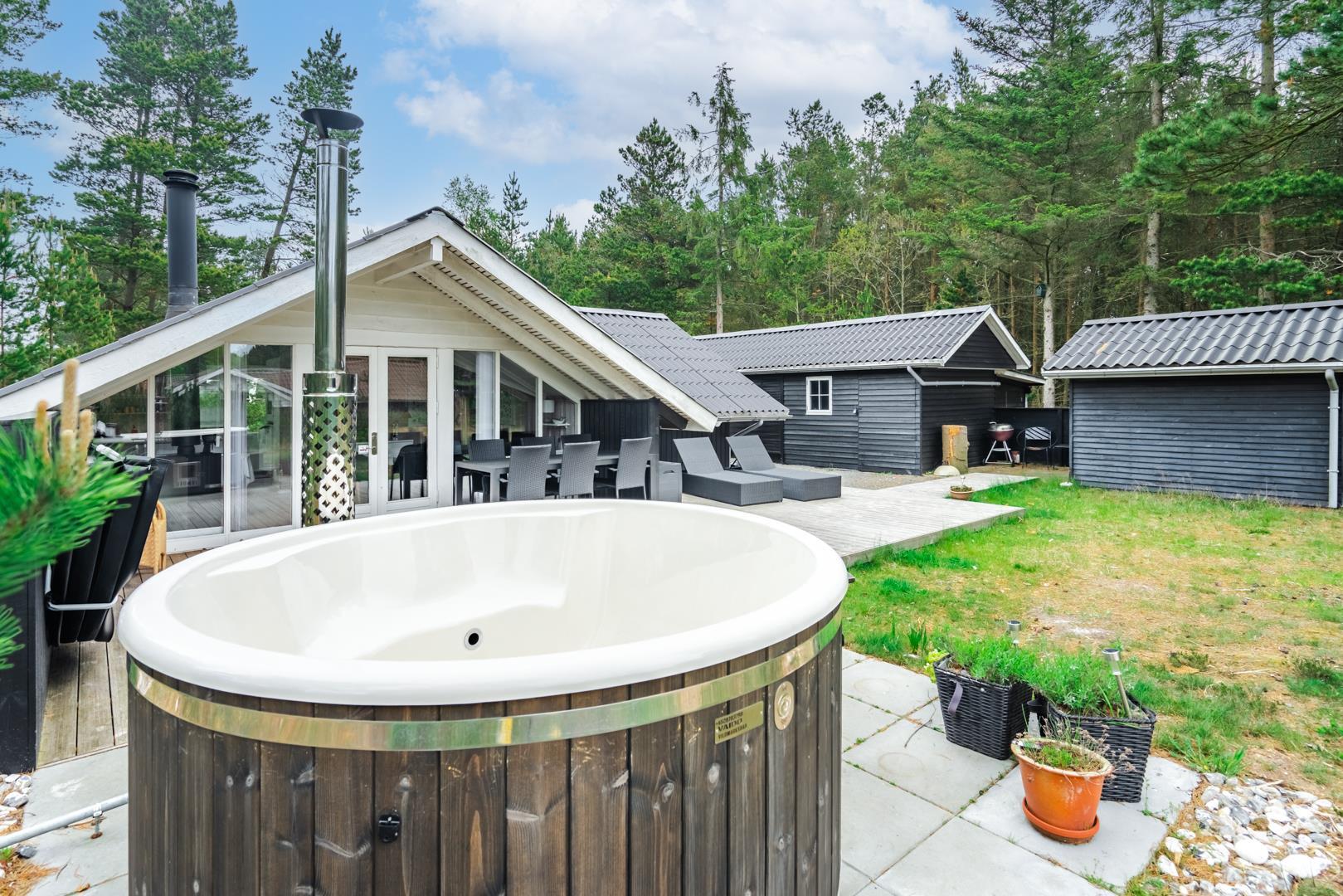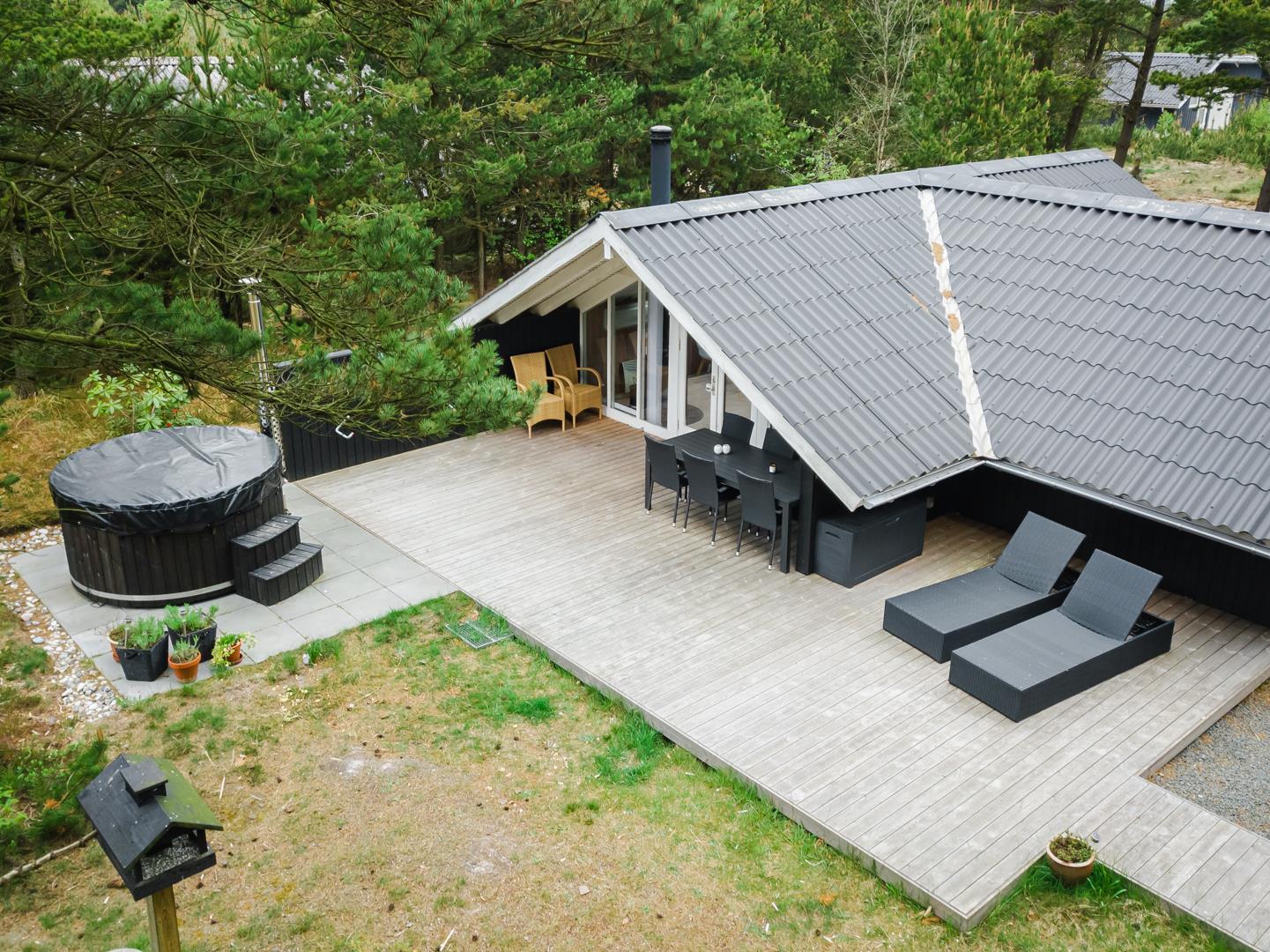 Udenfor venter et hyggeligt og velholdt udeområde, hvor I kan nyde ferien fuldt ud. Den overdækkede terrasse indbyder til morgenkaffe i solen, grillmiddage i al slags vejr og afslapning i den friske vestkystluft.