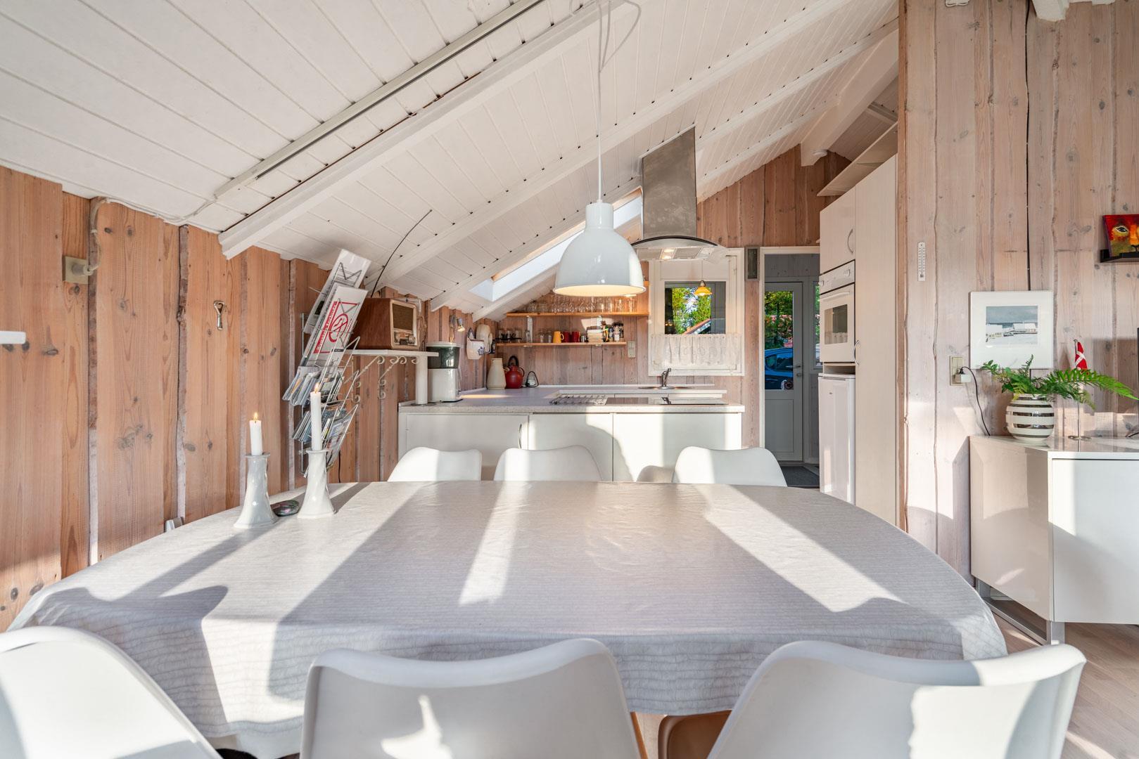 Køkkenet er moderne og fuldt udstyret med opvaskemaskine og alt, hvad der skal til for at lave fælles måltider. Spiseområdet ligger lige ved siden af og giver god plads til hele familien.