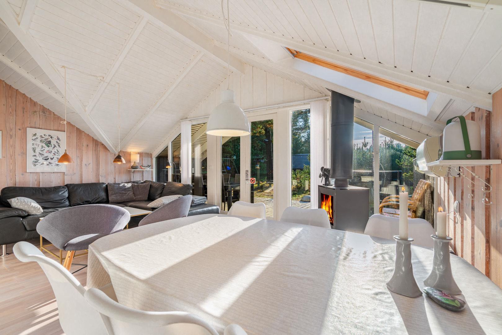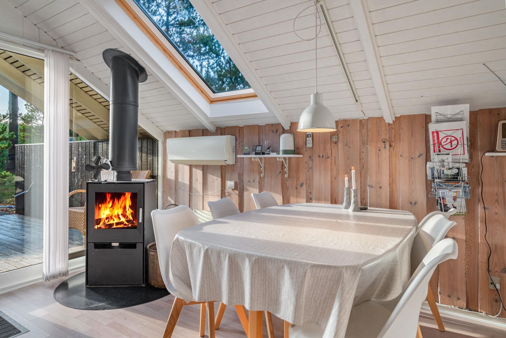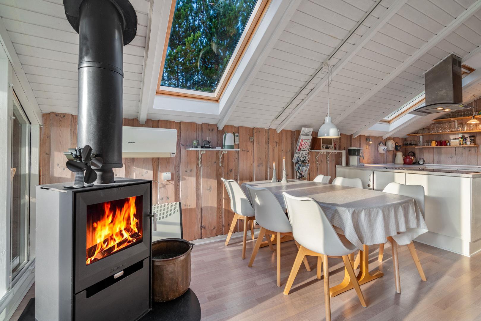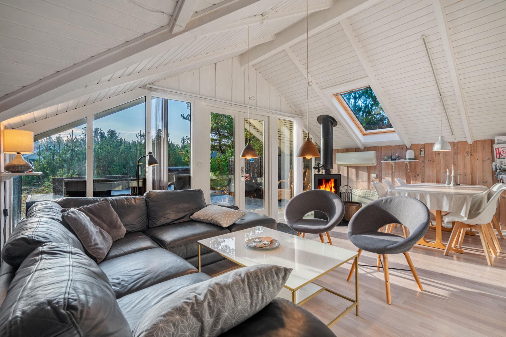 Indenfor mødes I af en lys og indbydende atmosfære, hvor ferien straks begynder at føles ægte. Den åbne stue med komfortable møbler, varme trædetaljer og en knitrende brændeovn danner rammen om afslappede aftener – med et glas vin, en god bog eller en film via Chromecast.