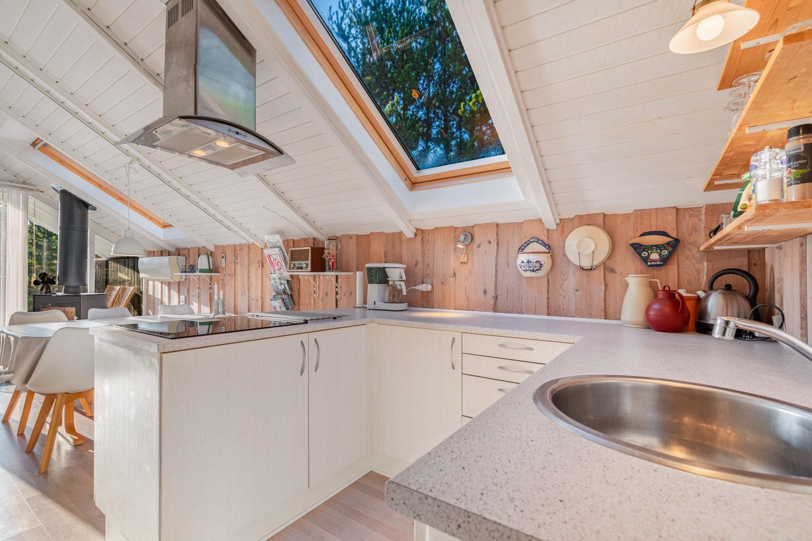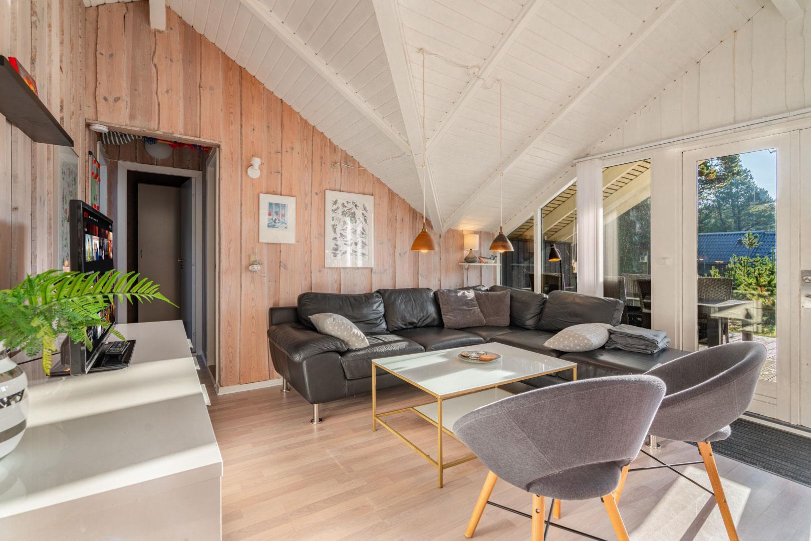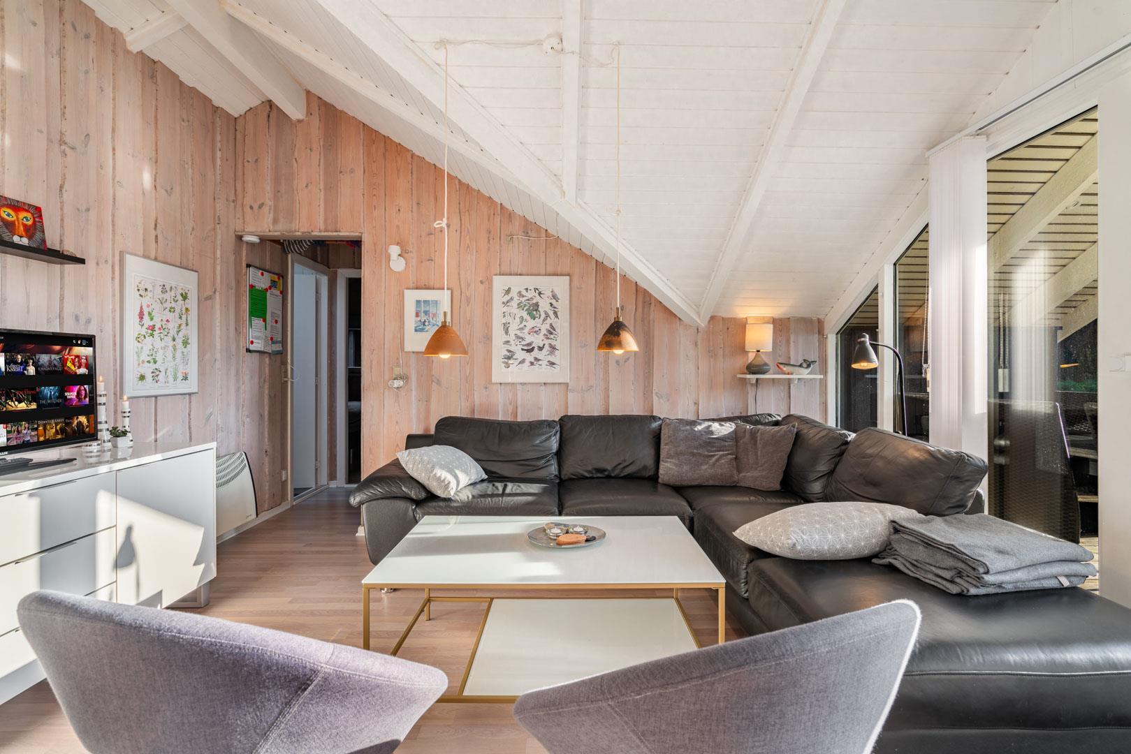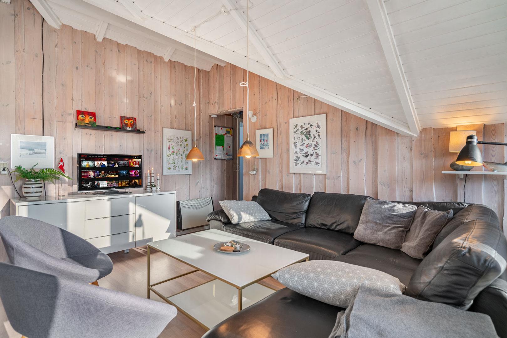 Indenfor mødes I af en lys og indbydende atmosfære, hvor ferien straks begynder at føles ægte. Den åbne stue med komfortable møbler, varme trædetaljer og en knitrende brændeovn danner rammen om afslappede aftener – med et glas vin, en god bog eller en film via Chromecast.