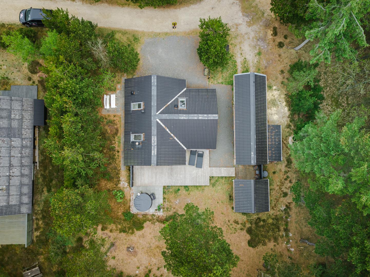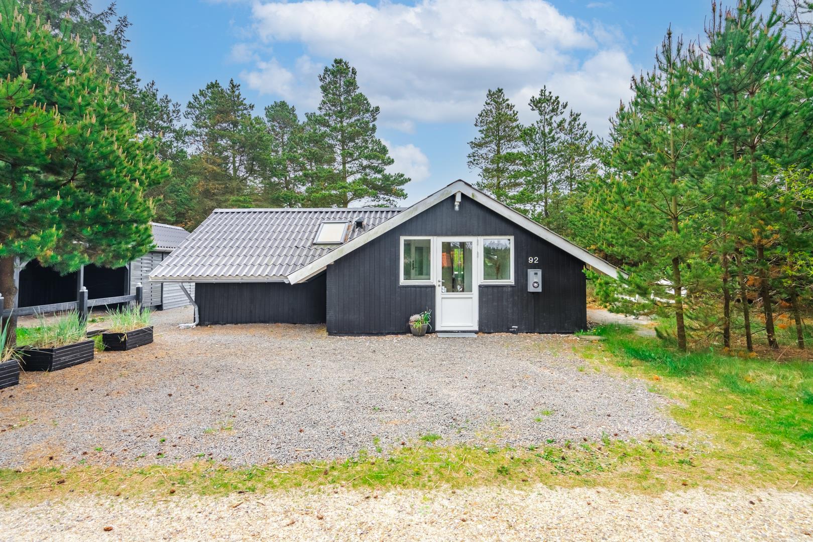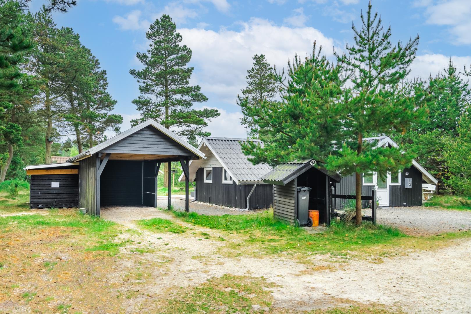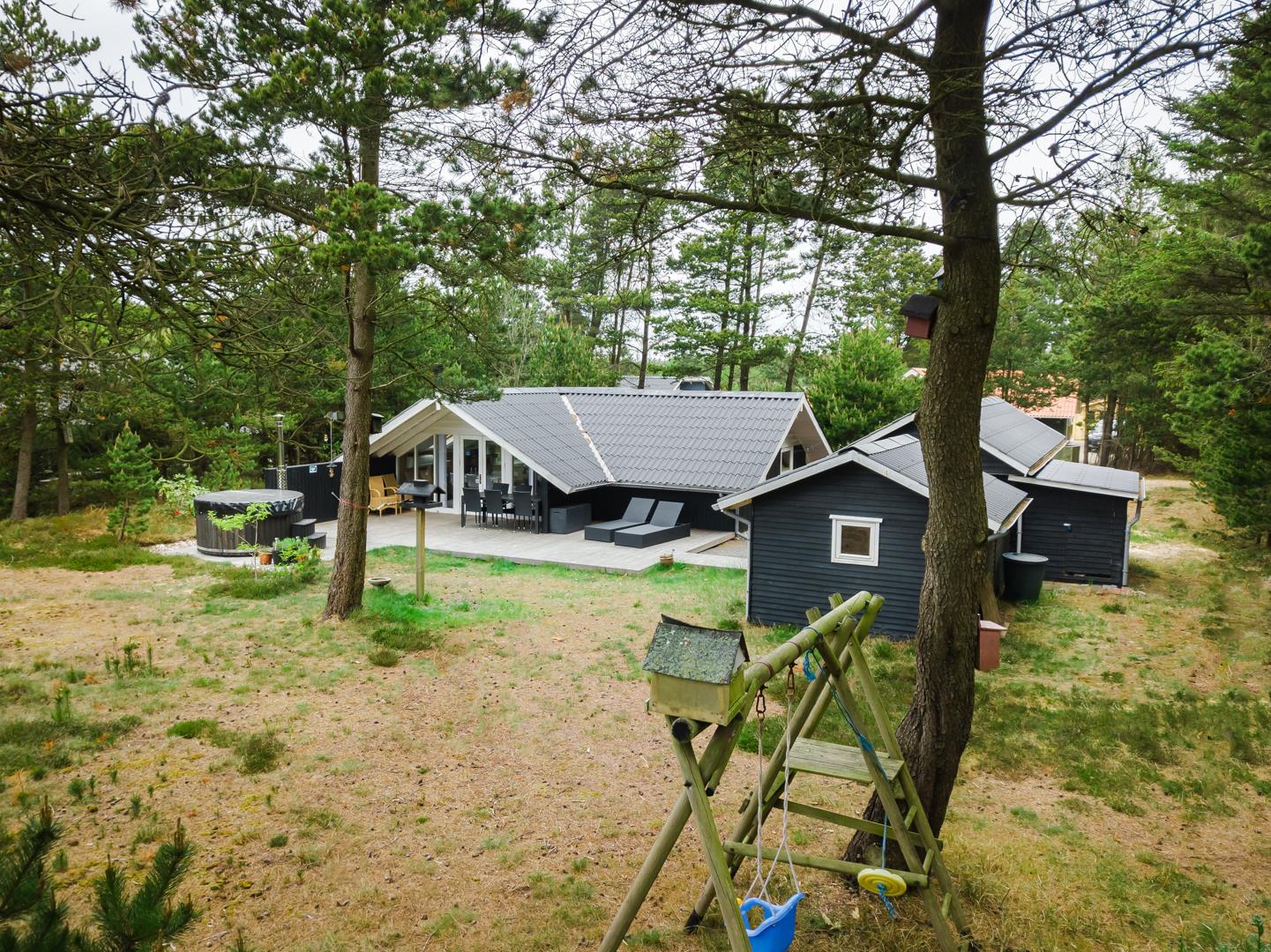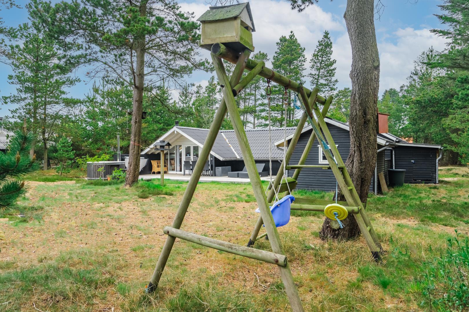 Til børnene er der en gynge, og bilen står sikkert under carporten. Udearealet er både praktisk og hyggeligt – ideelt til rolige feriedage i naturen.
