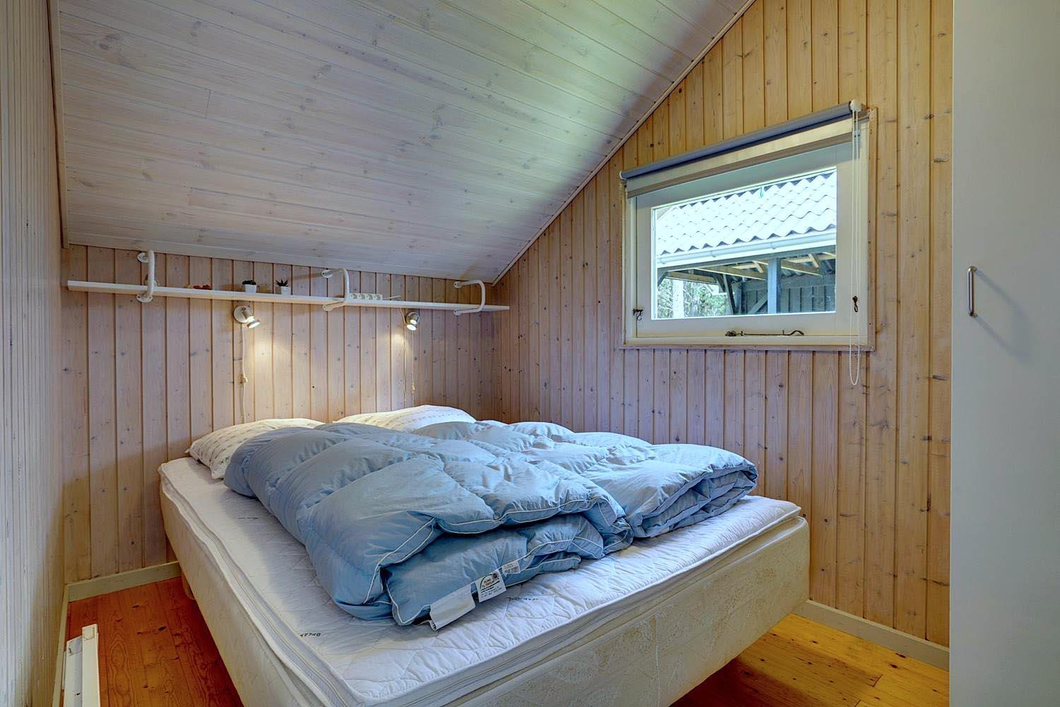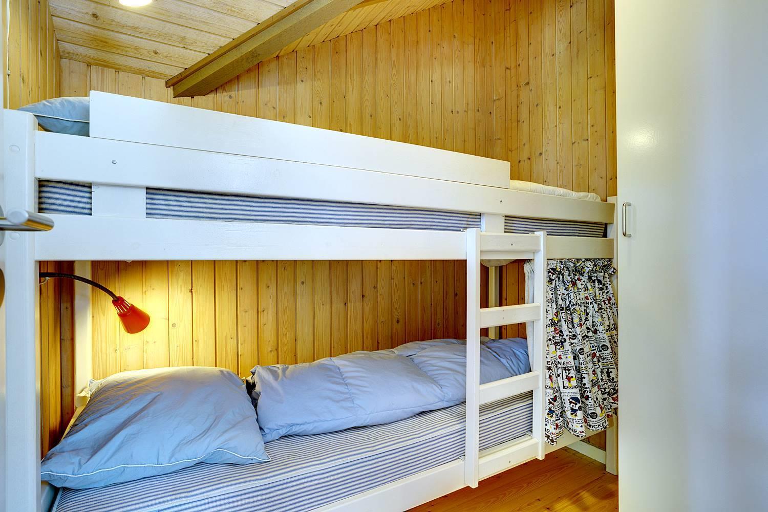 De tre soveværelser er indrettet med omtanke og giver ro til en god nats søvn: ét med dobbeltseng, ét med to enkeltsenge og ét med køjeseng – ideelt for både børn og voksne.