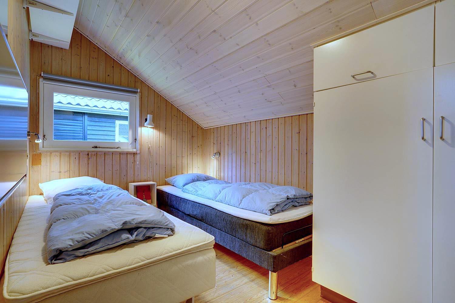 Sengestørrelse: 1 dobbeltseng (160 × 200 cm) + 2 enkeltsenge (90 × 200 cm) + 1 køjeseng (70 × 200 cm).
