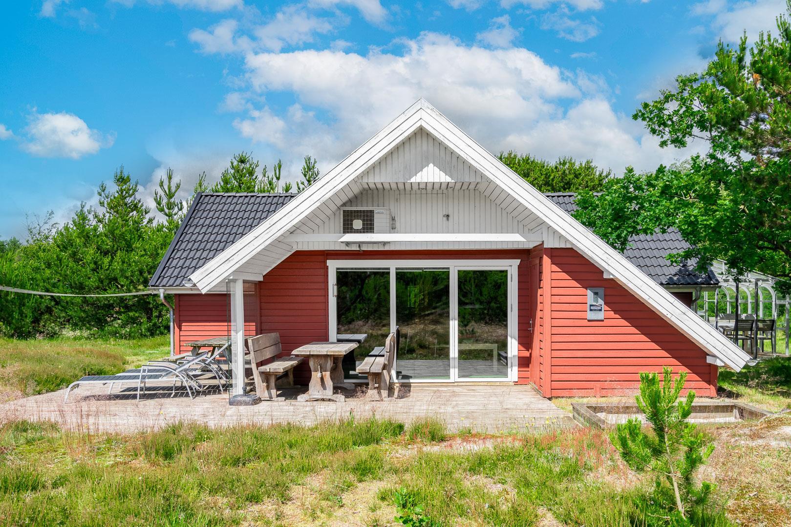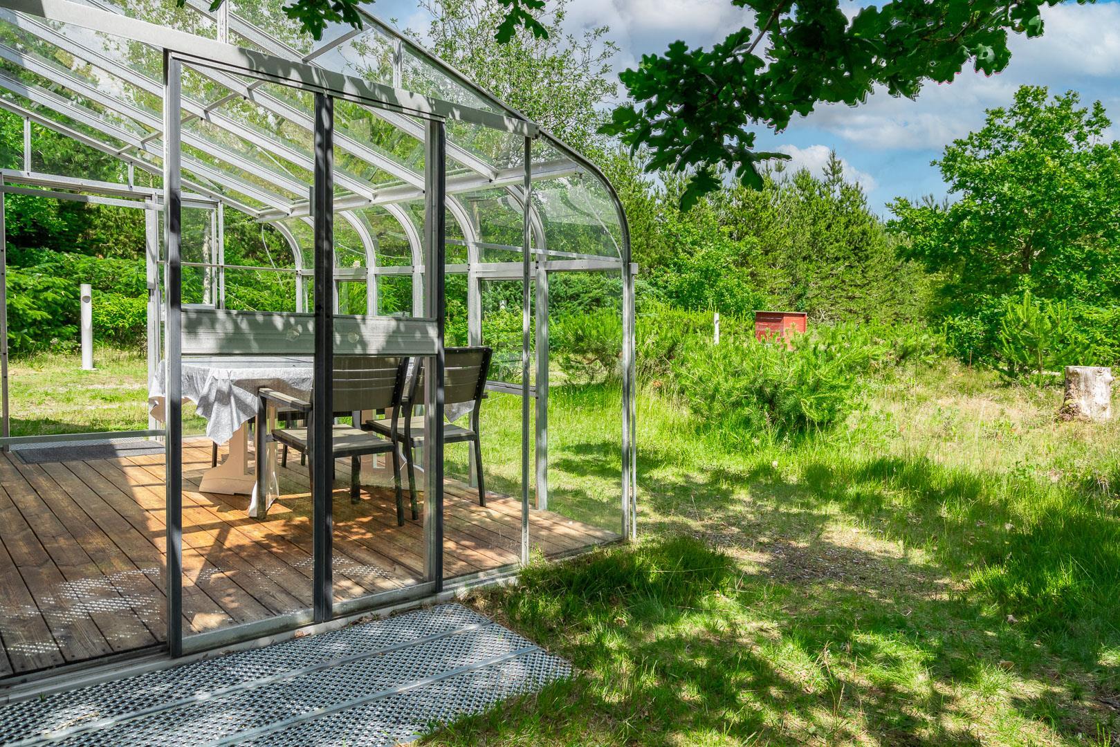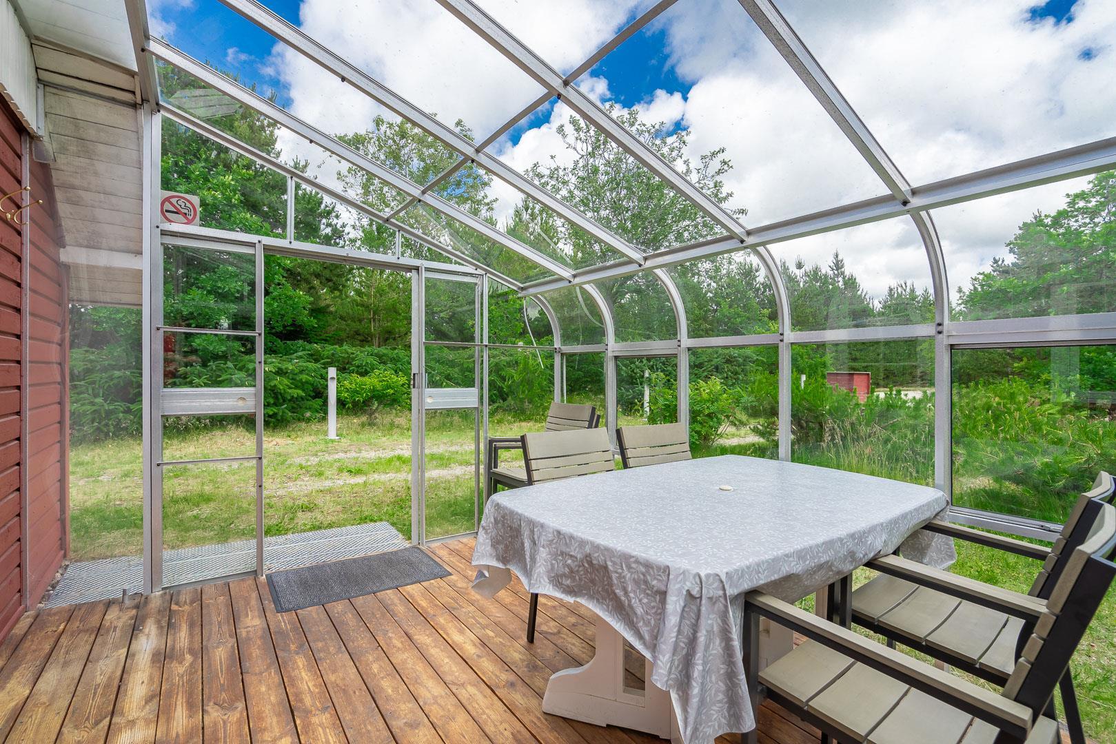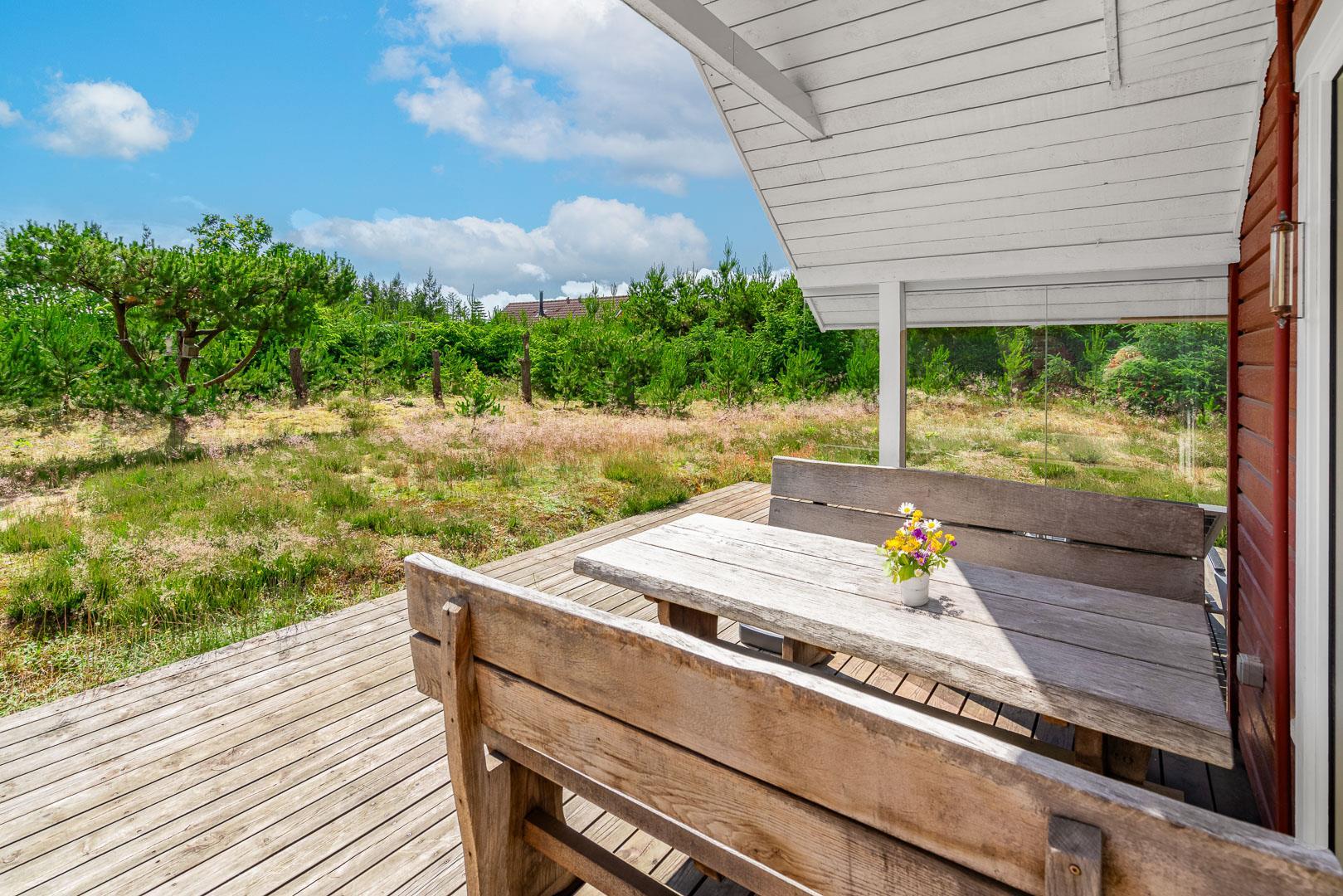 En skøn udestue med havemøbler giver ekstra opholdsplads året rundt. Huset har en centralstøvsuger og en værdiboks til opbevaring. Sommerhuset er ideelt til en afslappende ferie tæt på naturen.