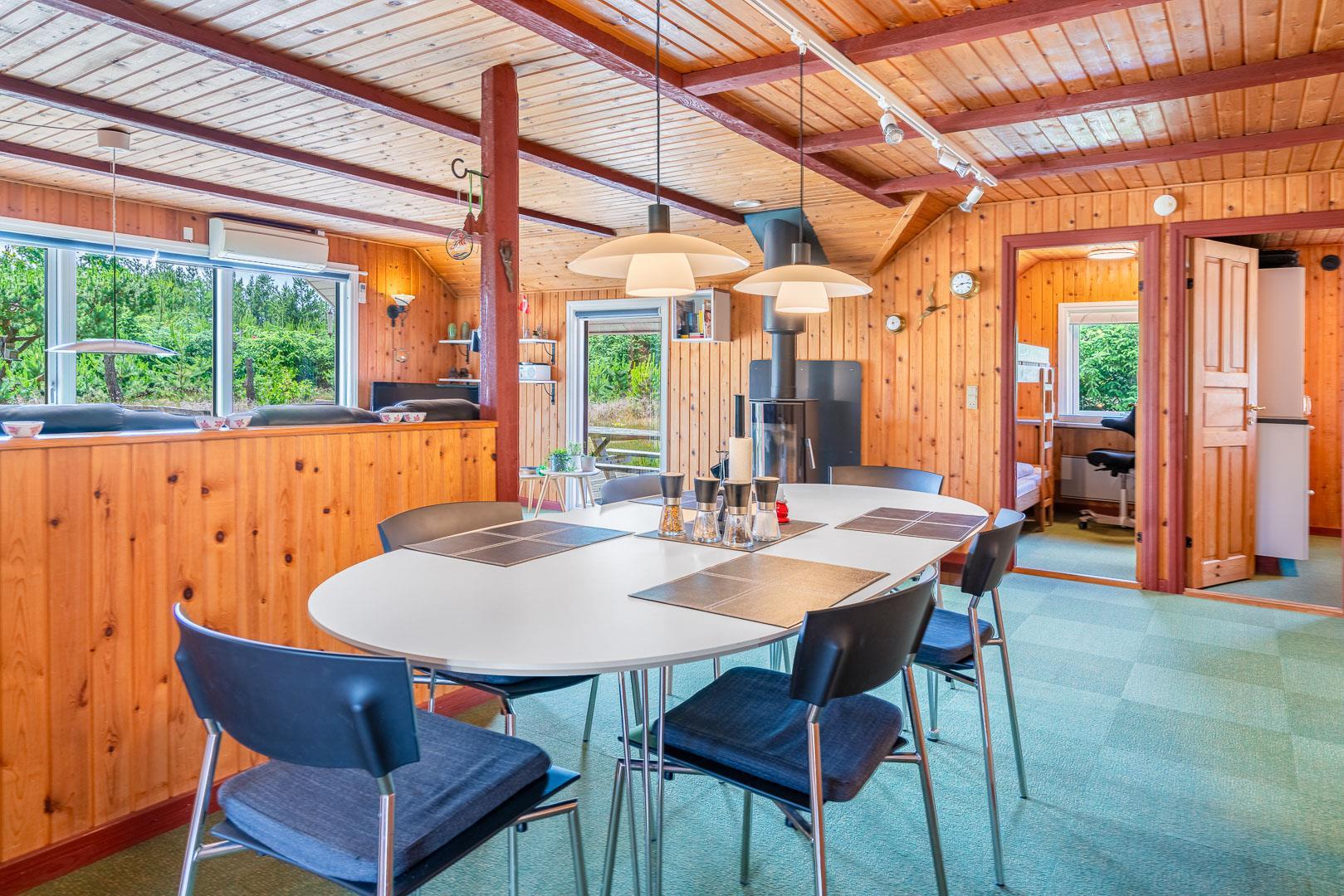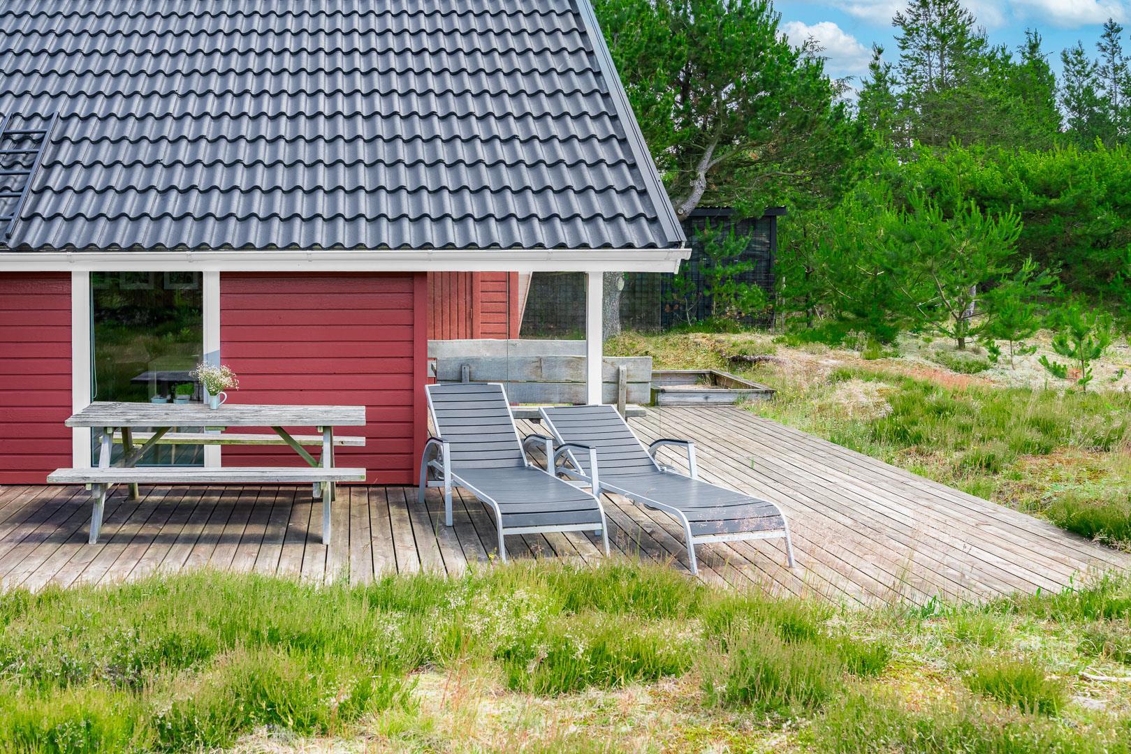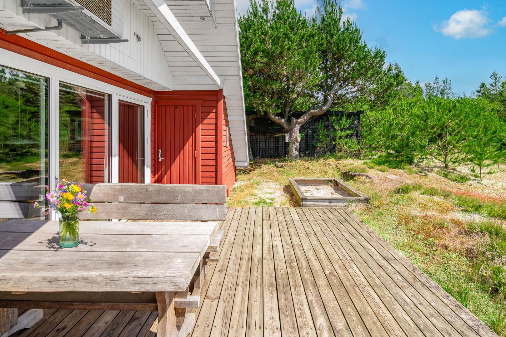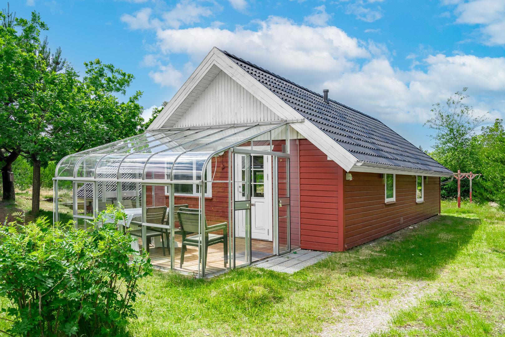 En skøn udestue med havemøbler giver ekstra opholdsplads året rundt. Huset har en centralstøvsuger og en værdiboks til opbevaring. Sommerhuset er ideelt til en afslappende ferie tæt på naturen.