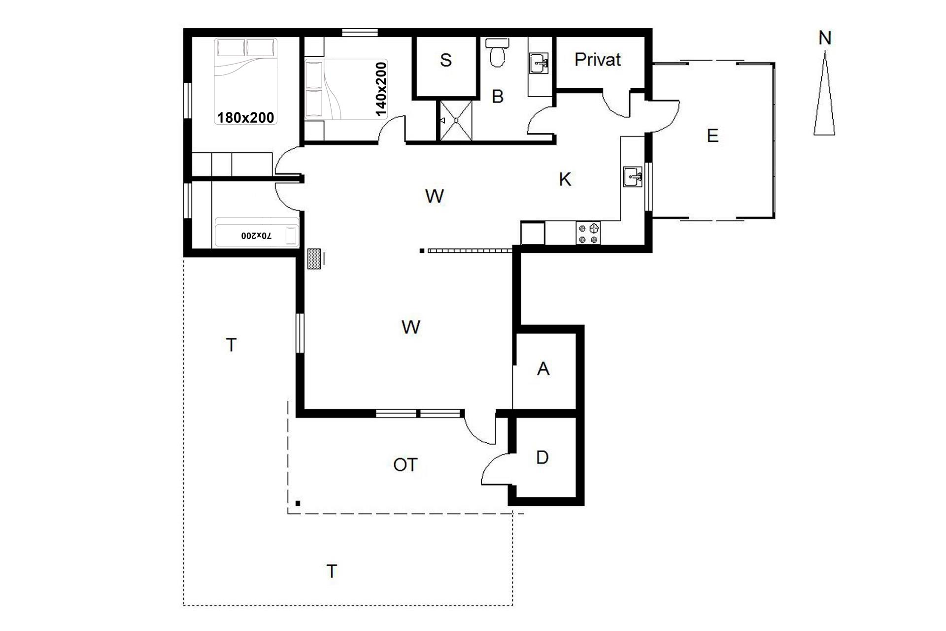 Sengestørrelse: 1 dobbeltseng 180 x 200 cm + 1 dobbeltseng 140 x 200 cm + 1 køjeseng 70 x 200 cm.