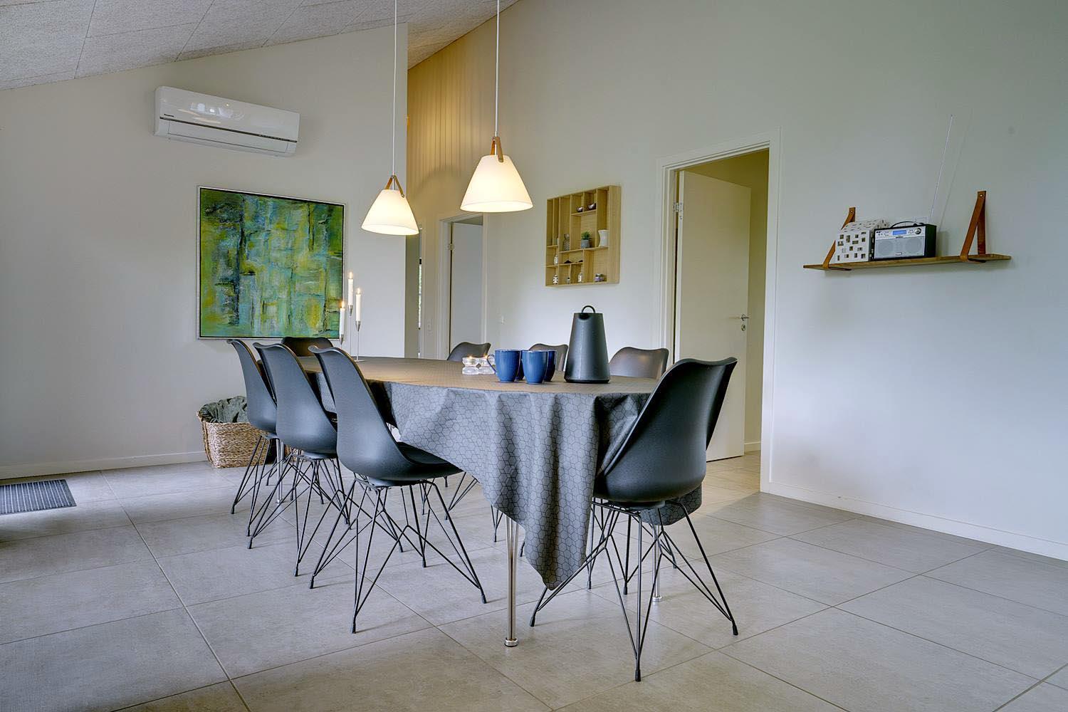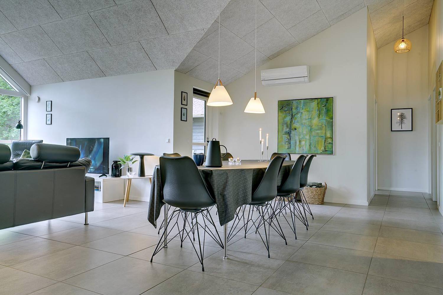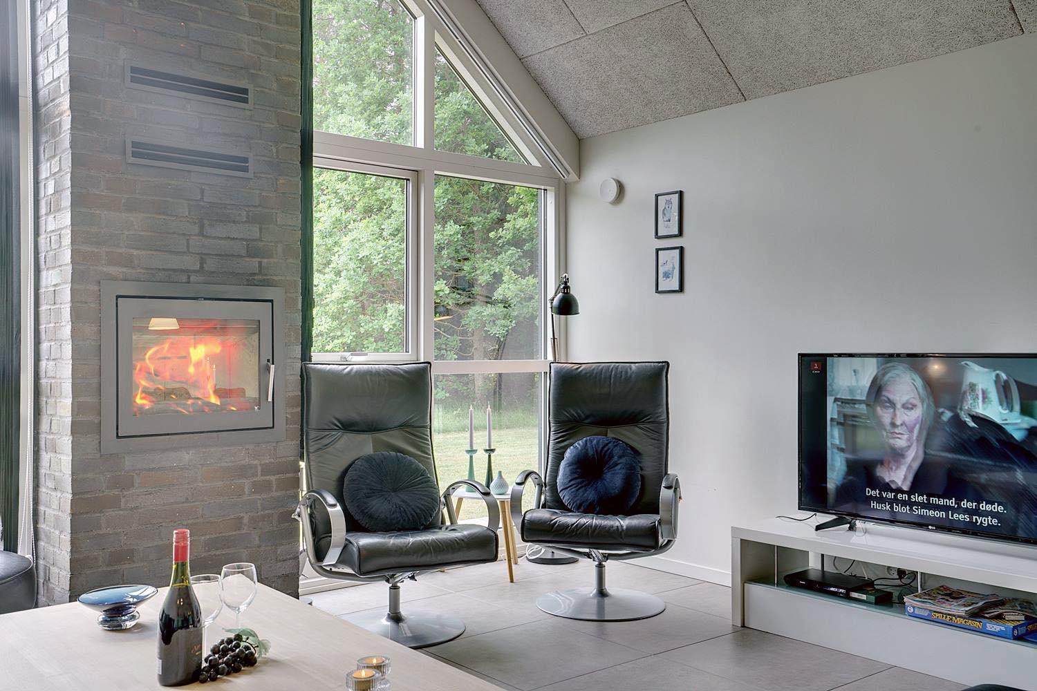 Det åbne opholdsrum udgør sommerhusets naturlige samlingspunkt. Med gulvvarme i stue, køkken og begge badeværelser er der et behageligt indeklima året rundt. Brændeovnen sørger for ekstra hygge og varme på kølige aftener – perfekt efter en dag på stranden eller en gåtur i Houstrups skove.