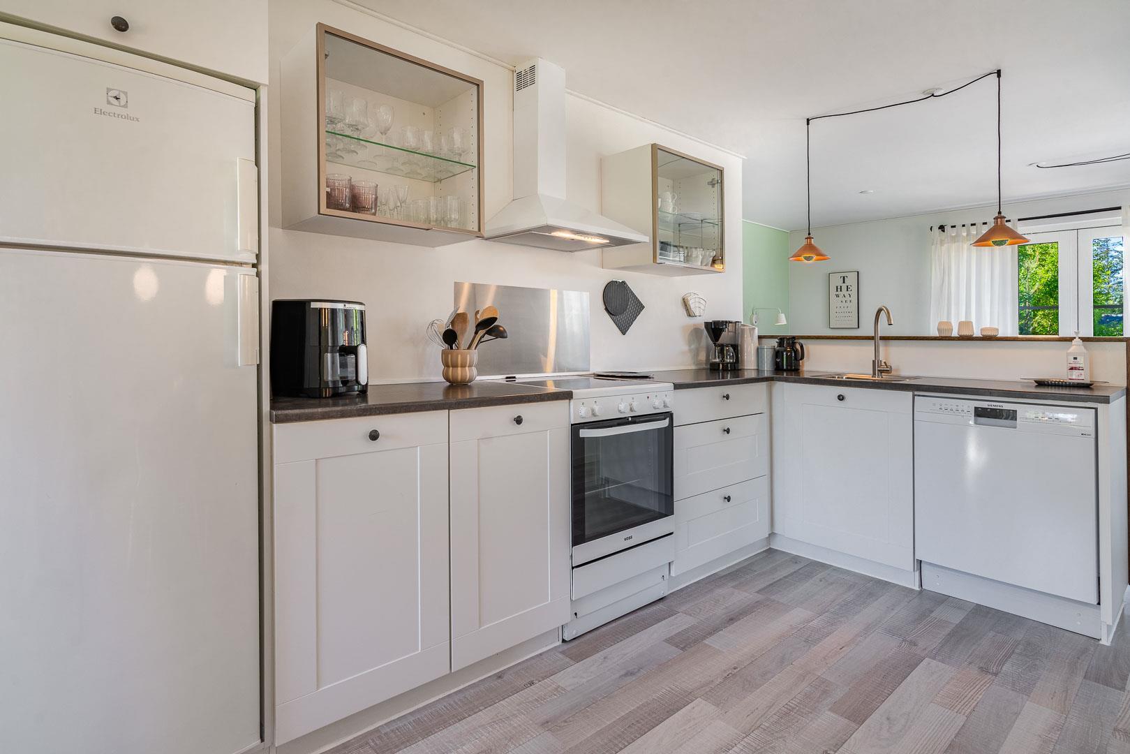 Det åbne køkken er moderne og veludstyret med opvaskemaskine og separat fryser, og hænger sammen med den lyse og hyggelige stue, hvor brændeovnen spreder varme og stemning. Her er også Chromecast-tv, gratis WiFi og en energivenlig varmepumpe, som sikrer godt klima året rundt. Der er selvfølgelig også vaskemaskine og tørretumbler, hvis behovet skulle opstå under ferien.