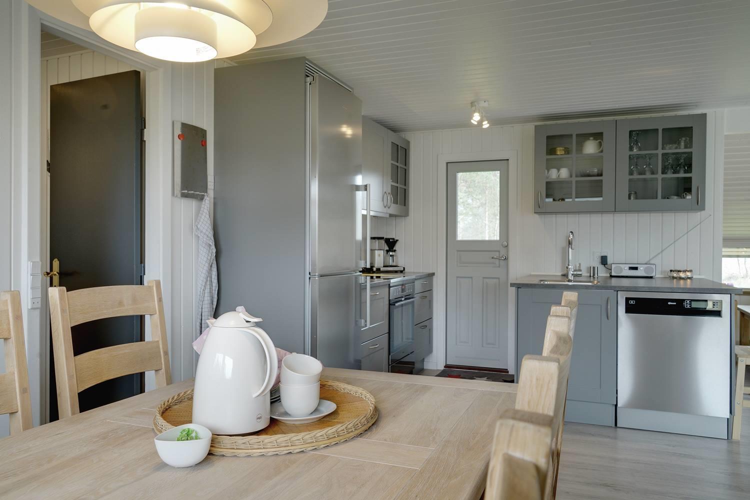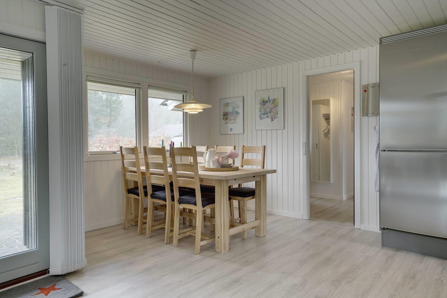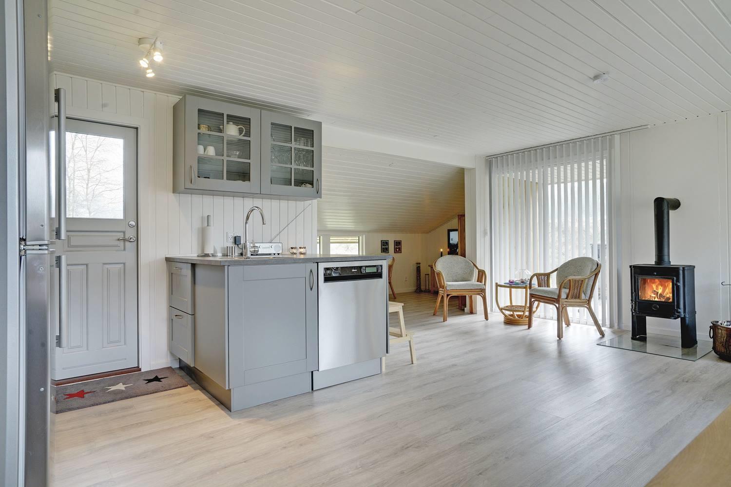 Huset byder på et lyst og moderne køkken med induktionskogeplader, hvor madlavningen bliver en leg. Den hyggelige stue er indrettet med brændeovn og varmepumpe, som sikrer varme og hygge året rundt. Med tre gode soverum, hvoraf to har dobbeltsenge, er der god plads til hele familien. Badeværelset er praktisk indrettet med vaskemaskine og dejlig gulvvarme.