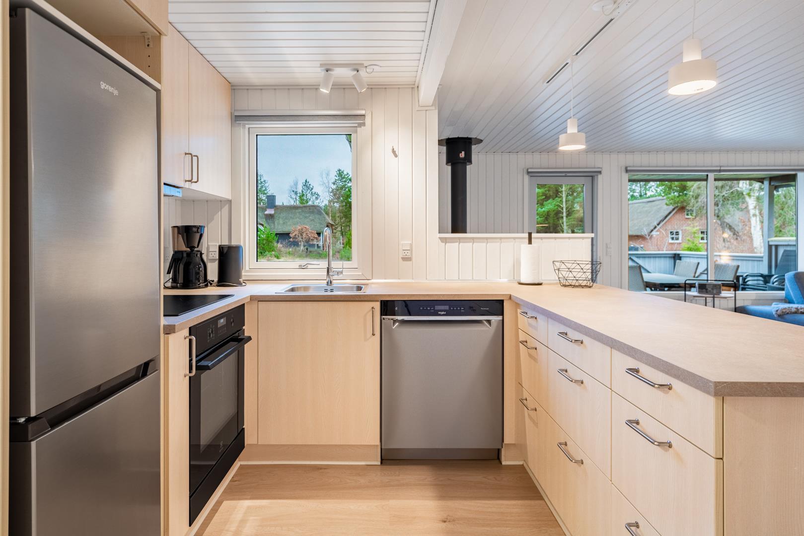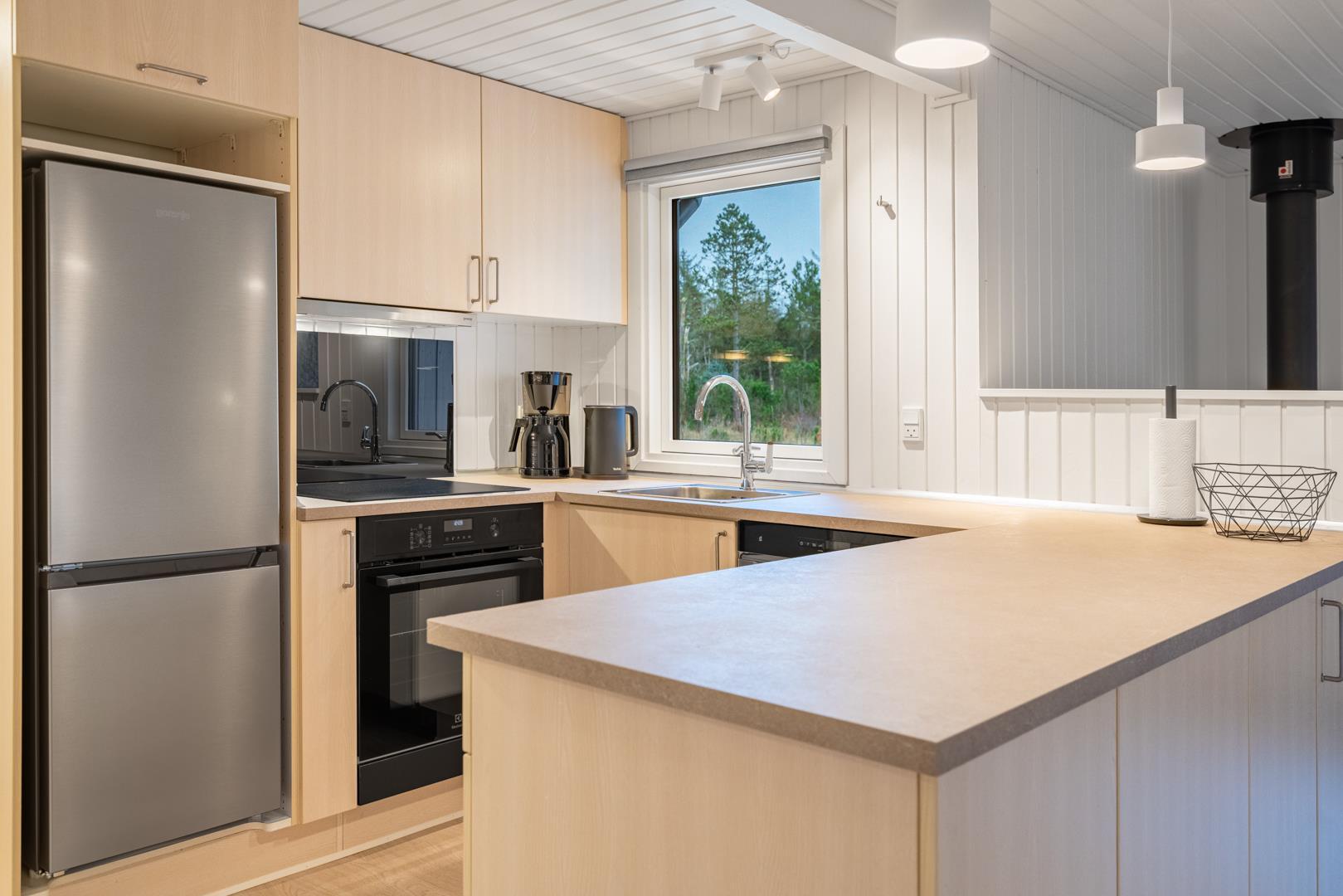 Det åbne og veludstyrede køkken med induktions-kogeplade ligger i direkte forbindelse med stuen, så madlavning og samvær går hånd i hånd. Opvaskemaskinen klarer det praktiske, så I kan nyde tiden sammen.