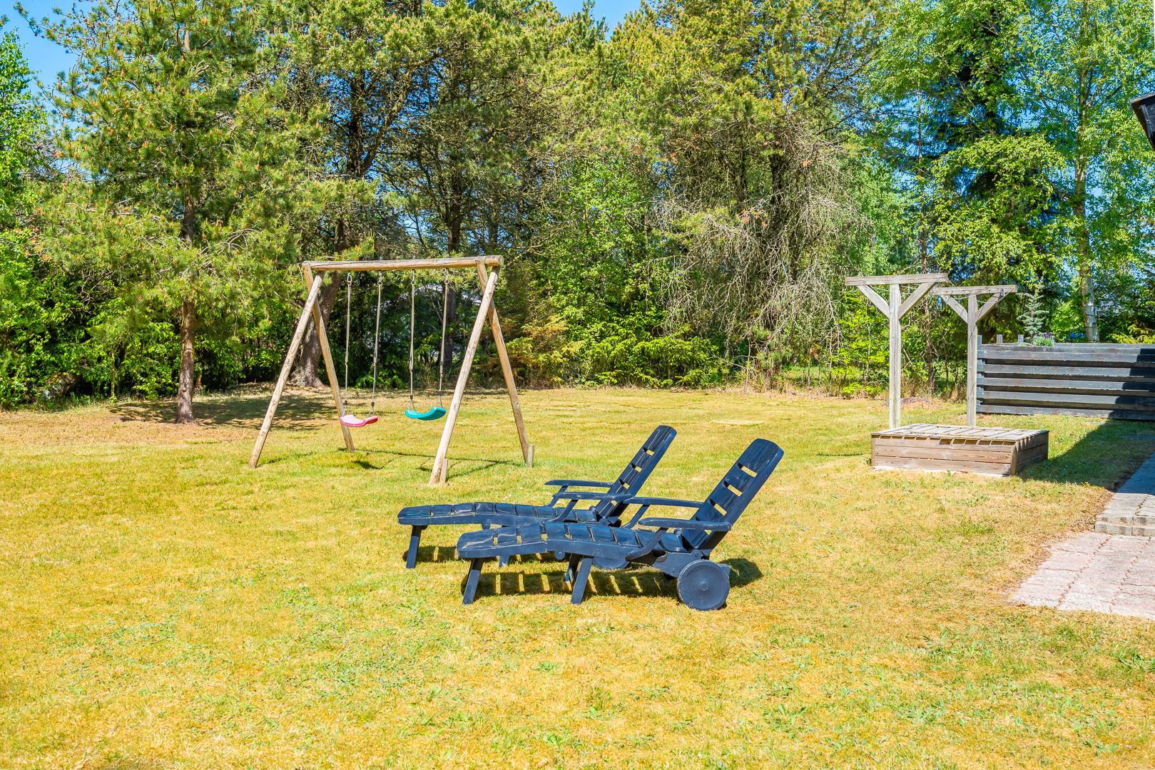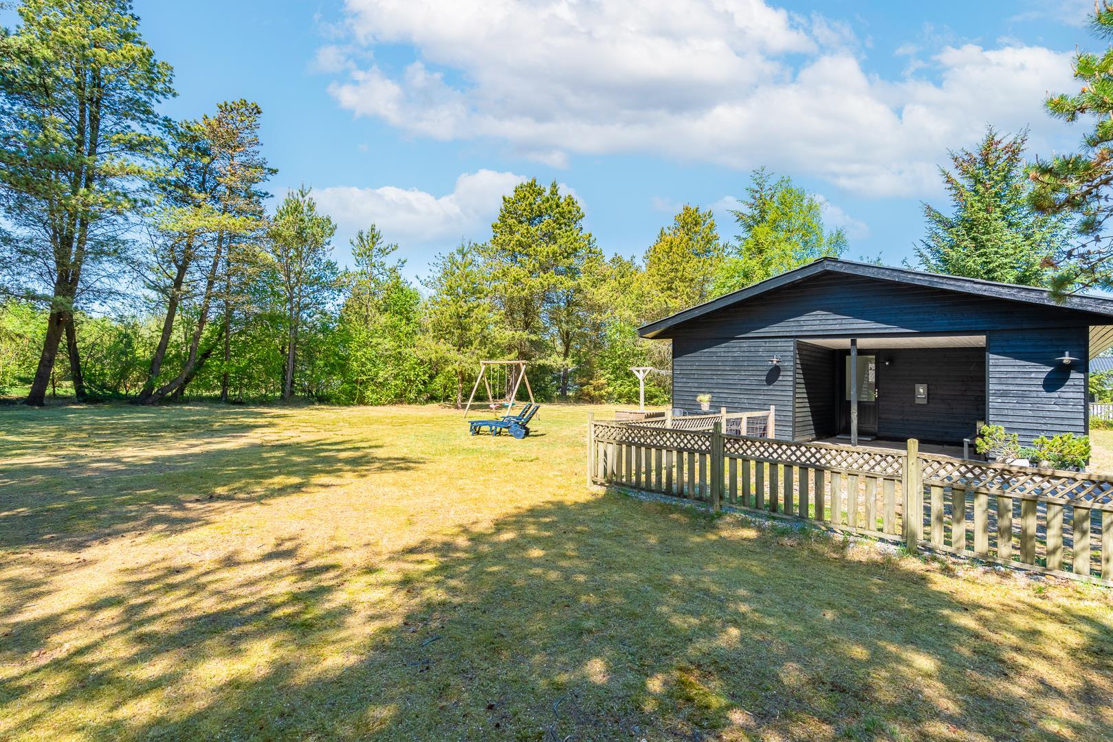 En stor fordel ved dette sommerhus i Houstrup er den helt indhegnede grund – ideel for børnefamilier. Her kan børnene trygt lege på gyngen eller i sandkassen, mens de voksne nyder solen og den friske havluft på terrassen.
