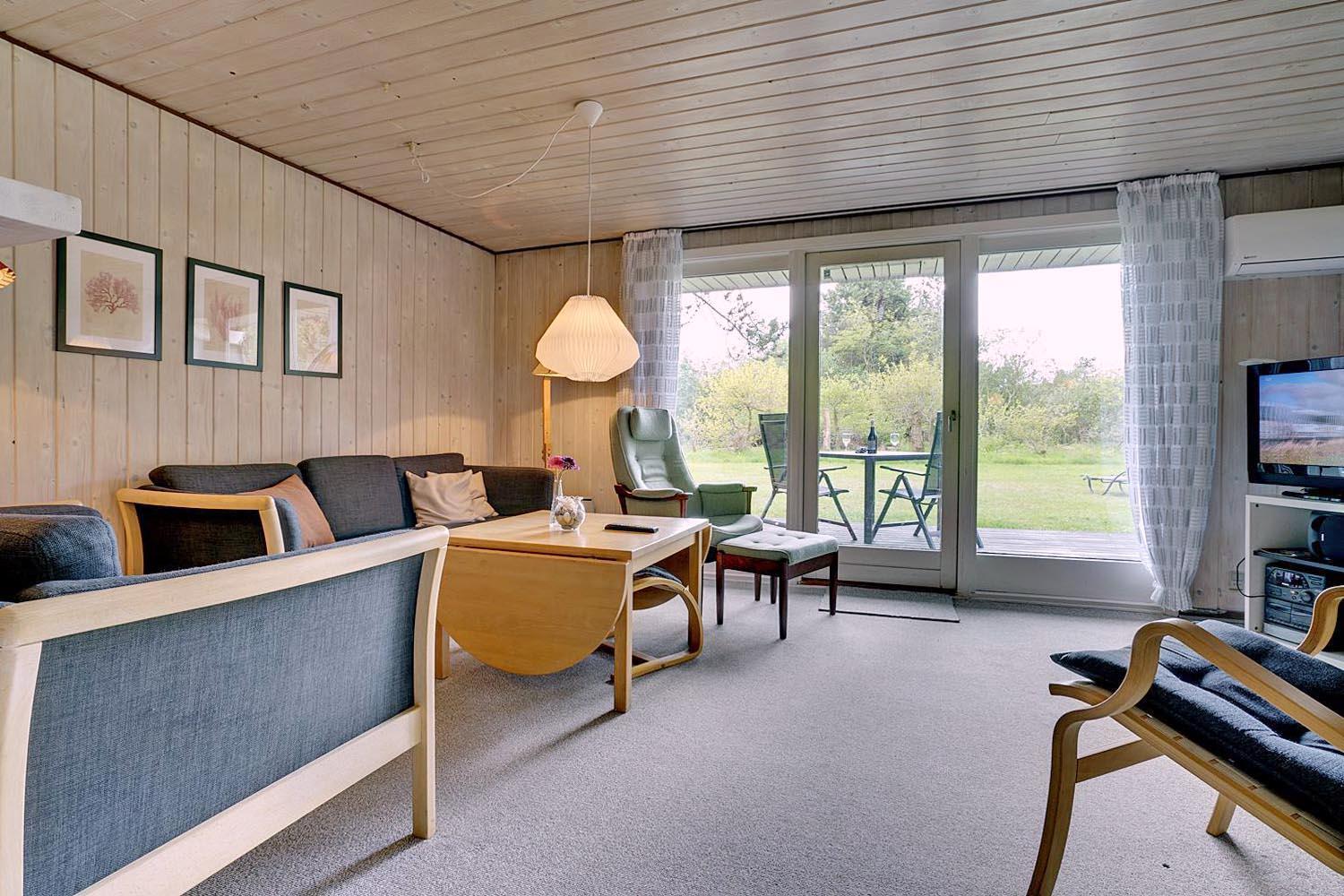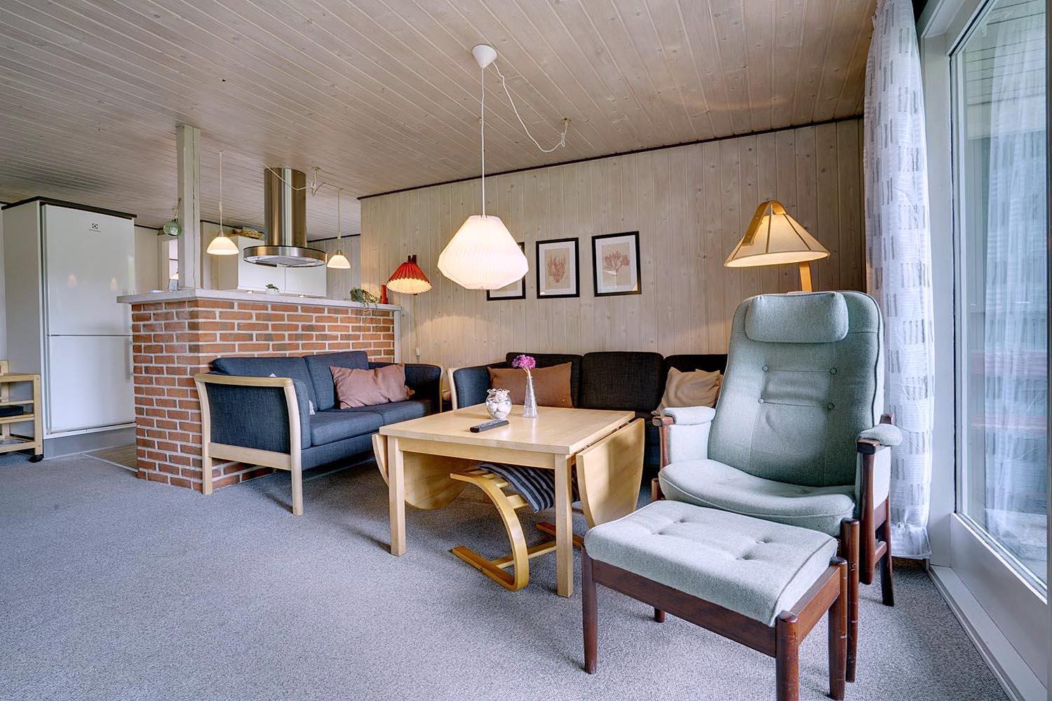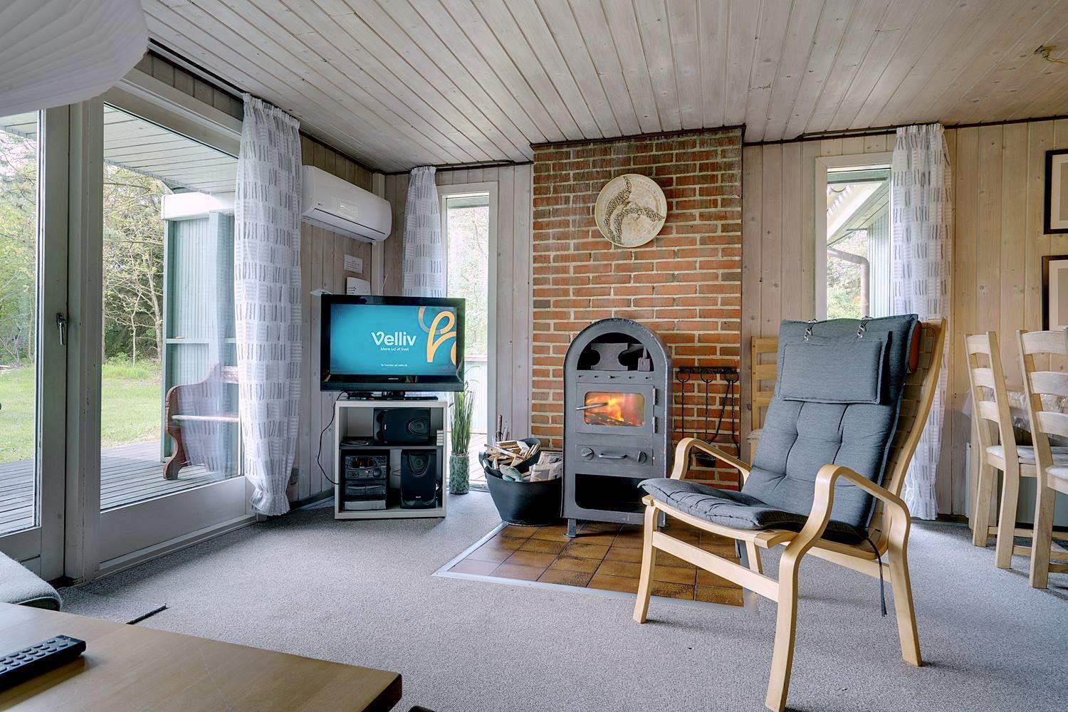 Opholdsstuen har gode møbler, brændeovn og varmepumpe, som sikrer et behageligt indeklima året rundt. Spisepladsen er placeret centralt i huset i åben forbindelse med både stue og køkken. Til de små gæster findes højstol, barneseng og gynge. Derudover er der både vaskemaskine og carport til rådighed. Et sommerhus med alt, hvad du behøver for en afslappende ferie.