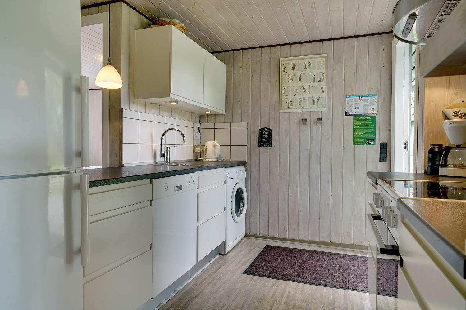 Badeværelset fremstår lyst og rummeligt med loft til kip, synlige spær og ovenlysvindue. Her er adgang til husets sauna, hvor du kan nyde afslapning efter en dag i naturen. Køkkenet er veludstyret med keramisk komfur, opvaskemaskine, mikroovn og køle-/fryseskab – alt, hvad der skal til for en komfortabel ferie.