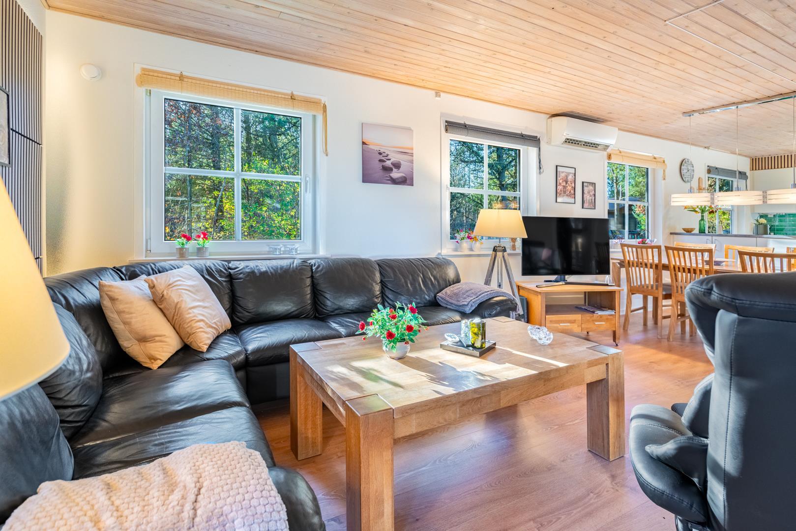 Udenfor finder I et dejligt, fredeligt naturgrund med høje træer og masser af plads omkring jer. Den store terrasse indbyder til morgenkaffe i solen, rolige stunder i liggestolen eller hyggelige aftener med udsigt til naturen.