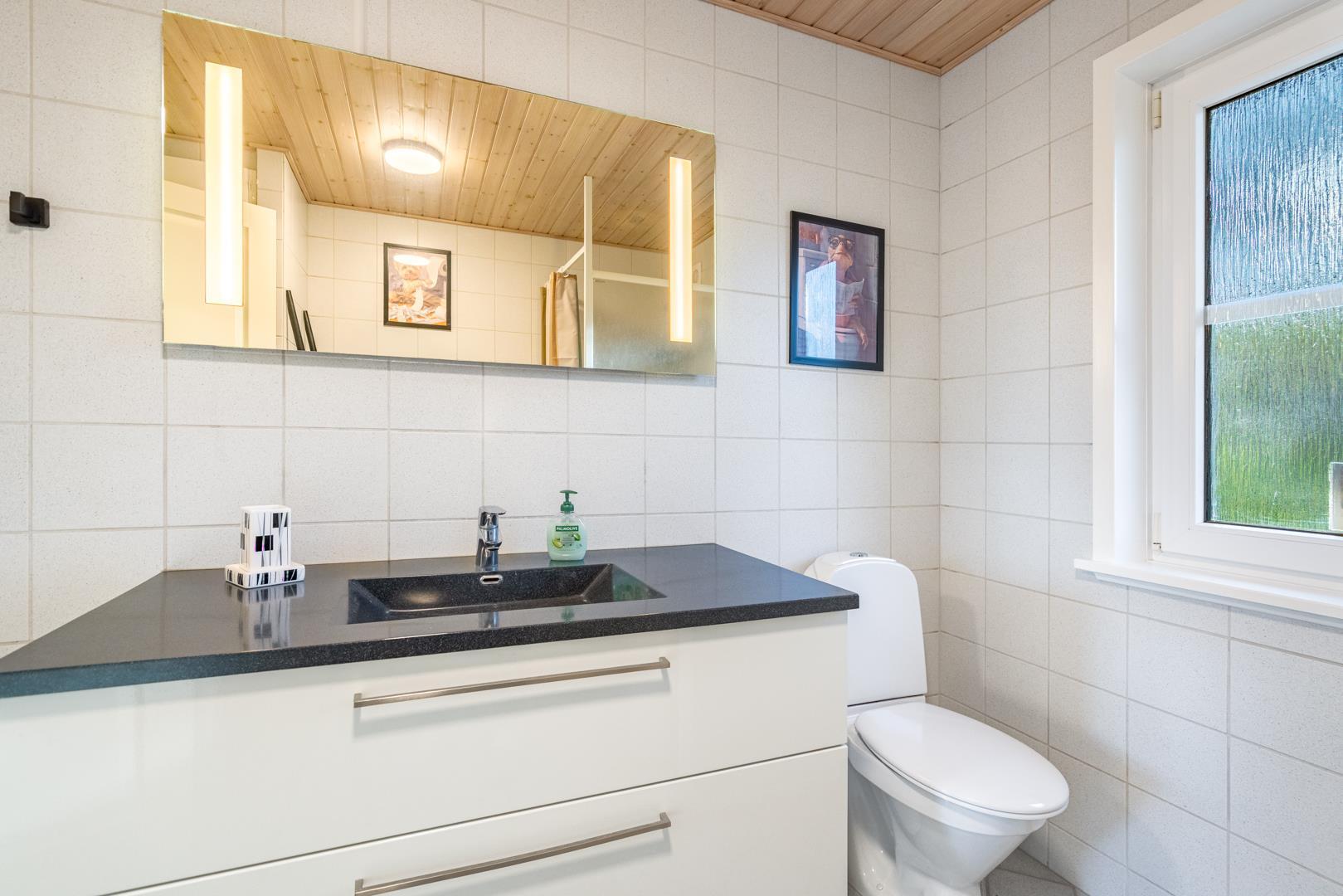 Badeværelset er et ekstra plus med moderne indretning og behagelig gulvvarme – skønt efter en lang dag ved stranden eller i skoven.