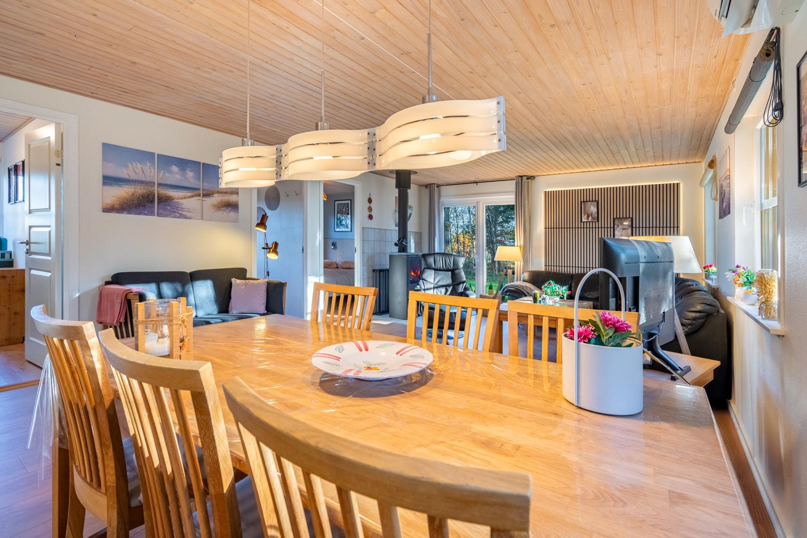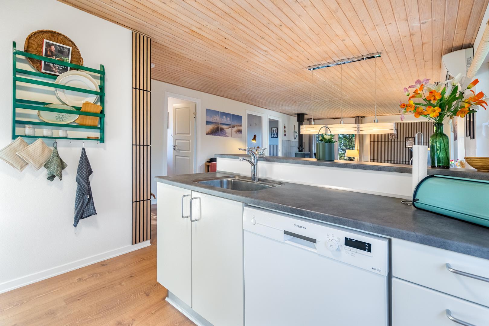 Det åbne køkken-alrum er sommerhusets naturlige samlingspunkt. Her er god plads til fælles måltider, spil, film eller afslapning i sofaen. Brændeovnen sørger for ekstra hygge på kølige dage, hvor vinden rusker i klitterne ved Vesterhavet og en varmepumpe bidrager til et behageligt indeklima året rundt.