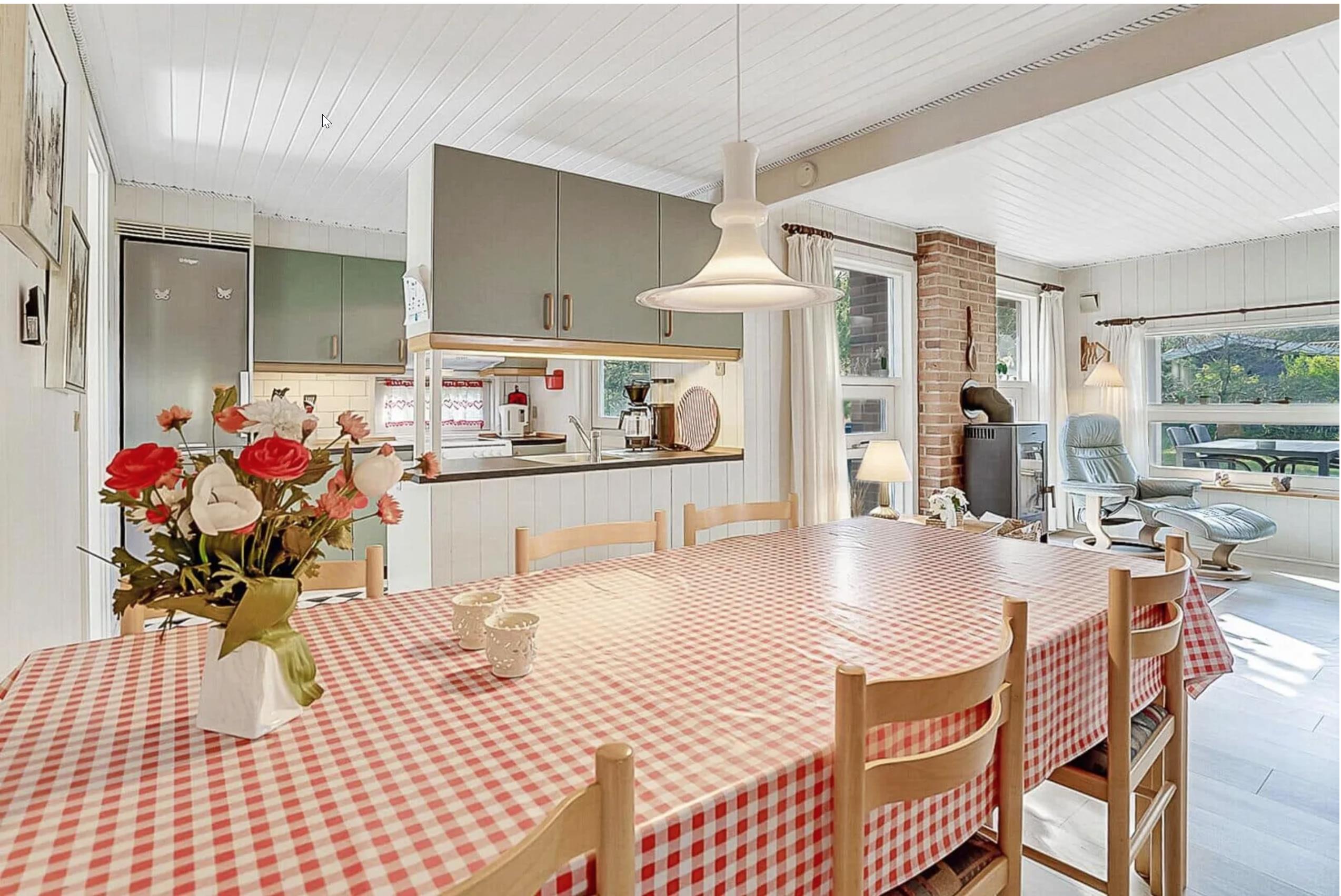 Køkkenet er veludstyret med alt, hvad I behøver til madlavningen – herunder opvaskemaskine. Ved spisebordet kan I samle familien til hyggelige måltider, brætspil eller lange samtaler over et glas vin.