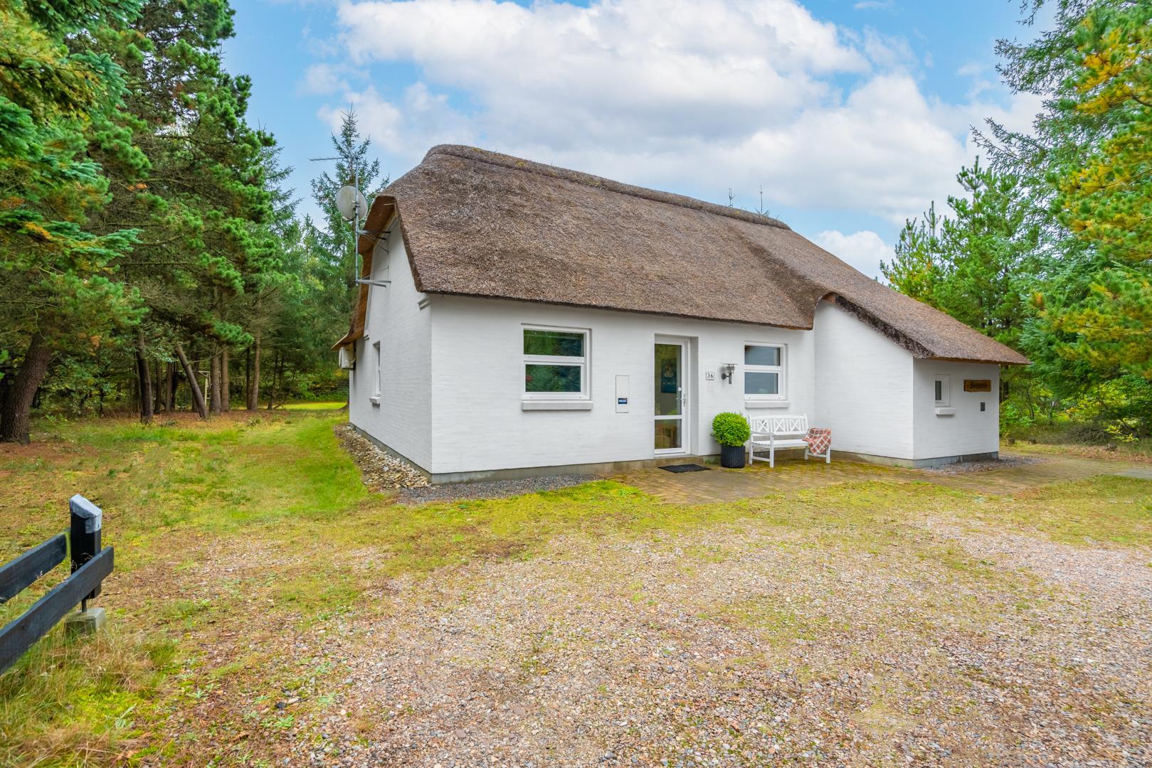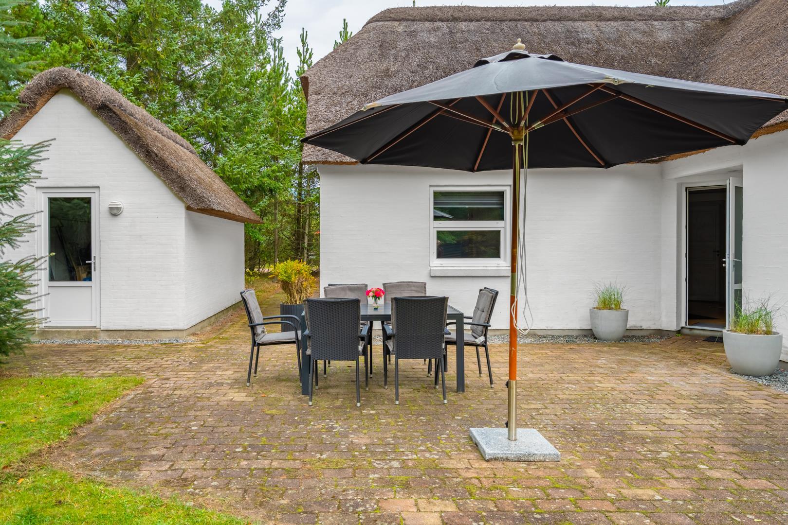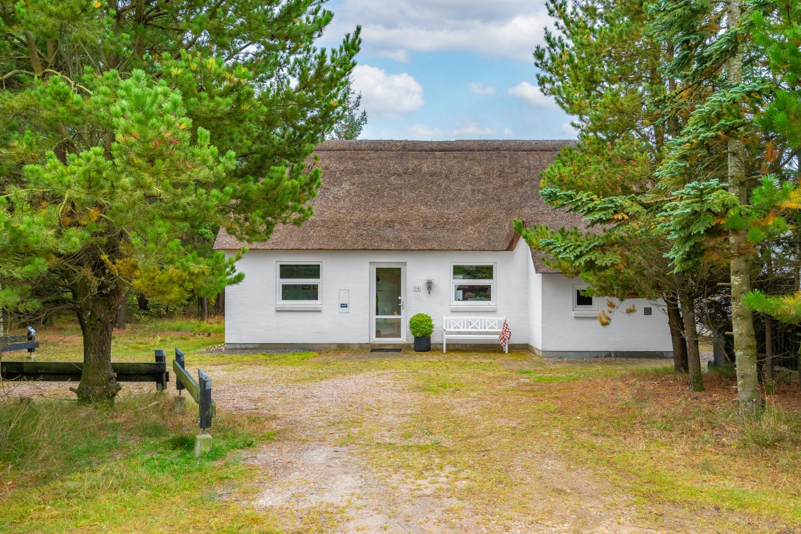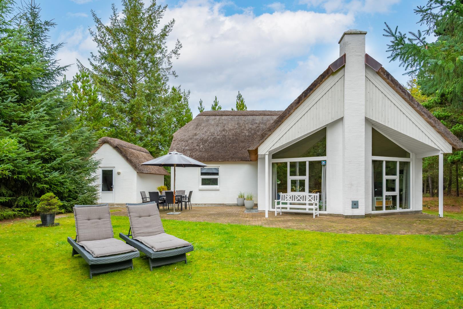 Sommerhuset ligger på en stor naturgrund i rolige omgivelser omgivet af høje træer, duftende fyr og lyng.