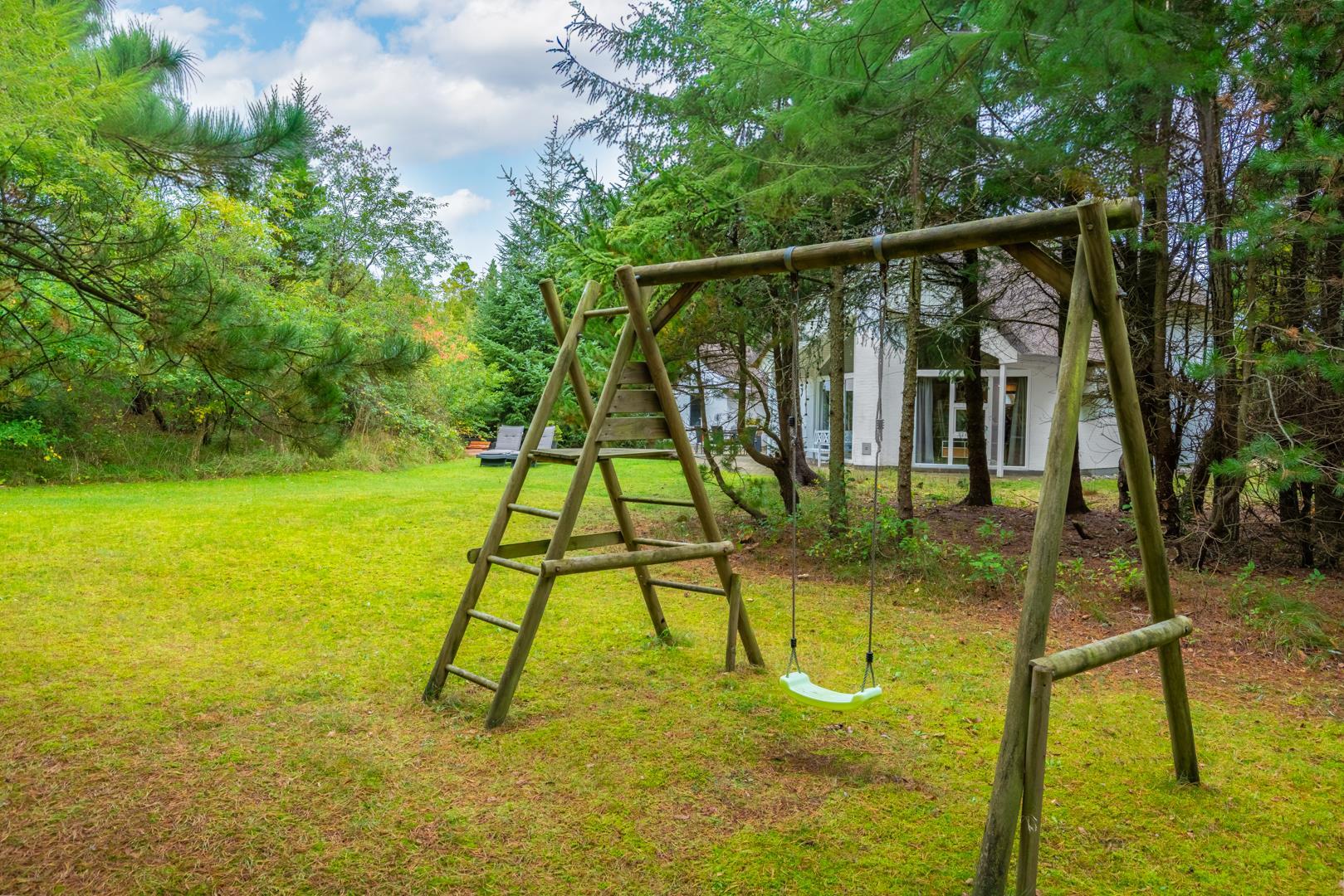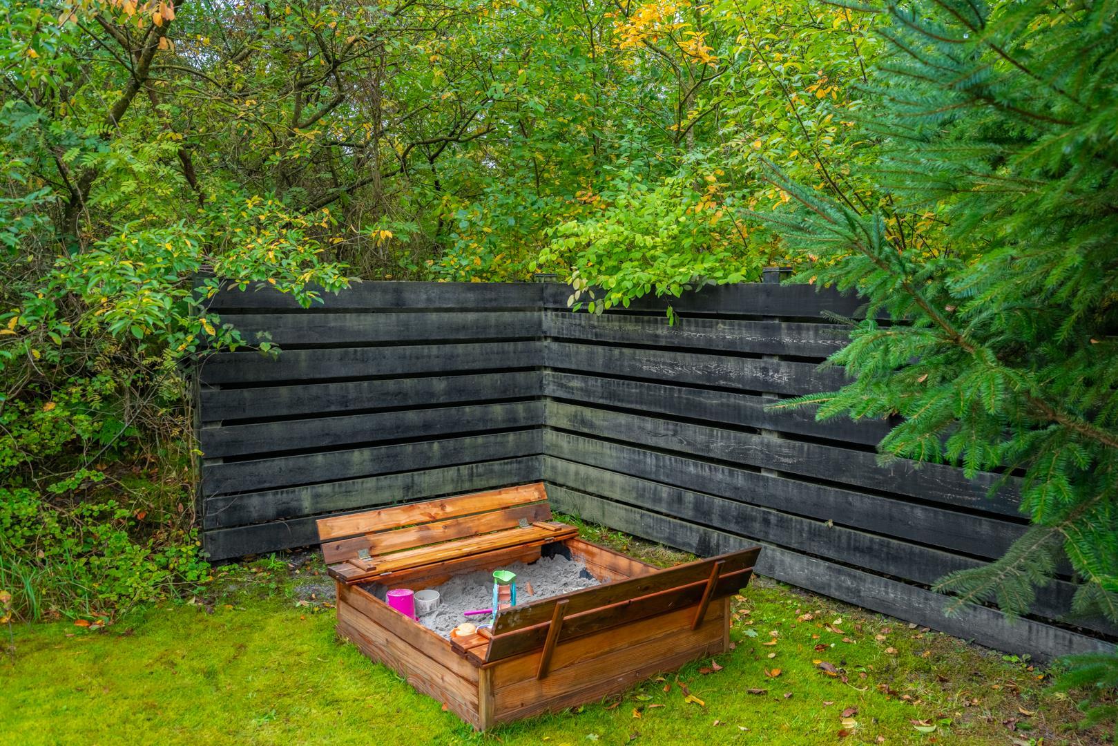 Børnene kan more sig i sandkassen eller på gyngen, mens hunden kan løbe frit omkring på grunden.