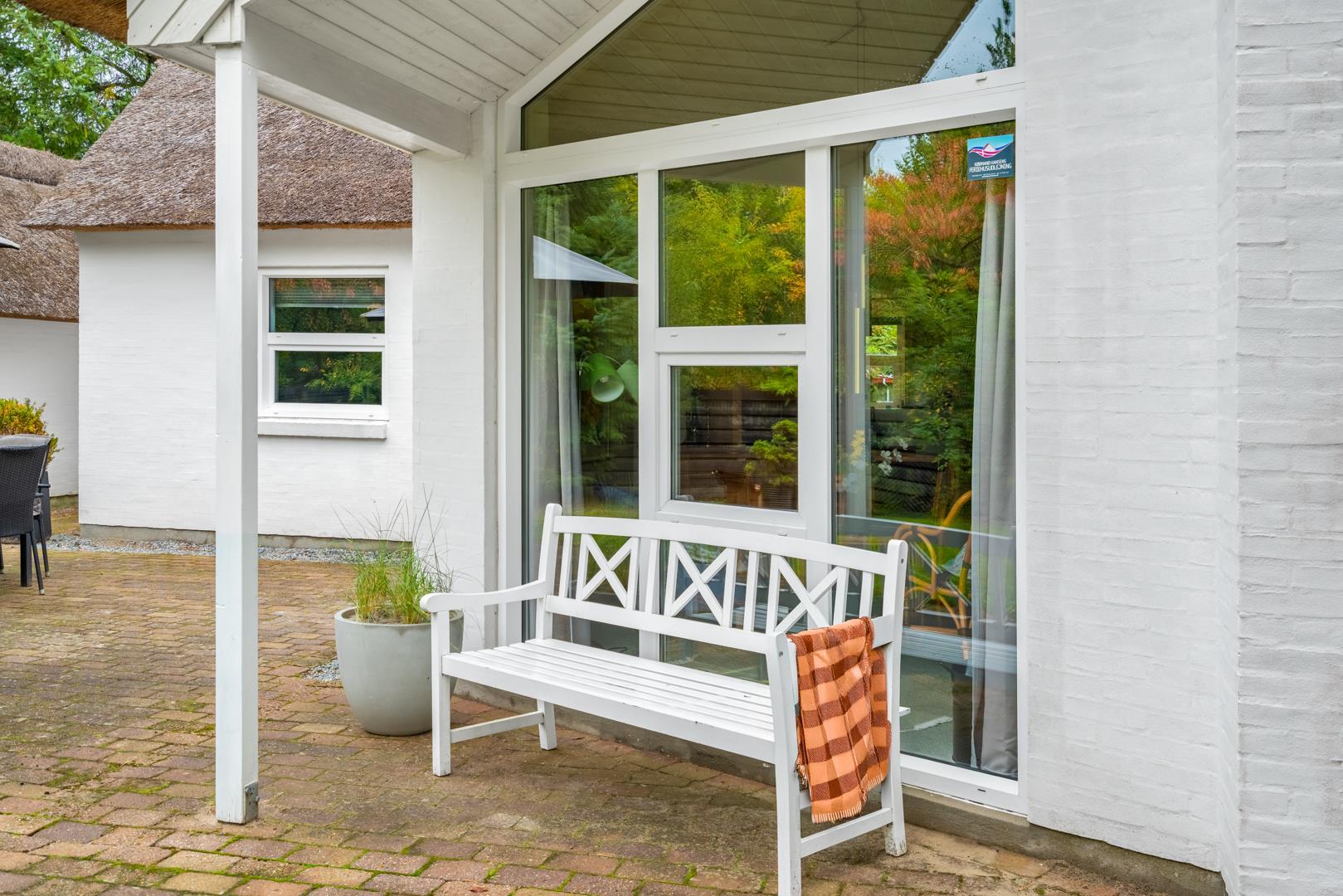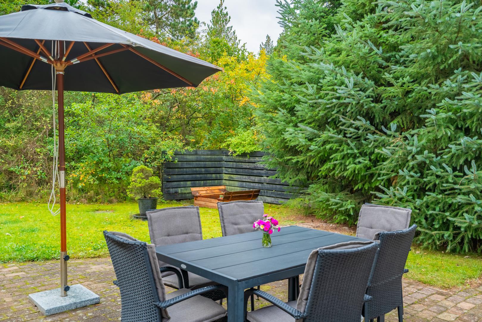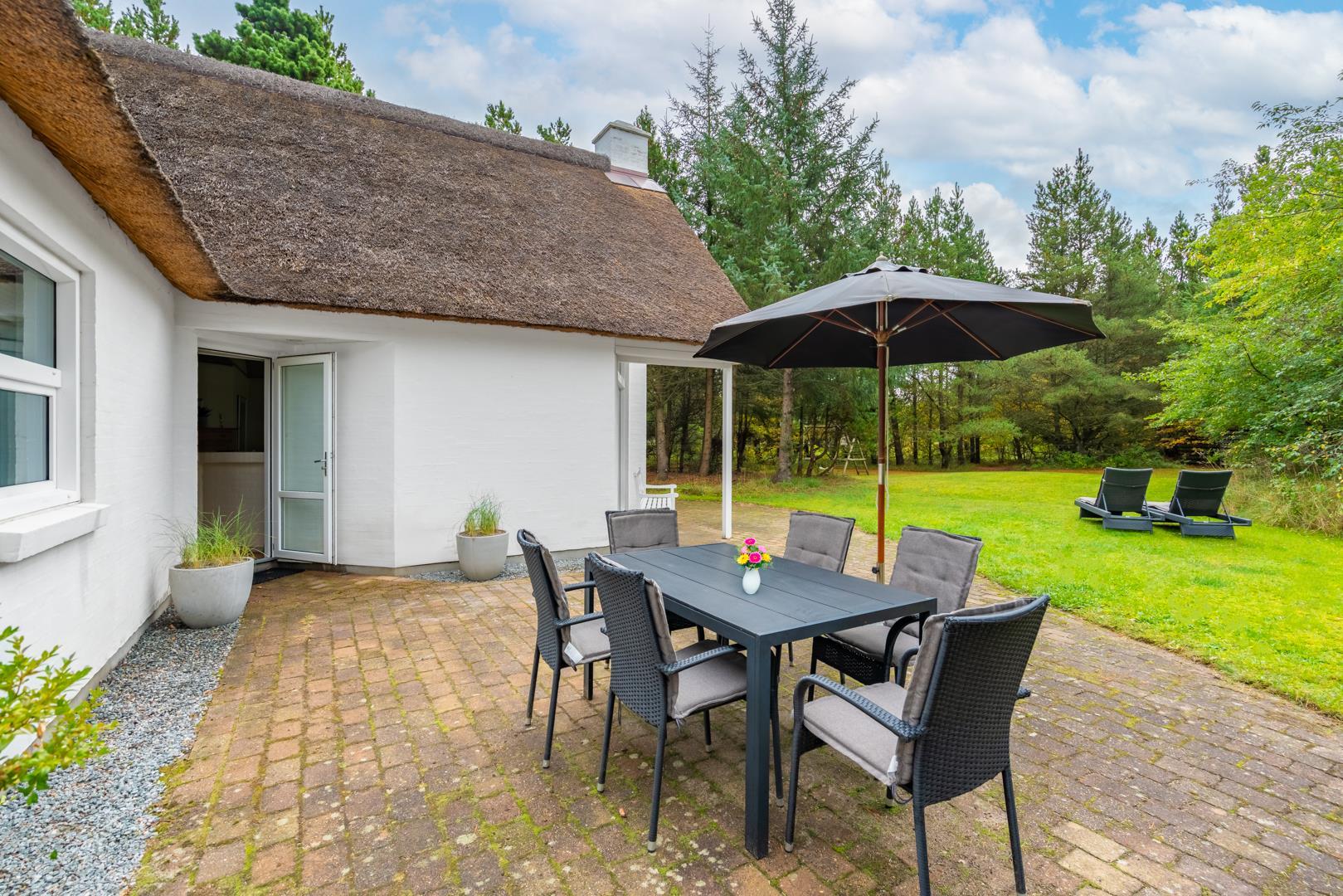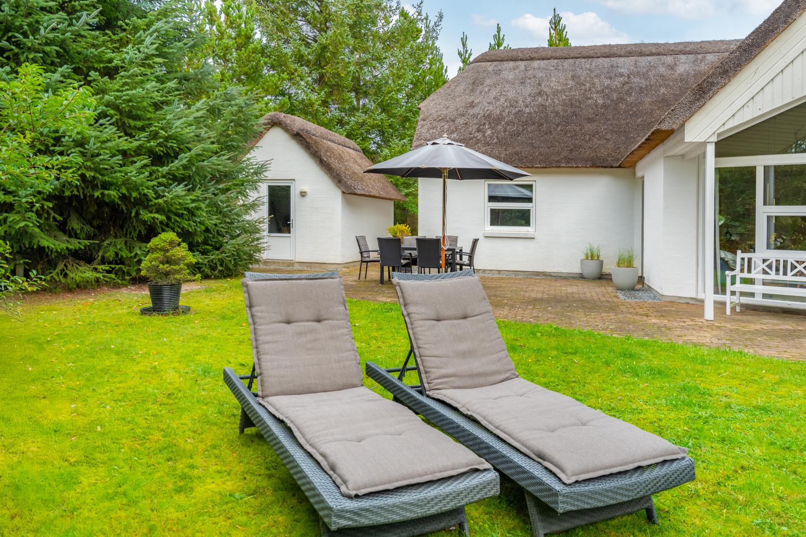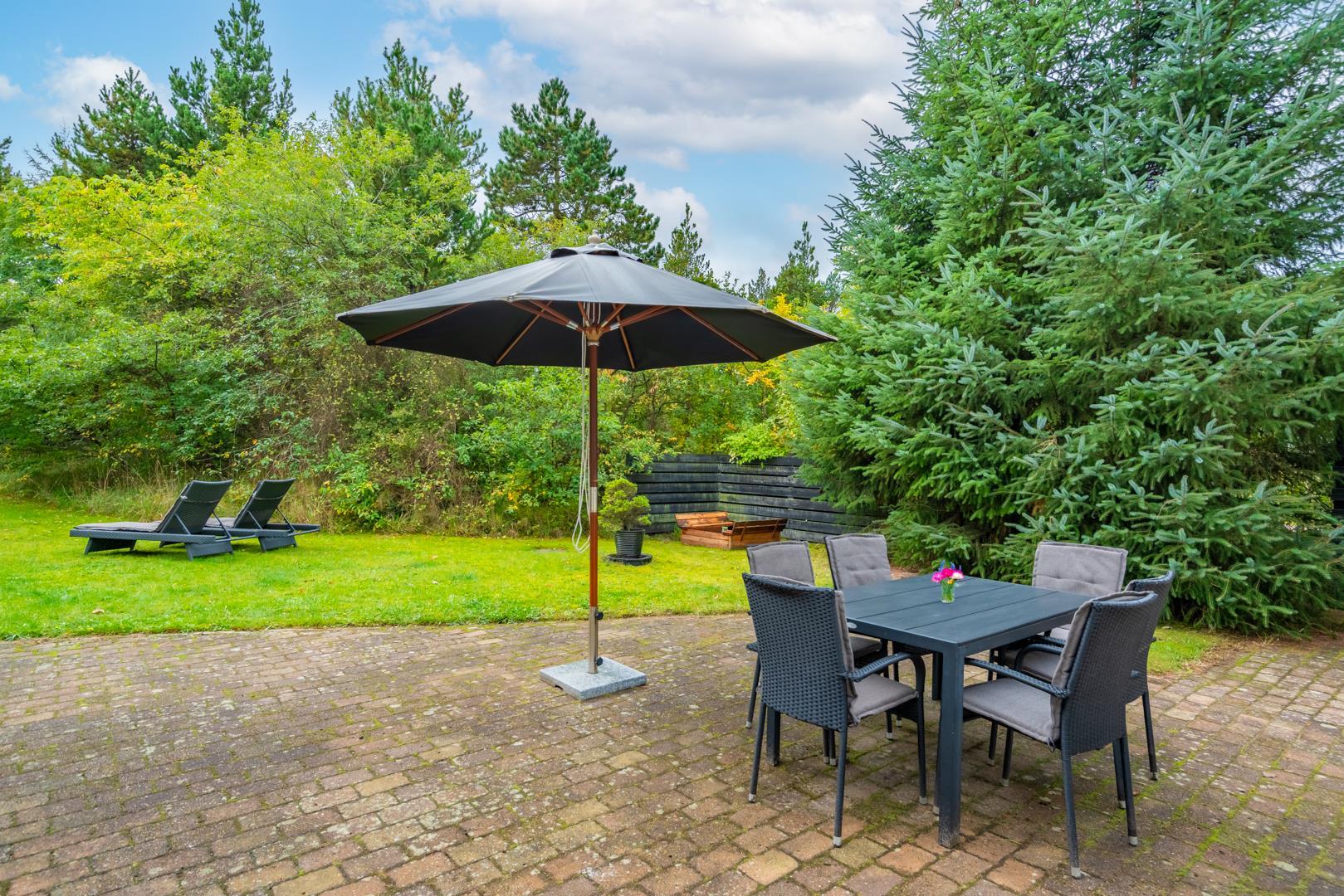 Den delvist overdækkede terrasse er udstyret med havemøbler og solsenge og giver mulighed for udeliv hele dagen – også når vinden rusker lidt.
