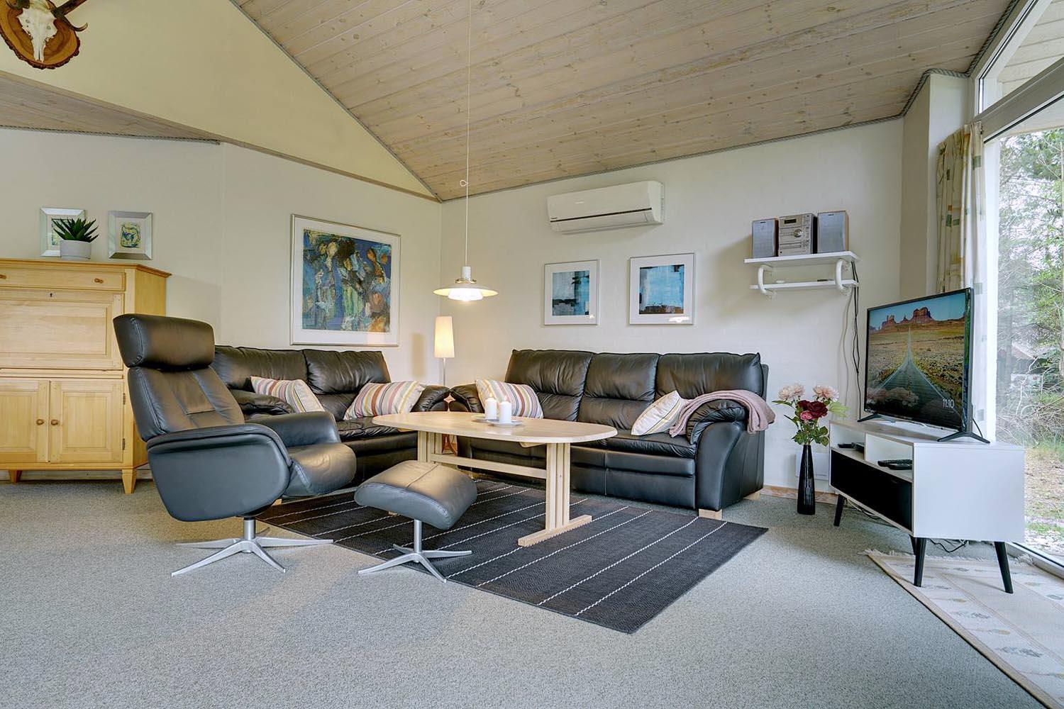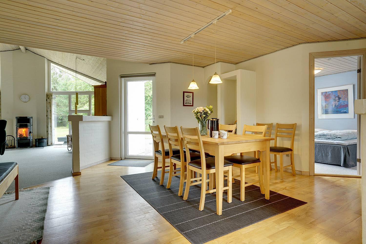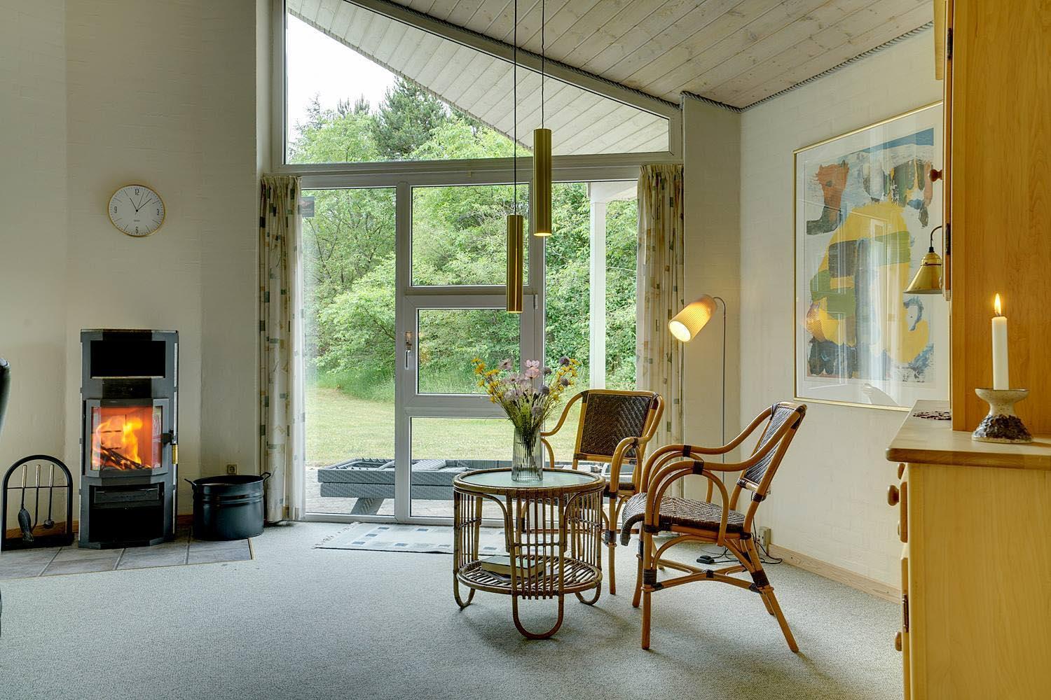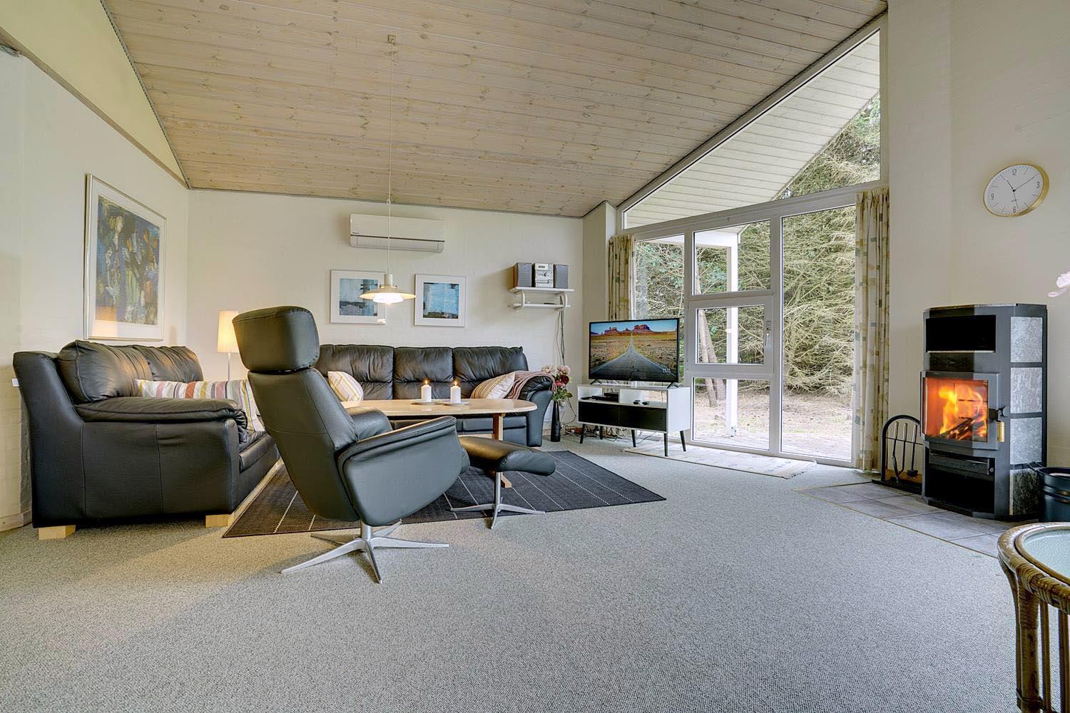 Stuen er lyst og venlig med store vinduer, der lukker naturen indenfor. Brændeovn bliver hurtigt samlingspunktet på kølige dage og skaber ægte hygge, mens varmepumpen sikrer et behageligt indeklima året rundt.