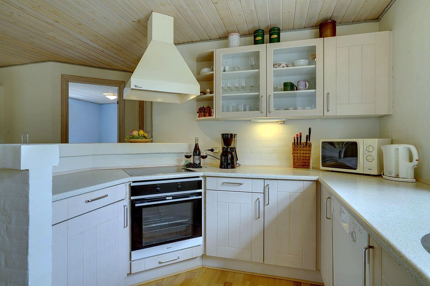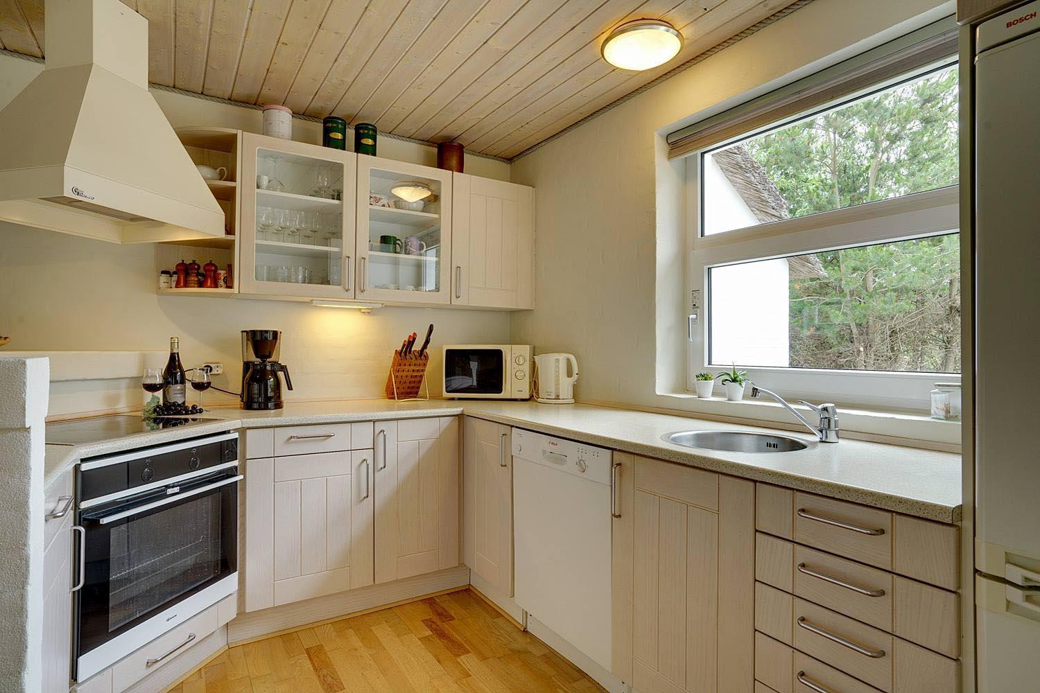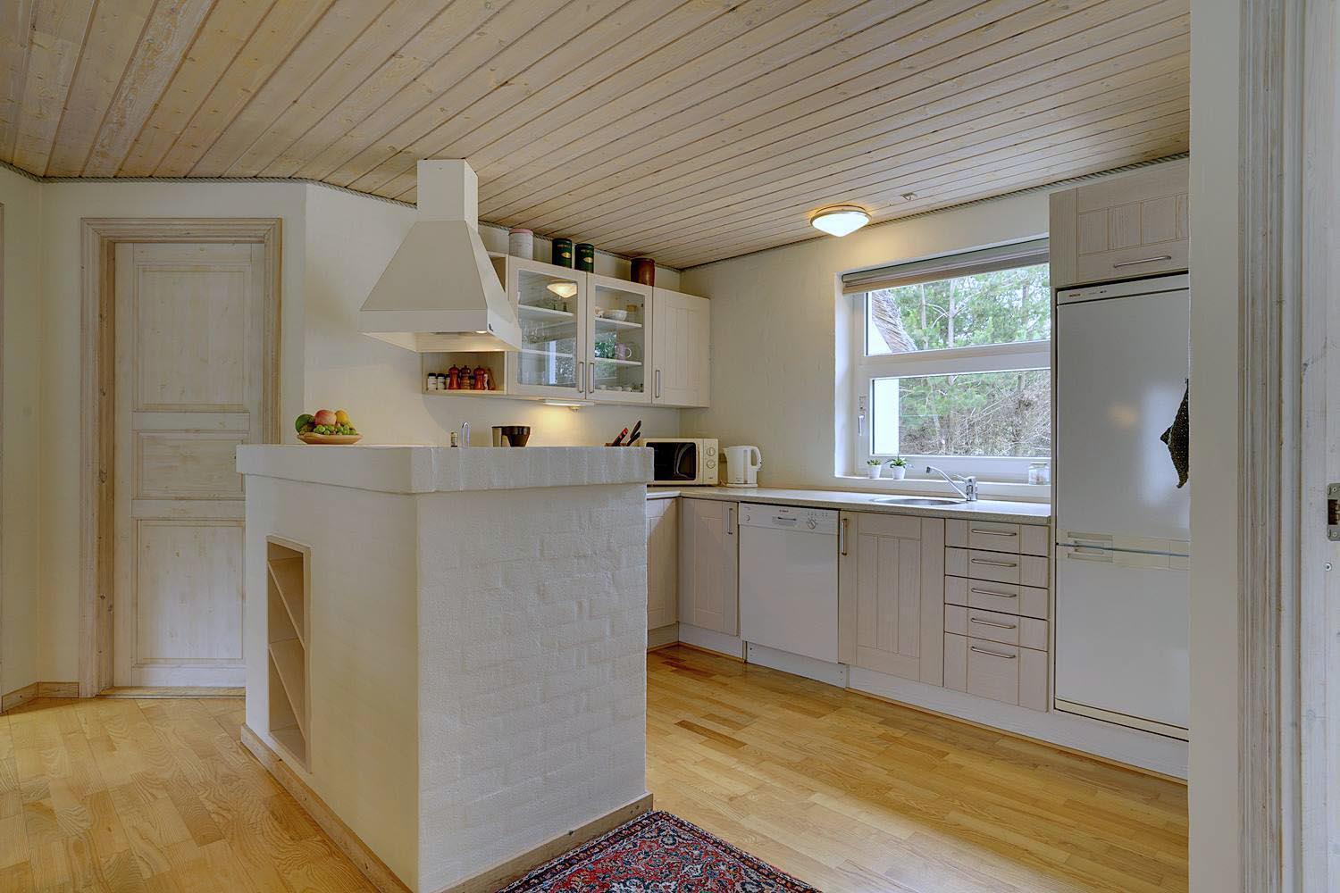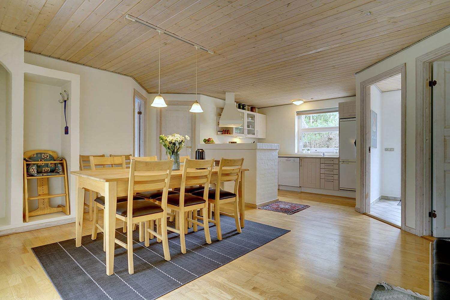 Køkkenet ligger i åben forbindelse med stuen og er fuldt udstyret med alt, hvad man behøver til nem madlavning: opvaskemaskine, ovn, keramisk kogeplade, køle-fryseskab, kaffemaskine og god bordplads. Ved det store spisebord er der plads til både måltider og spil.