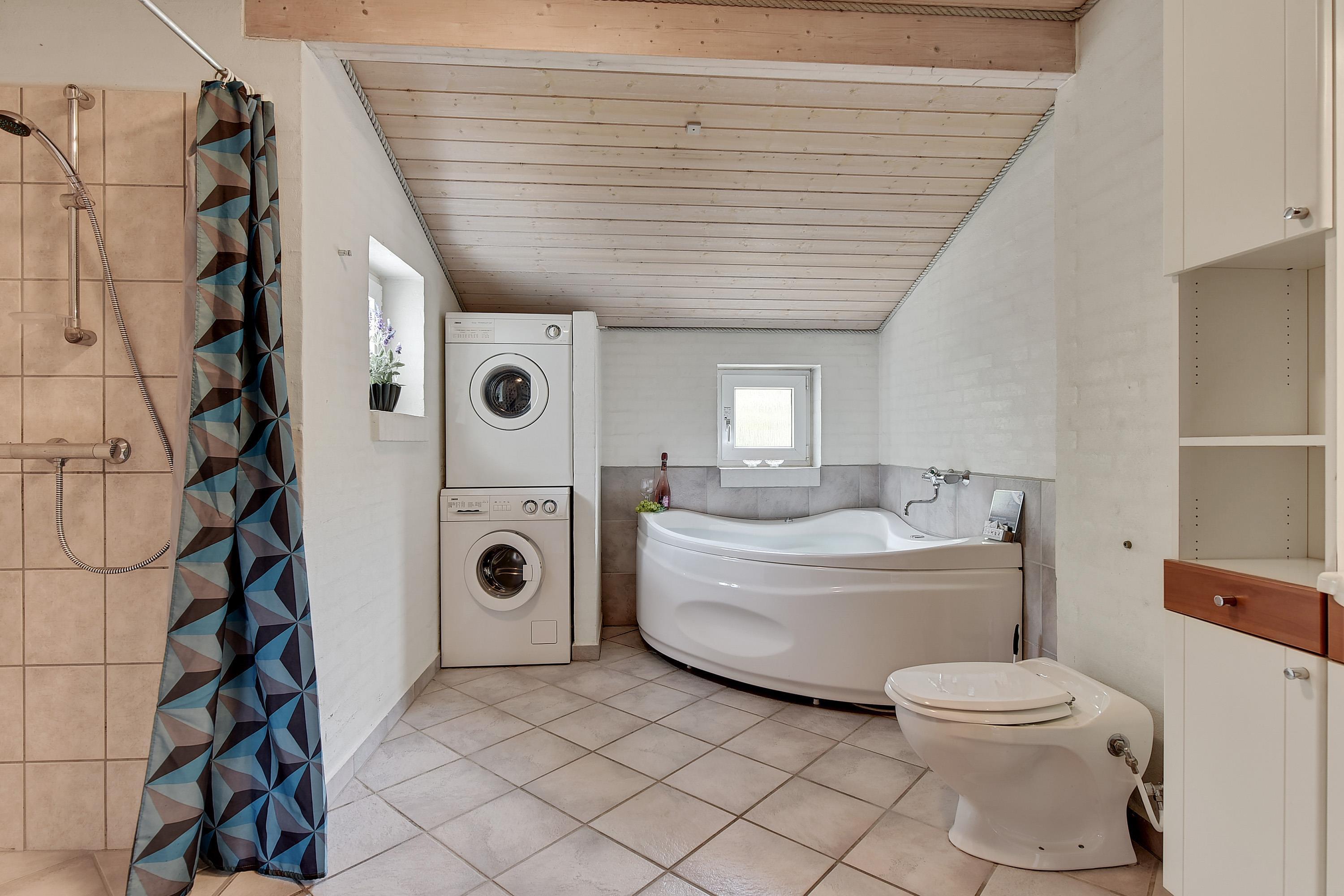 Badeværelset byder på lidt ekstra velvære: gulvvarme, privat sauna og spa – perfekt til afslapning efter en lang dag ved havet. Derudover findes både vaskemaskine og tørretumbler, så huset også egner sig godt til længere ophold.