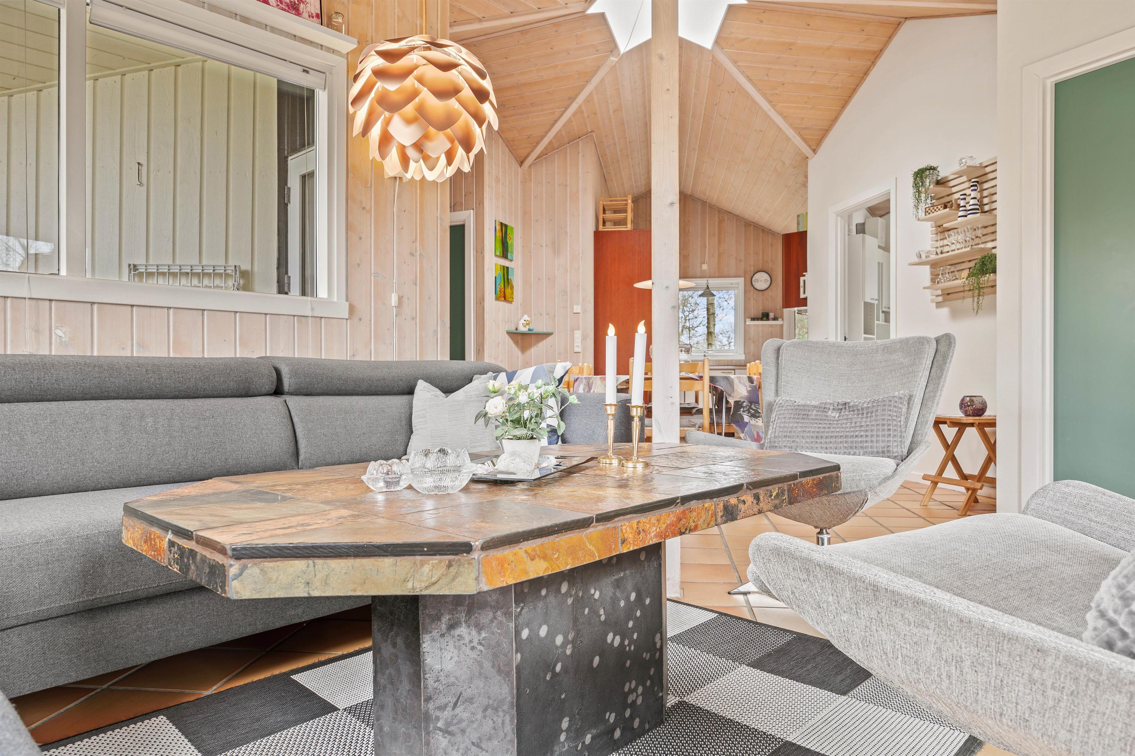 Det fine sommerhus er indrettet med både kærlighed og personlighed, og her er en helt speciel fredfyldt atmosfære, som vil byde jer varmt velkommen fra første ferieøjeblik. Husets centrum er spisestuen, som hænger sammen med det veludstyrede køkken. Her kan fællesskabet rigtig komme i centrum, når der sammen skal tilberedes lækre feriemiddage, spilles kort, eller slappes af foran den knitrende brændeovn.