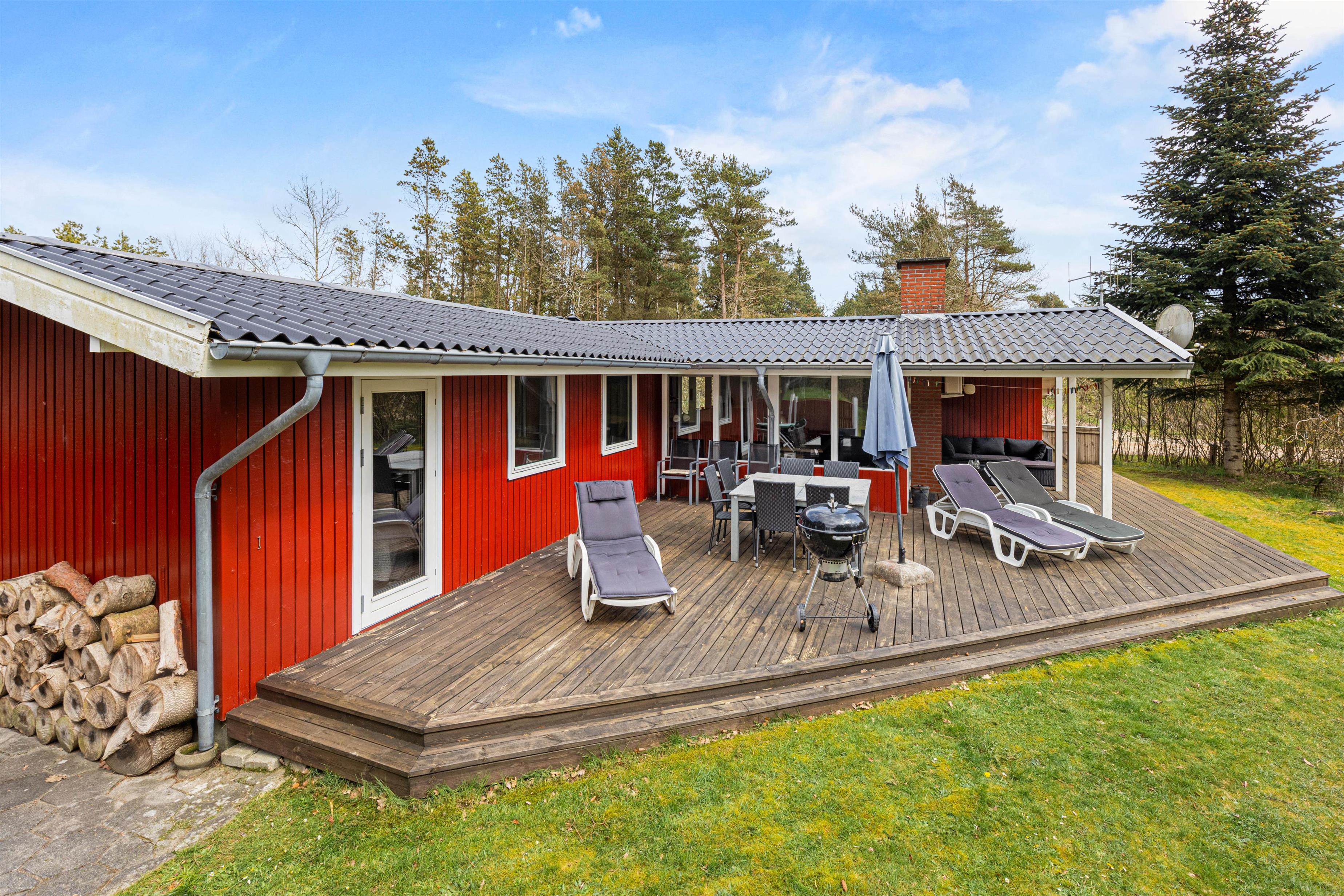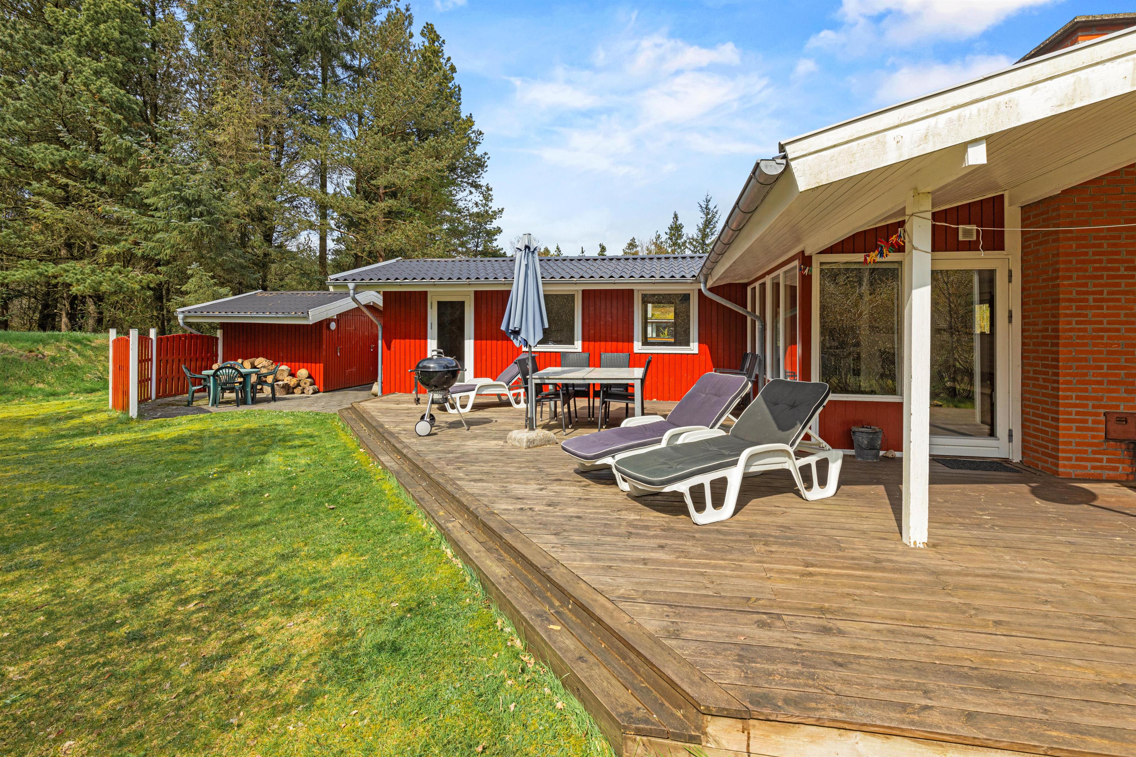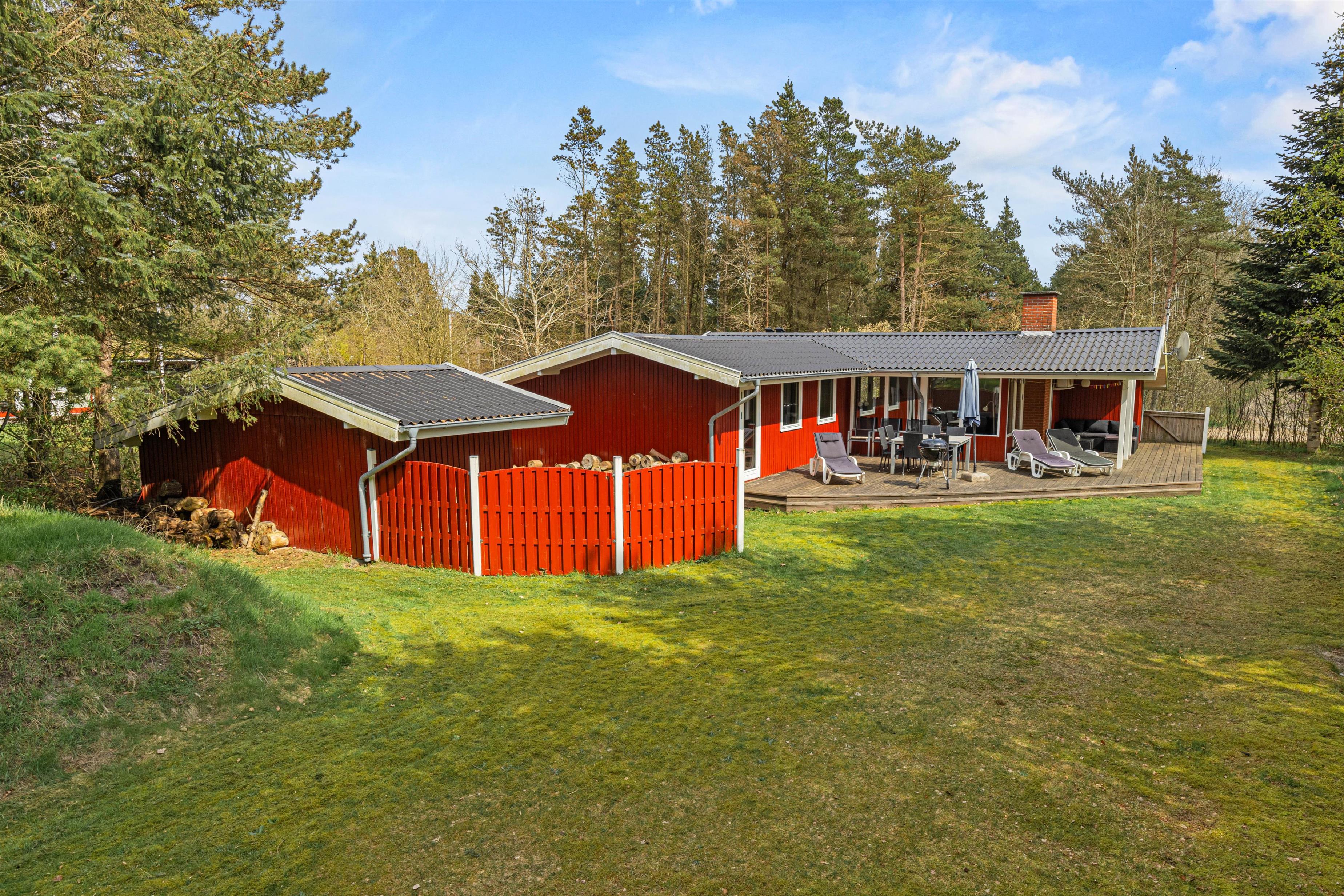 Sommerhuset gør sig godt både indvendigt og udvendigt. Det karakteristiske røde træhus er omgivet af en stor græsplæne, hvor der er god plads til leg og spil. Hos de mindste feriegæster bliver gyngen og sandkassen et hit, og mens de leger, har I god plads til at slappe af iliggestolene på terrassen, som også gør sig godt til en grillaften på en lun dag.