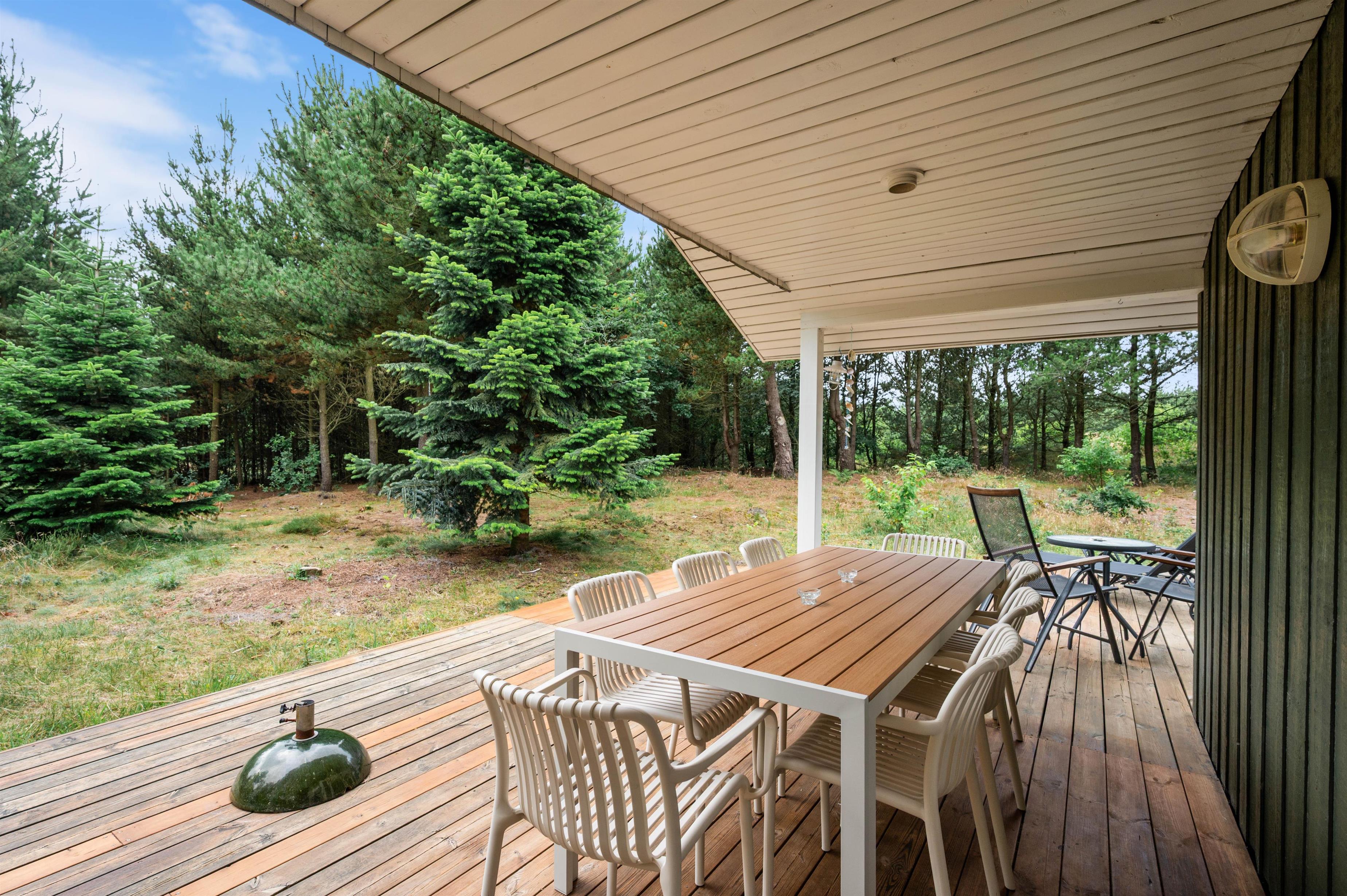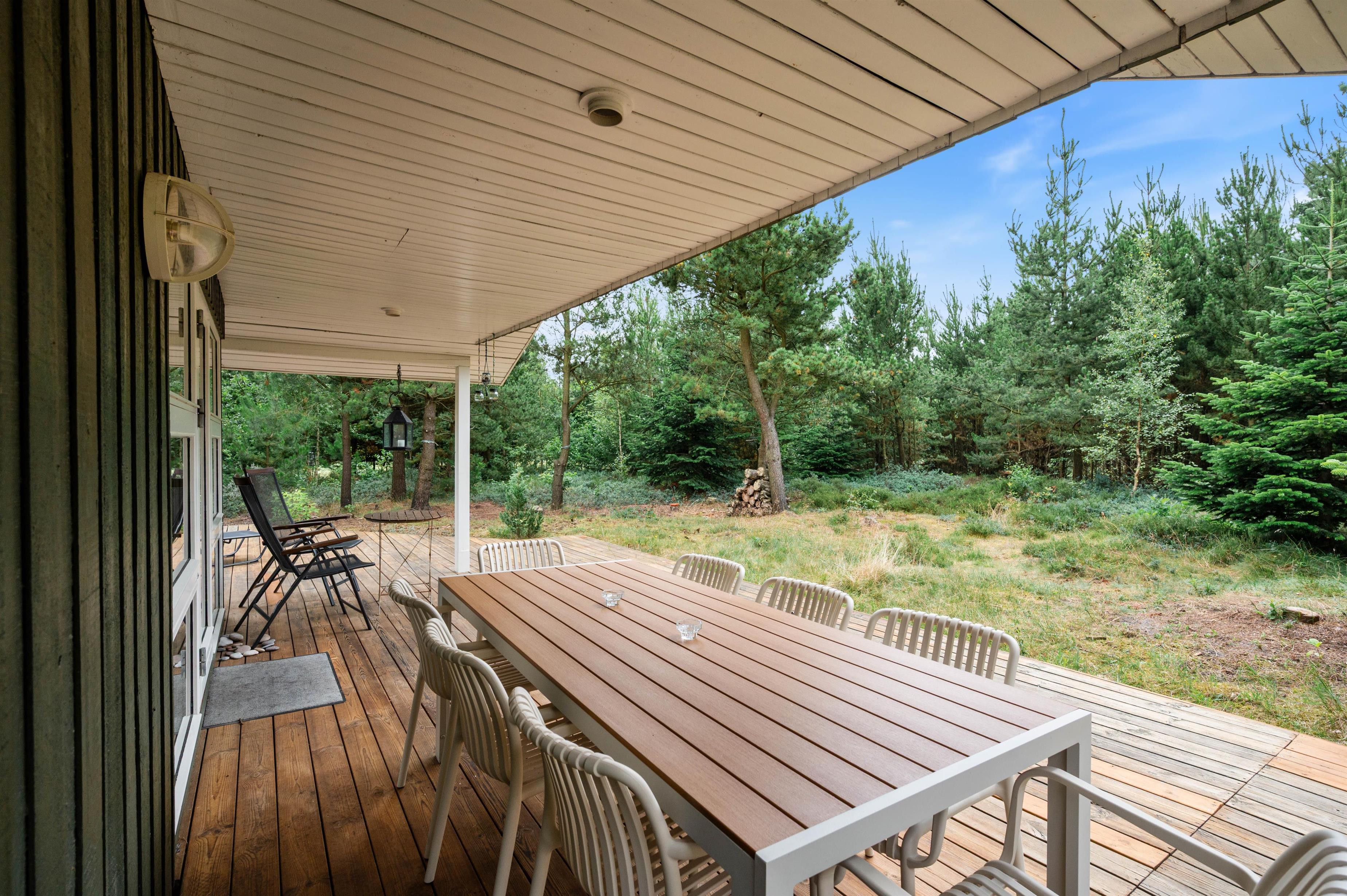 Start en dejlig feriedag med varme rundstykker fra den lokale købmand, og planlæg dagens gang rundt om morgenbordet. Måske skal vejret nydes fra den store, delvist overdækkede terrasse, hvor de mange fyrretræer, der indrammer huset, sørger for dejlige ugenerede omgivelser. Her kan I slappe af med en kop kaffe, mens morgenens solstråler kigger frem gennem trækronerne.