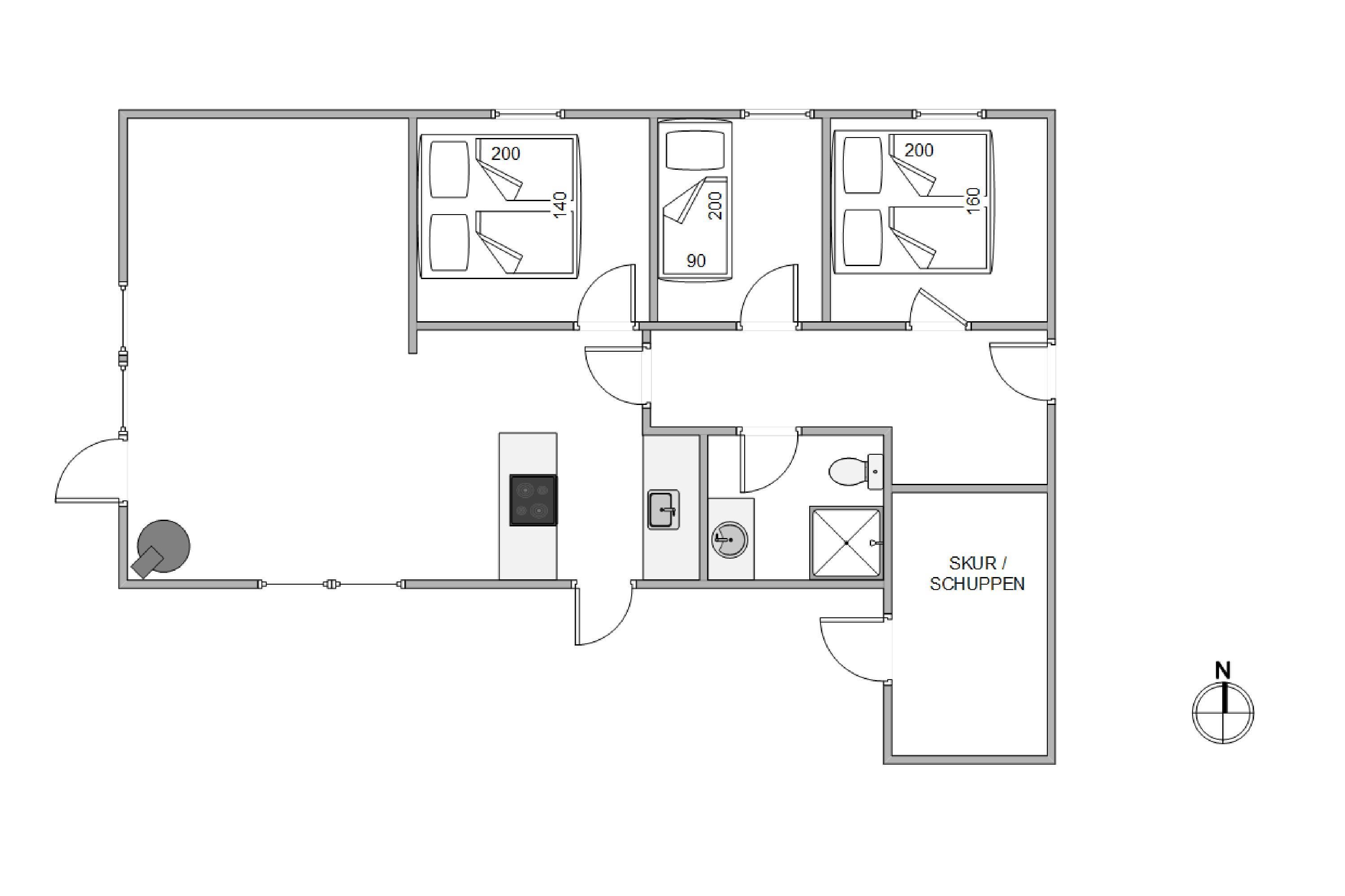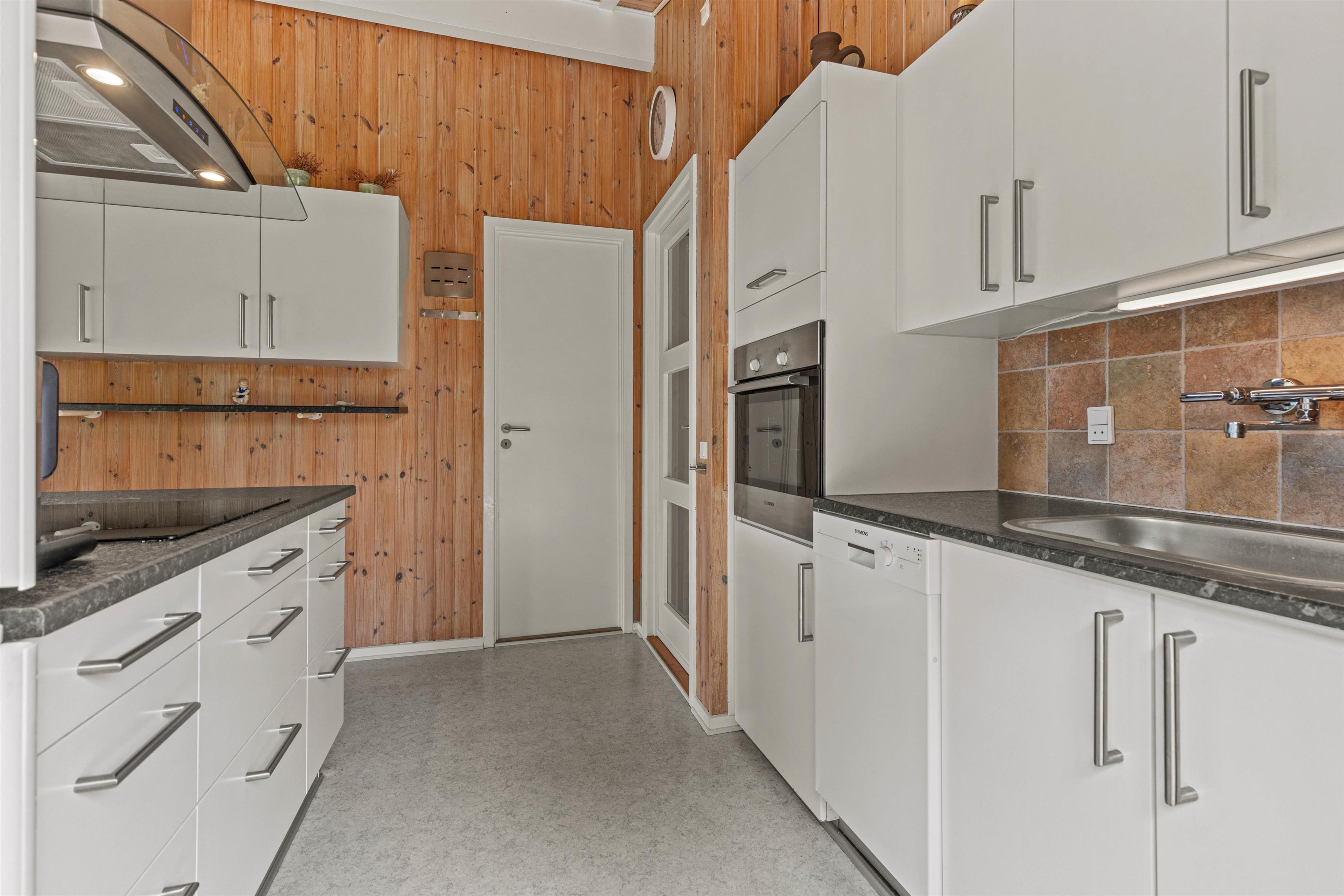 Sommerhuset er lyst og hyggeligt indrettet med en god opholdsstue, der ligger i åben forbindelse med husets spisestue og køkken. Køkkenet er placeret, så du kan kigge ud i stuen og til udearealet, mens du laver mad.