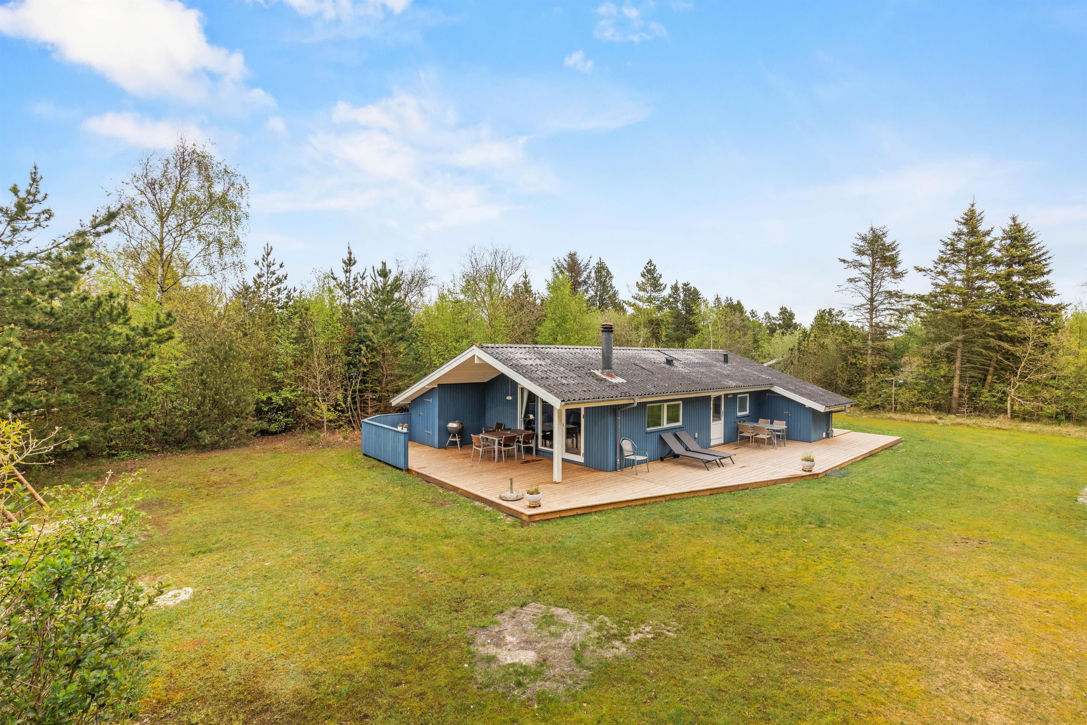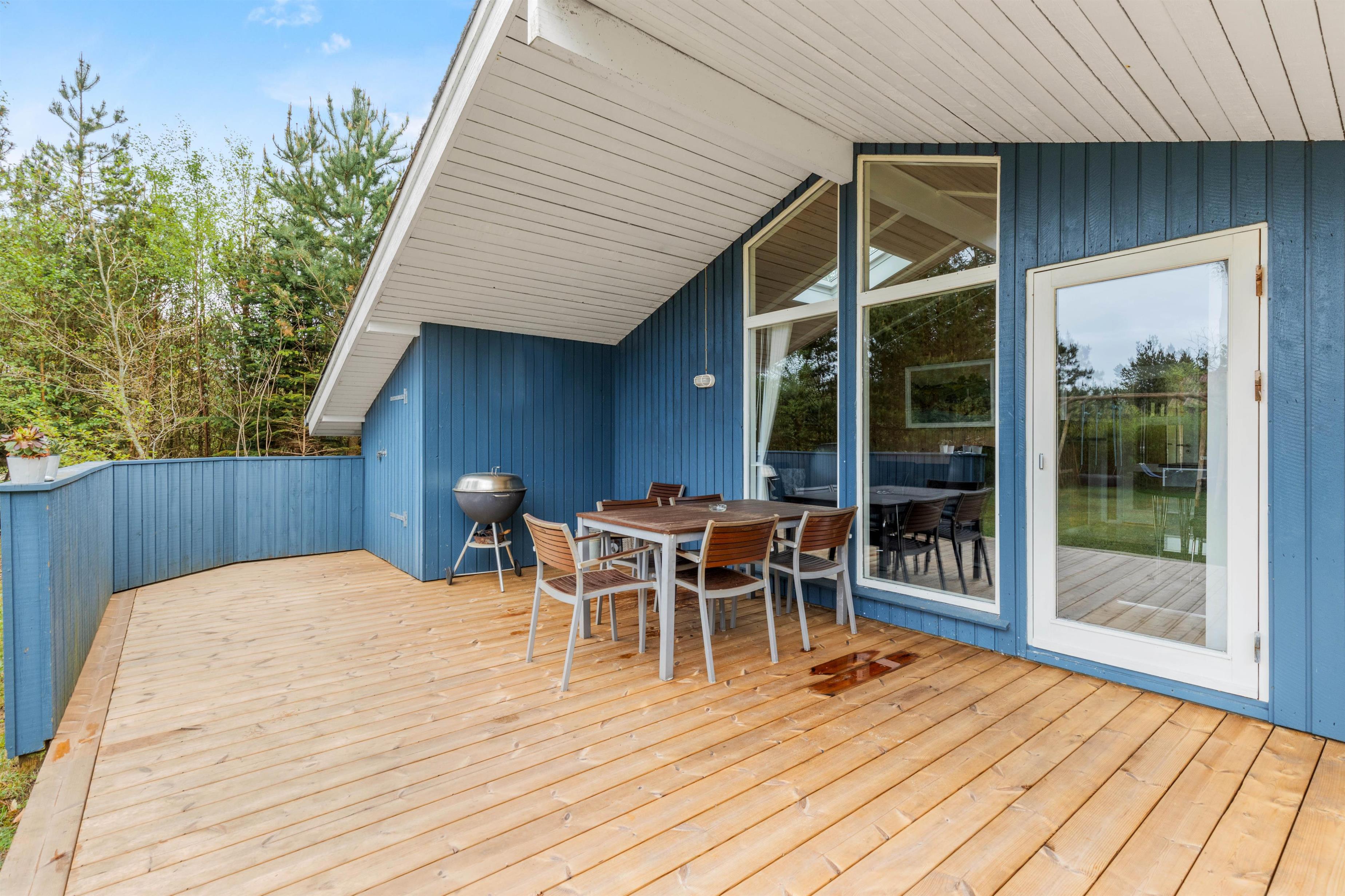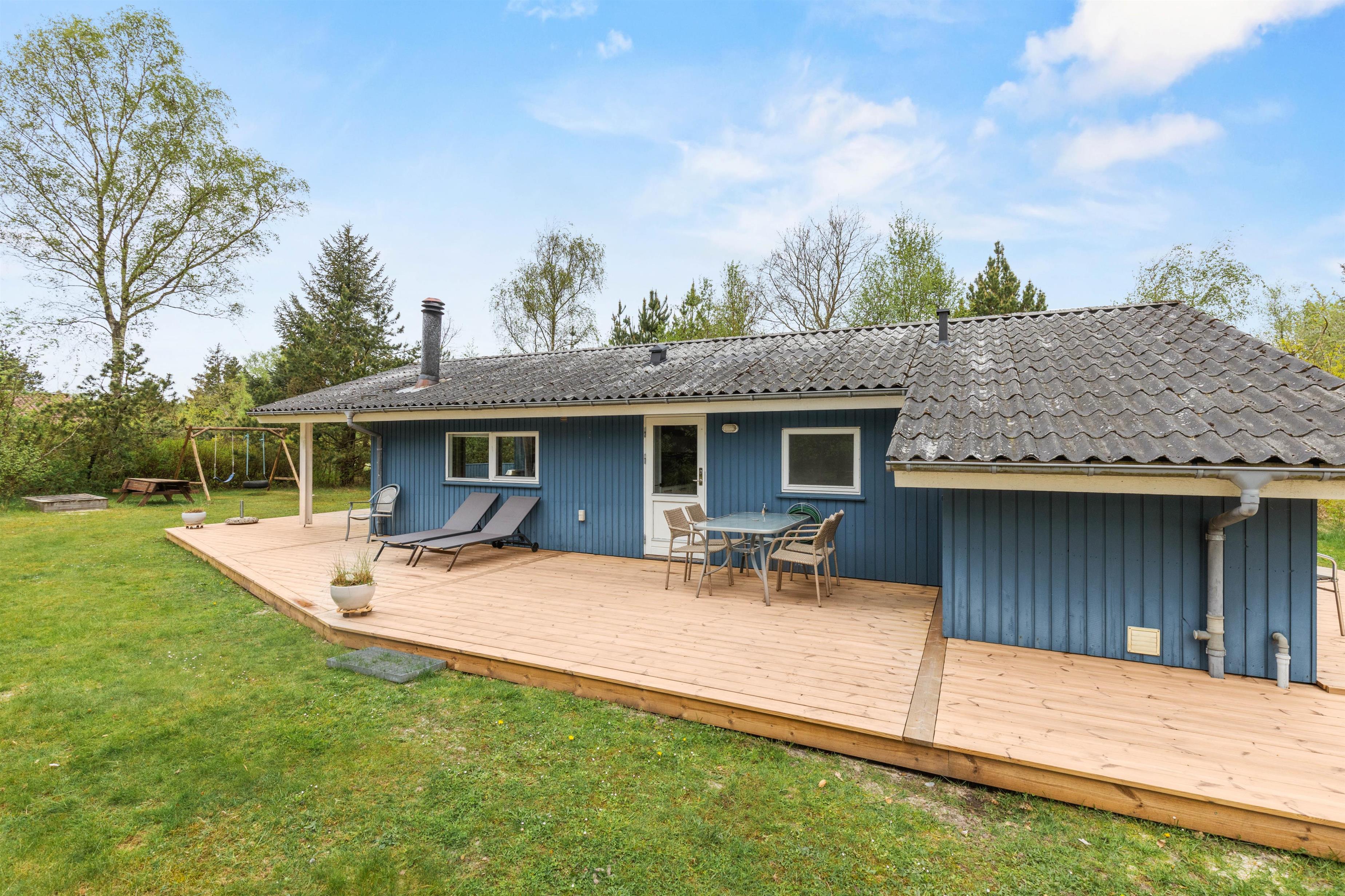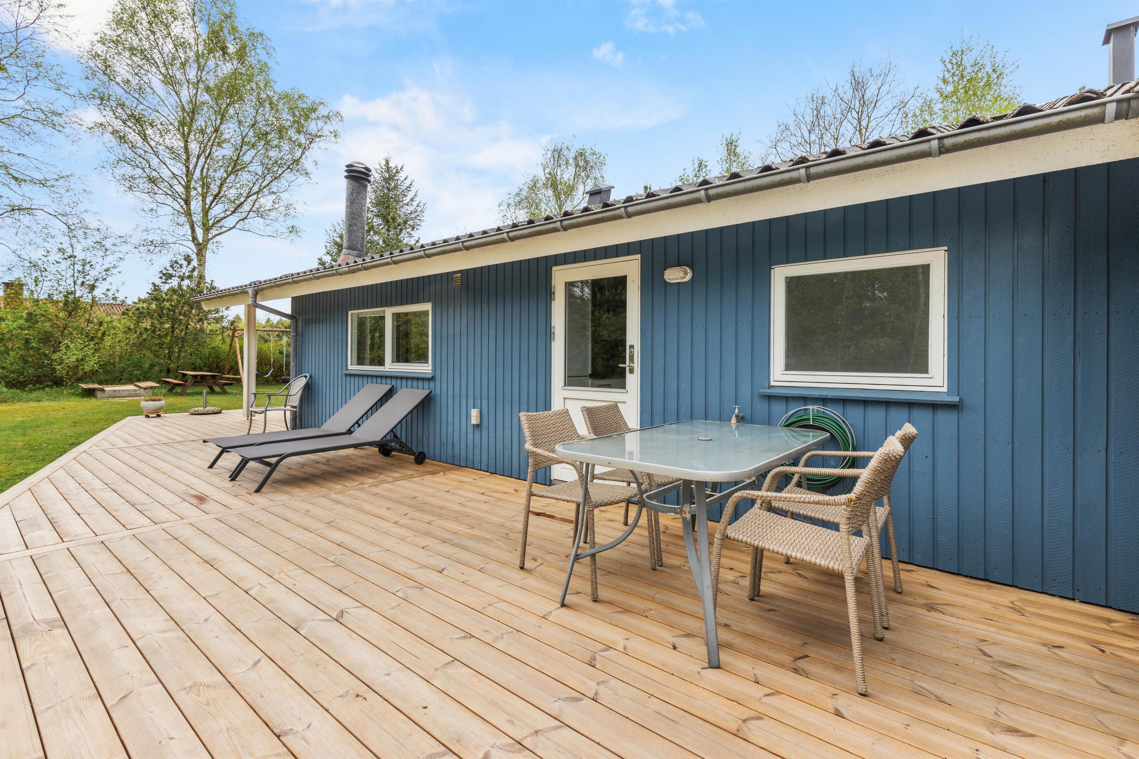 På den store træterrasse kan I nyde solen og den flotte natur dagen lang. De mange træer og buske, der omkranser grunden, sørger også for, at I kan holde ferie i fred og ro, fuldstændig ugeneret.