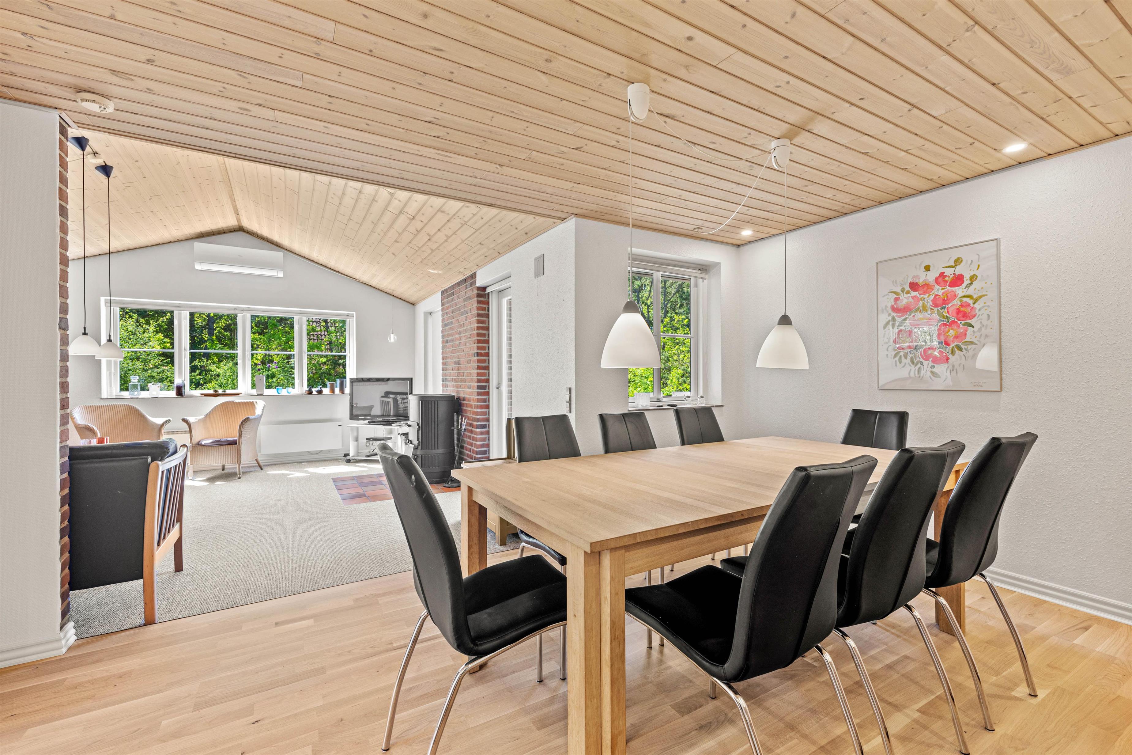 Stuen er kombineret med spisepladsen og det åbne køkken, så I kan lave aftensmaden sammen, nyde den lækre mad eller bare slappe af og føle brændeovnens behagelige varme. Som et alternativ til brændeovnen er sommerhuset i Houstrup også udstyret med en moderne varmepumpe, der er energibesparende og sørger for den perfekte temperatur.