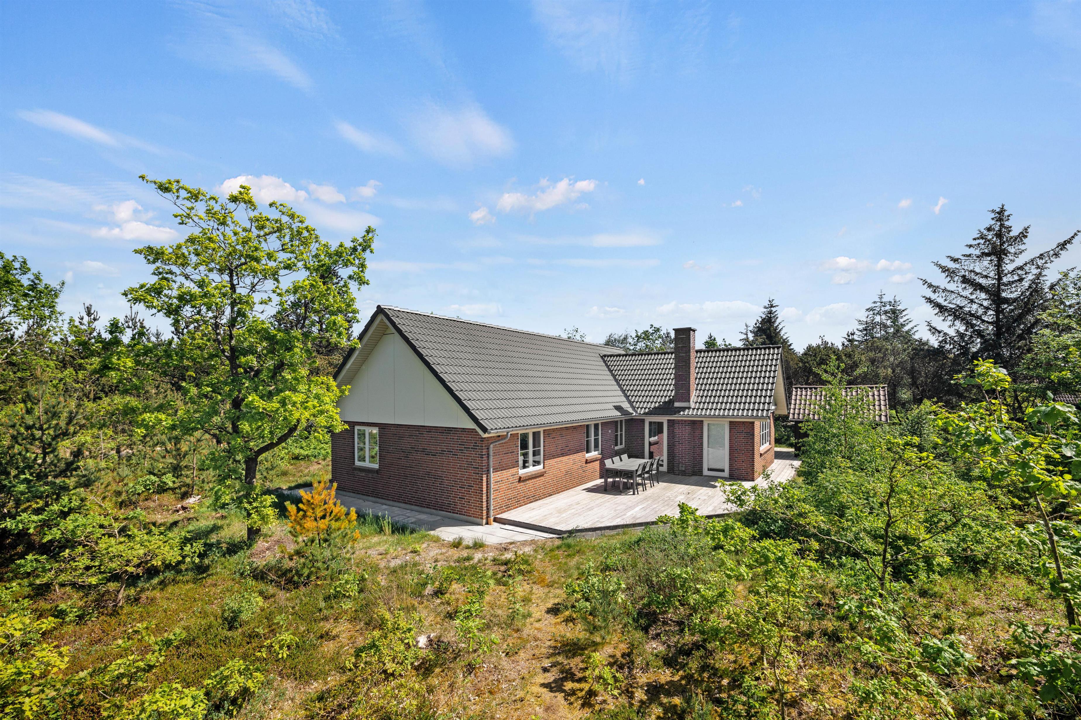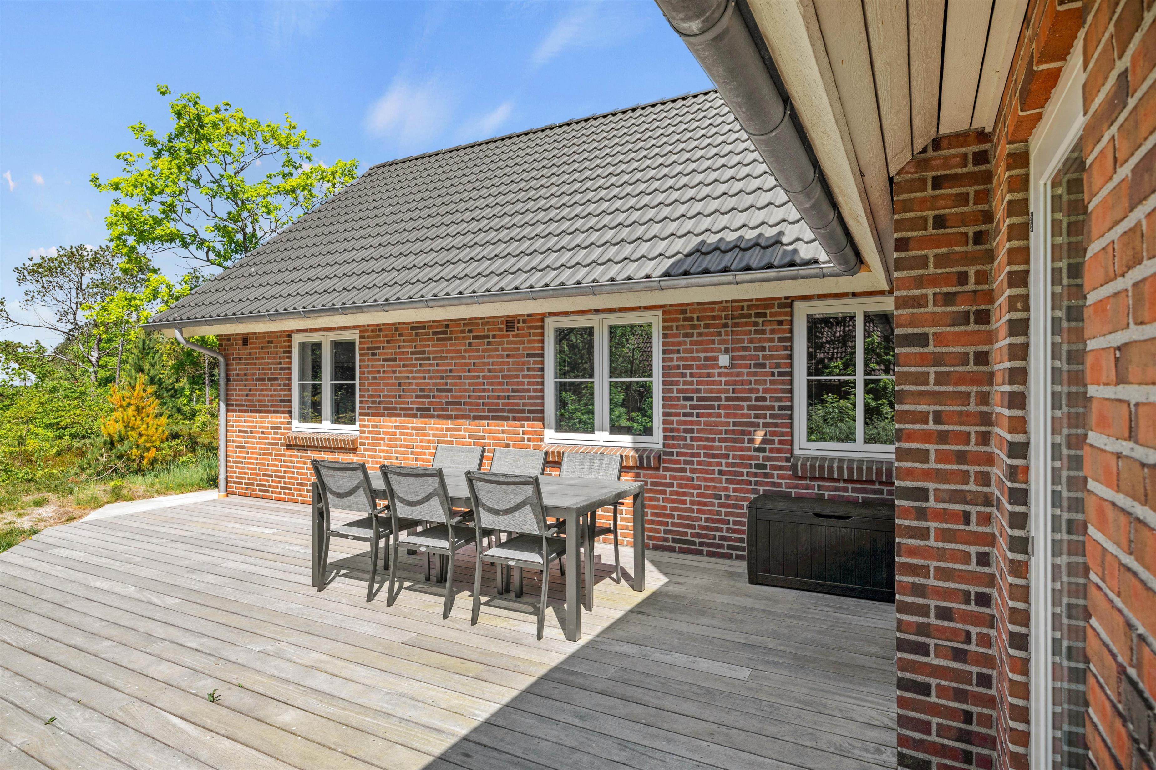 Feriehuset, der har en fantastisk sydvestvendt træterrasse, er ideel til en familieferie eller til et eller to vennepar. Beliggenheden på Søndervang 128 er stille, selvom det er en hjørnegrund. Campingpladsen er kun et stenkast væk, og her kan I købe frisk morgenbrød og andre småting.