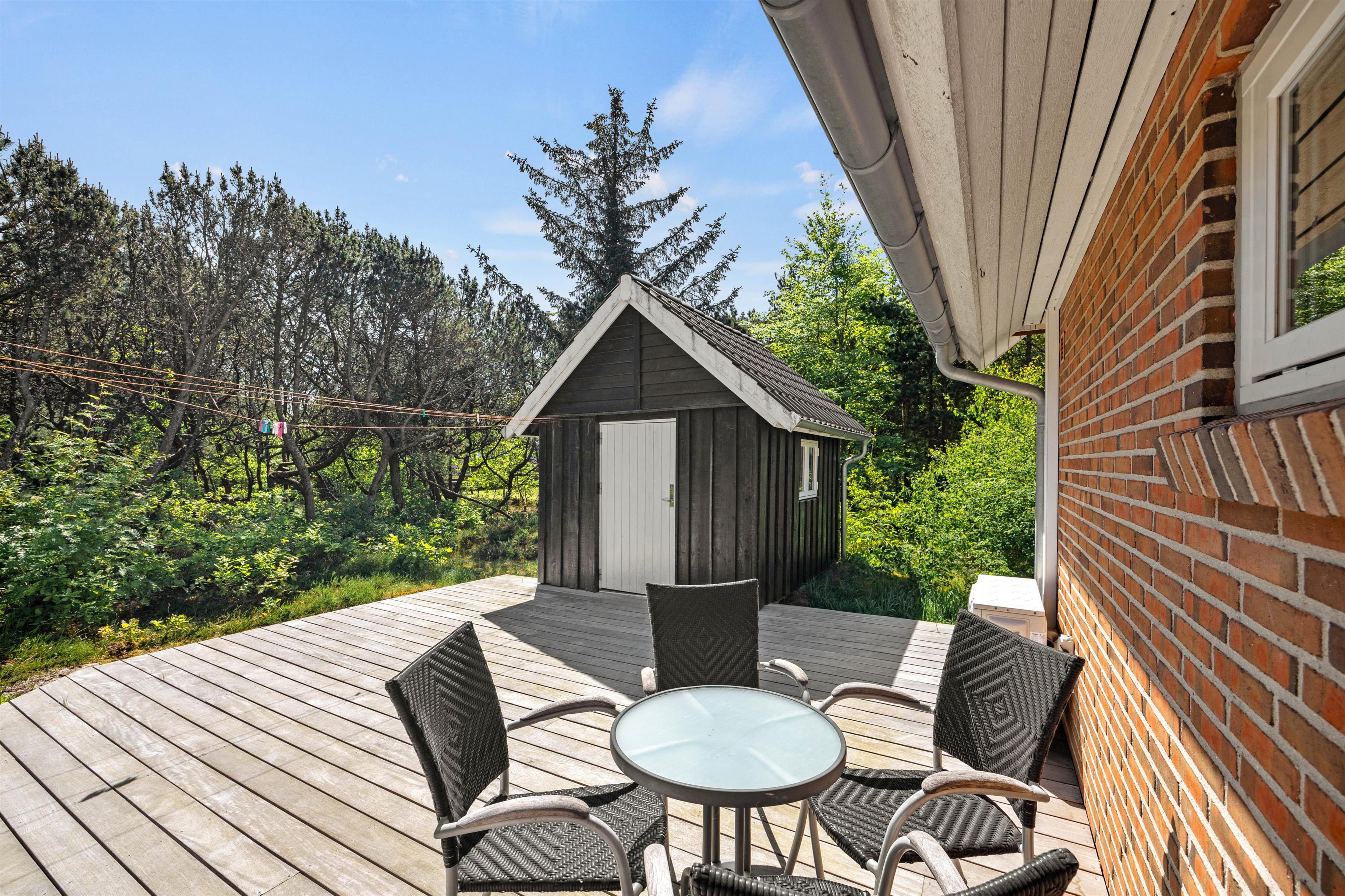 Fra terrassen har du en skøn udsigt over det grønne område i baghaven. Her kan du nyde solen og varmen på de solrige dage og lytte til fuglefløjt fra trætoppene.