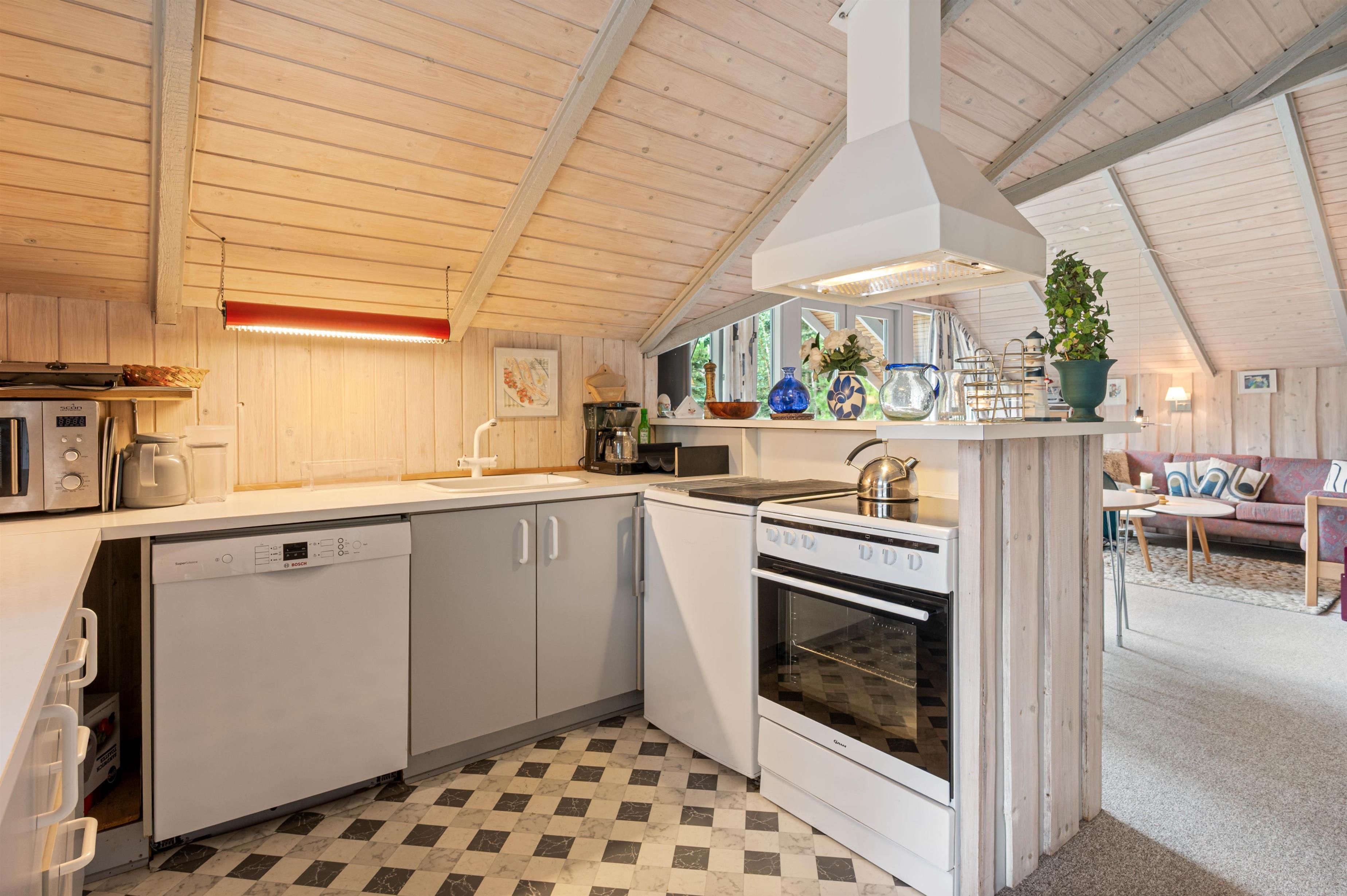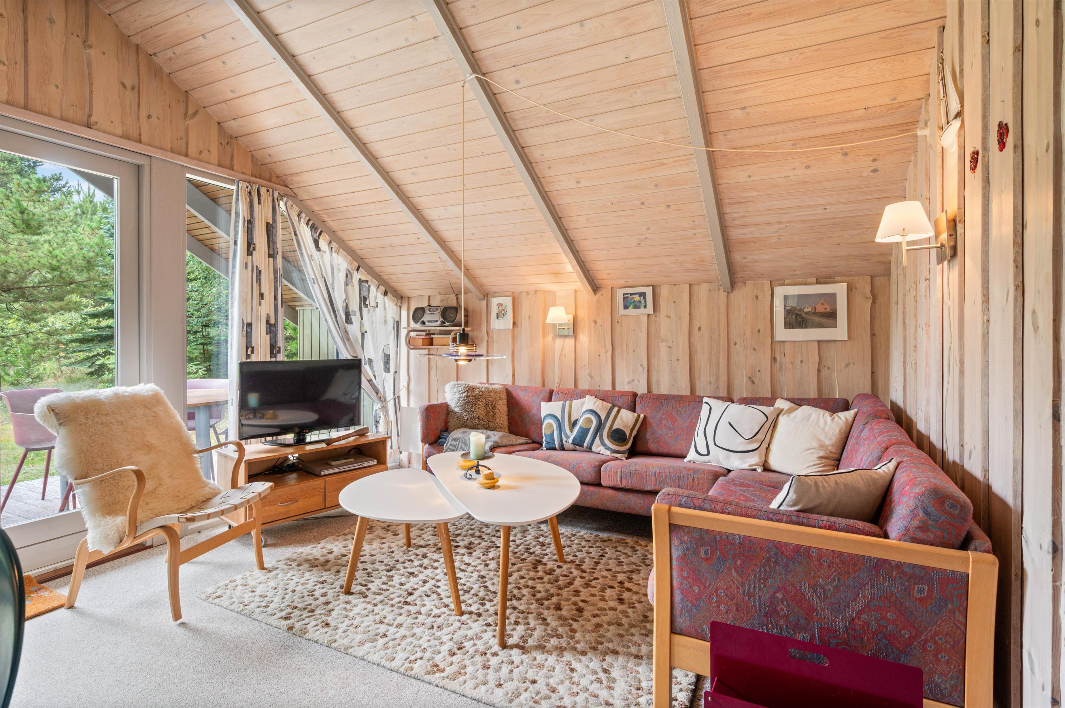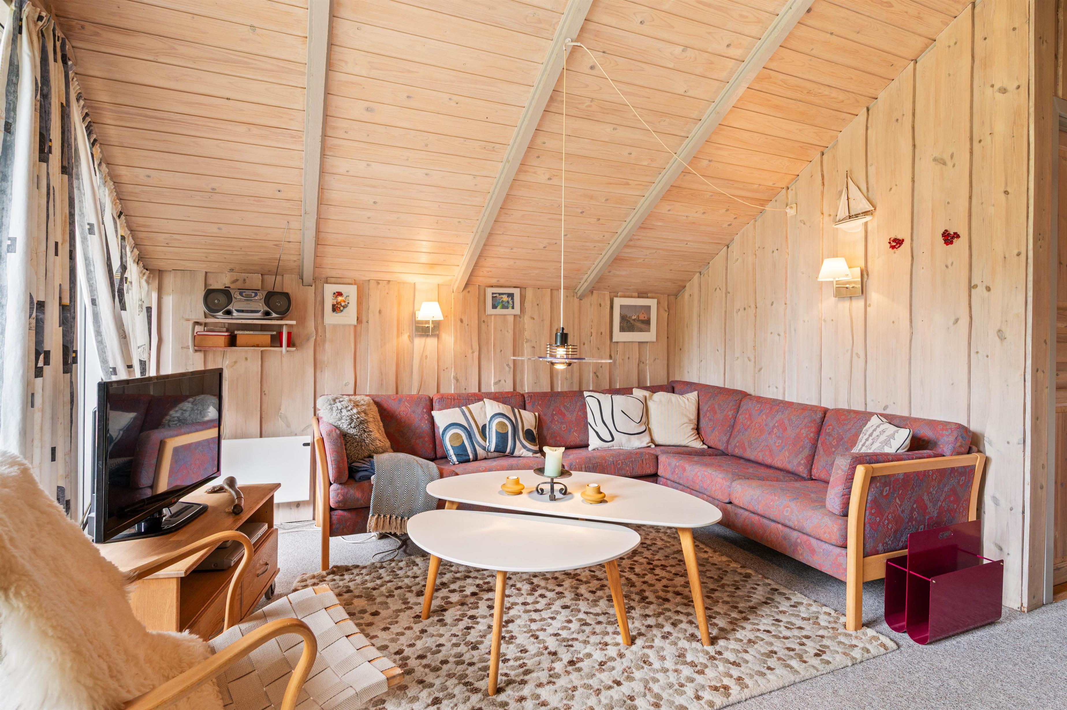 De lyse trævægge og den venlige indretning gør sommerhuset både klassisk og indbydende. Stuen, som ligger i forbindelse med køkkenet, er både udstyret med et stort sofahjørne, fladskærms-TV, brændeovn og en hyggelig spiseafdeling.