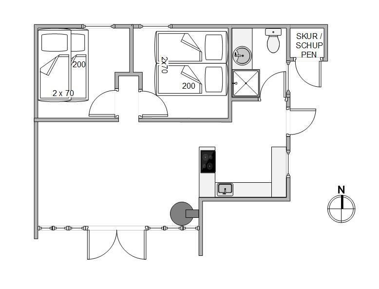 Køkkenet er godt udstyret, så I kan finde de indre kokke frem og være kreative med feriemiddagene. Gennem de store vinduer i stuen slipper solens lys ind og oplyser hele det charmerende opholdsrum, og fra stuen kommer I til de to soveværelser, som er udstyret med dobbeltseng og køjeseng.