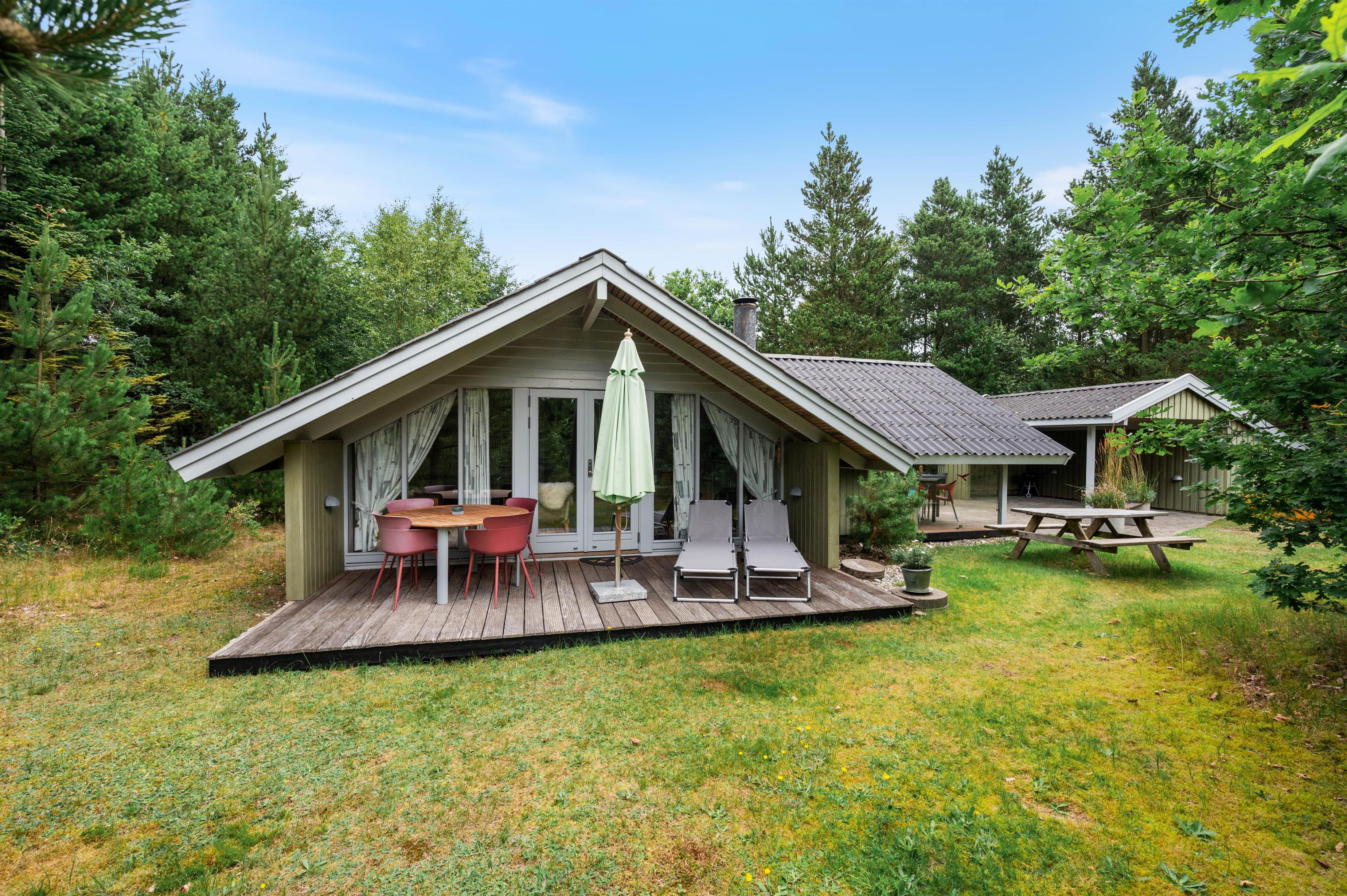 Dette træsommerhus på Kirkeflod 21 i Houstrup er det perfekte feriehjem for den lille familie eller parret, som trænger til en hyggelig og idyllisk ferie ved Vesterhavet. Grunden er omgivet af skovens høje træer, og på de 3 terrasser kan I nyde solen dagen lang, helt ugeneret. Tag familien, kæresten og ikke mindst hunden med på en dejlig ferie i fredfyldte omgivelser.