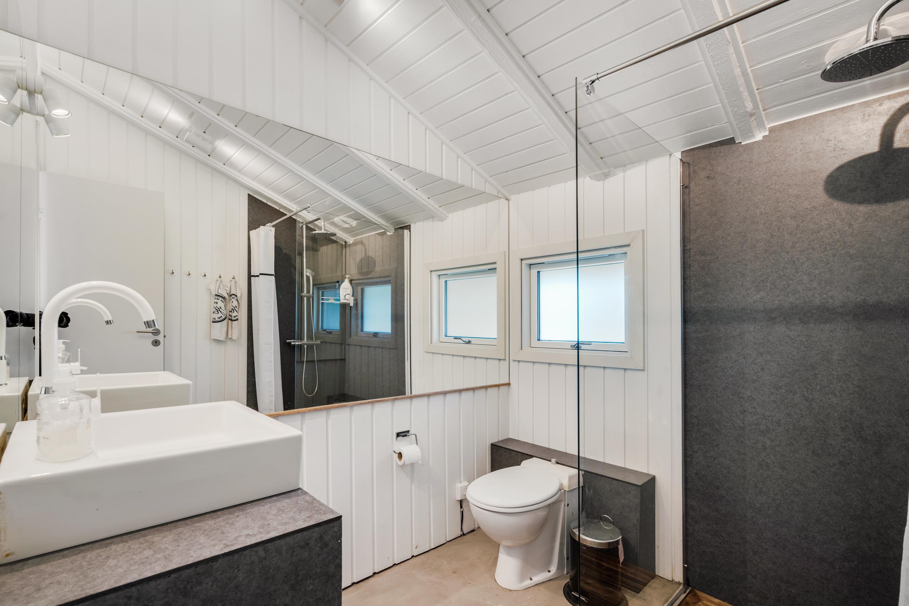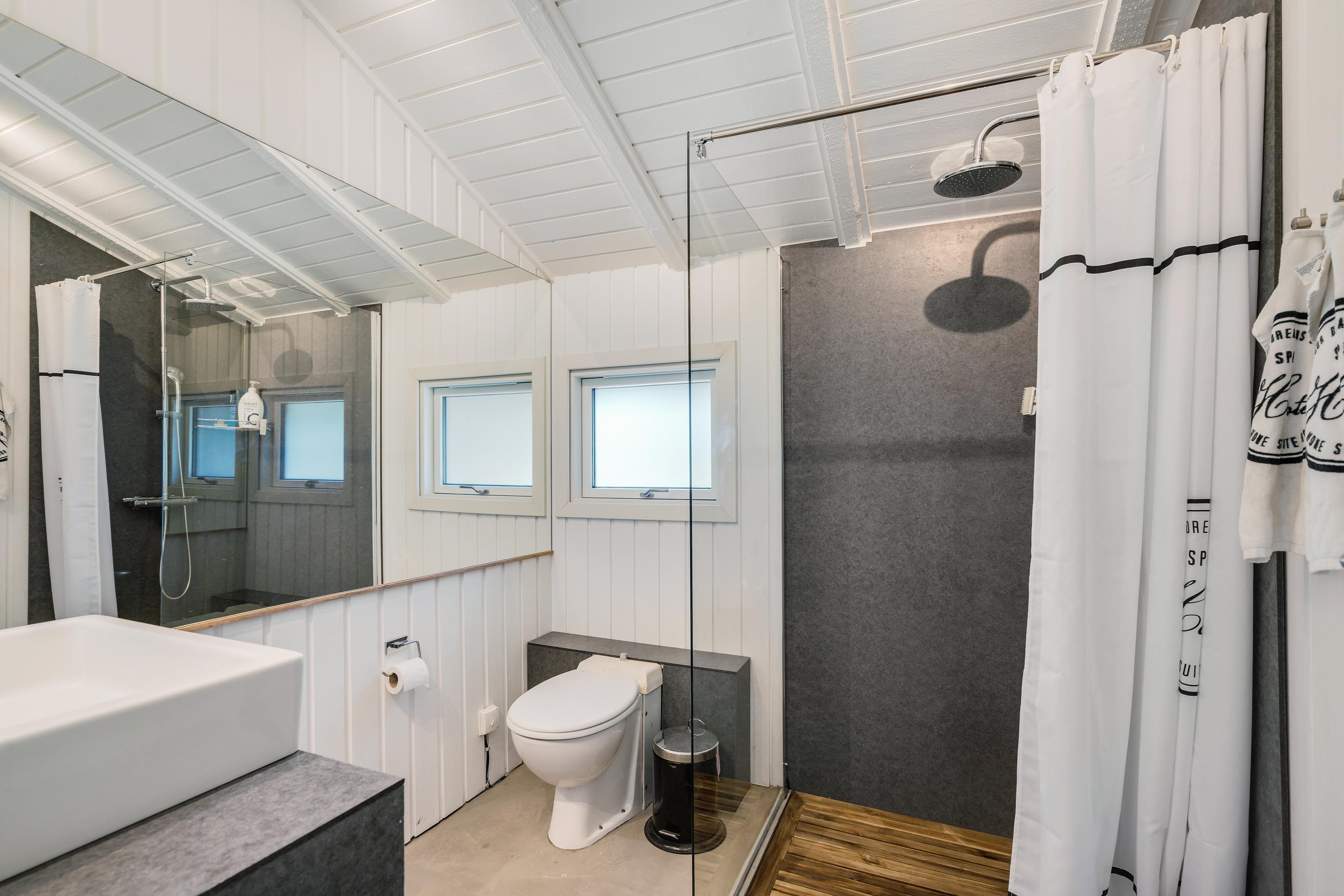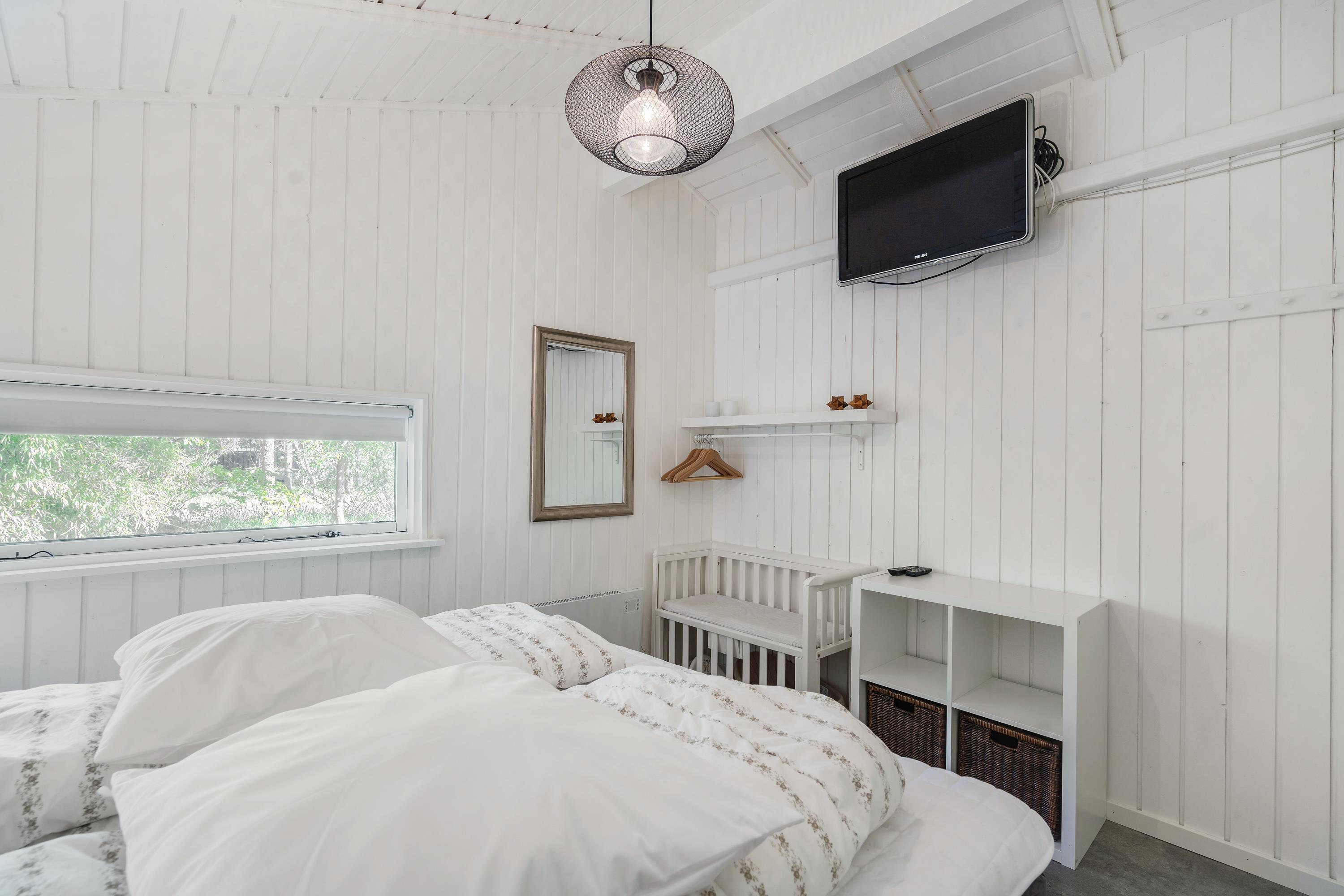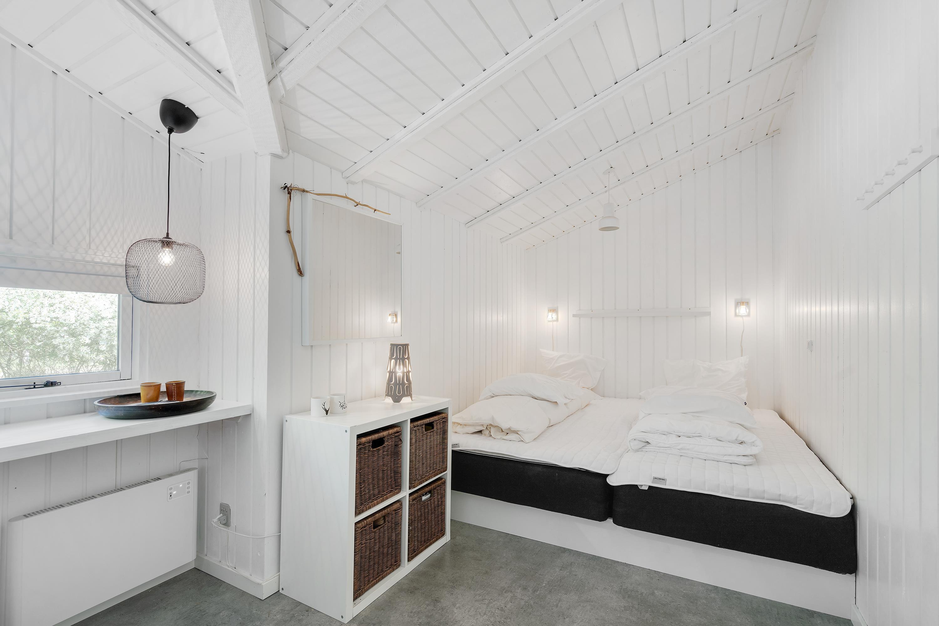 De lyse farver og højt til loftet skaber en rummelig atmosfære, mens de mange små detaljer tilfører sommerhuset ekstra charme og sjæl. Her vil I med sikkerhed føle jer velkomne fra første øjeblik! I den store væg-til-væg seng er der plads til, at børnene hopper ind og hygger med mor og far. Det store soveværelse, en tremmeseng og et puslebord gør det nemt og bekvemt også for småbørnsfamilien at holde ferie.
