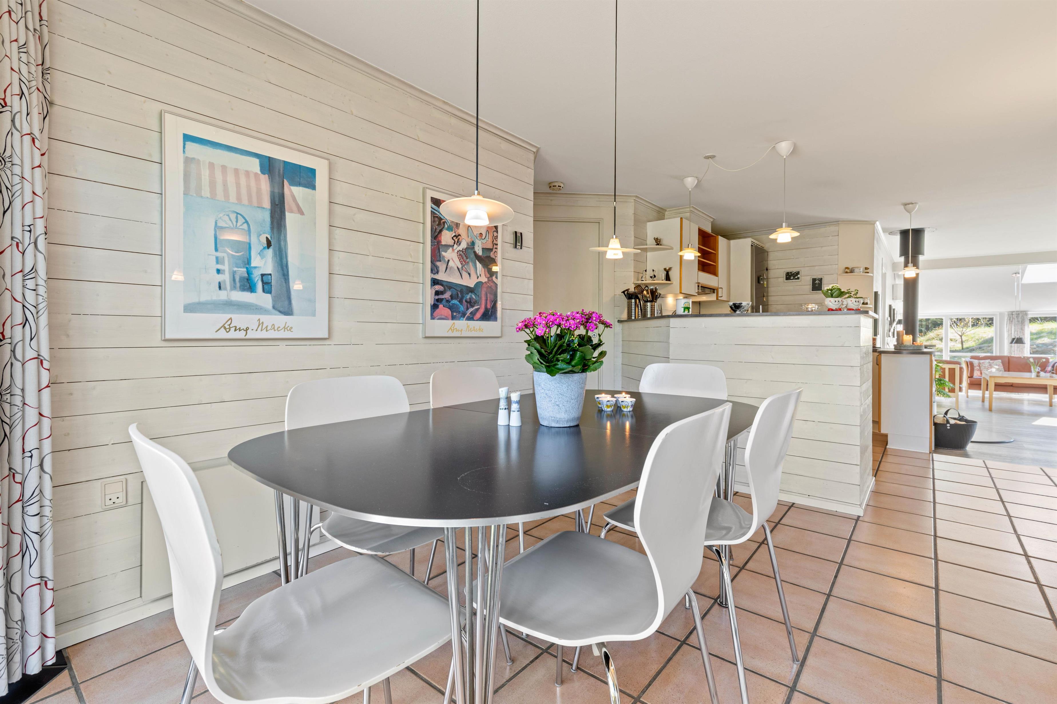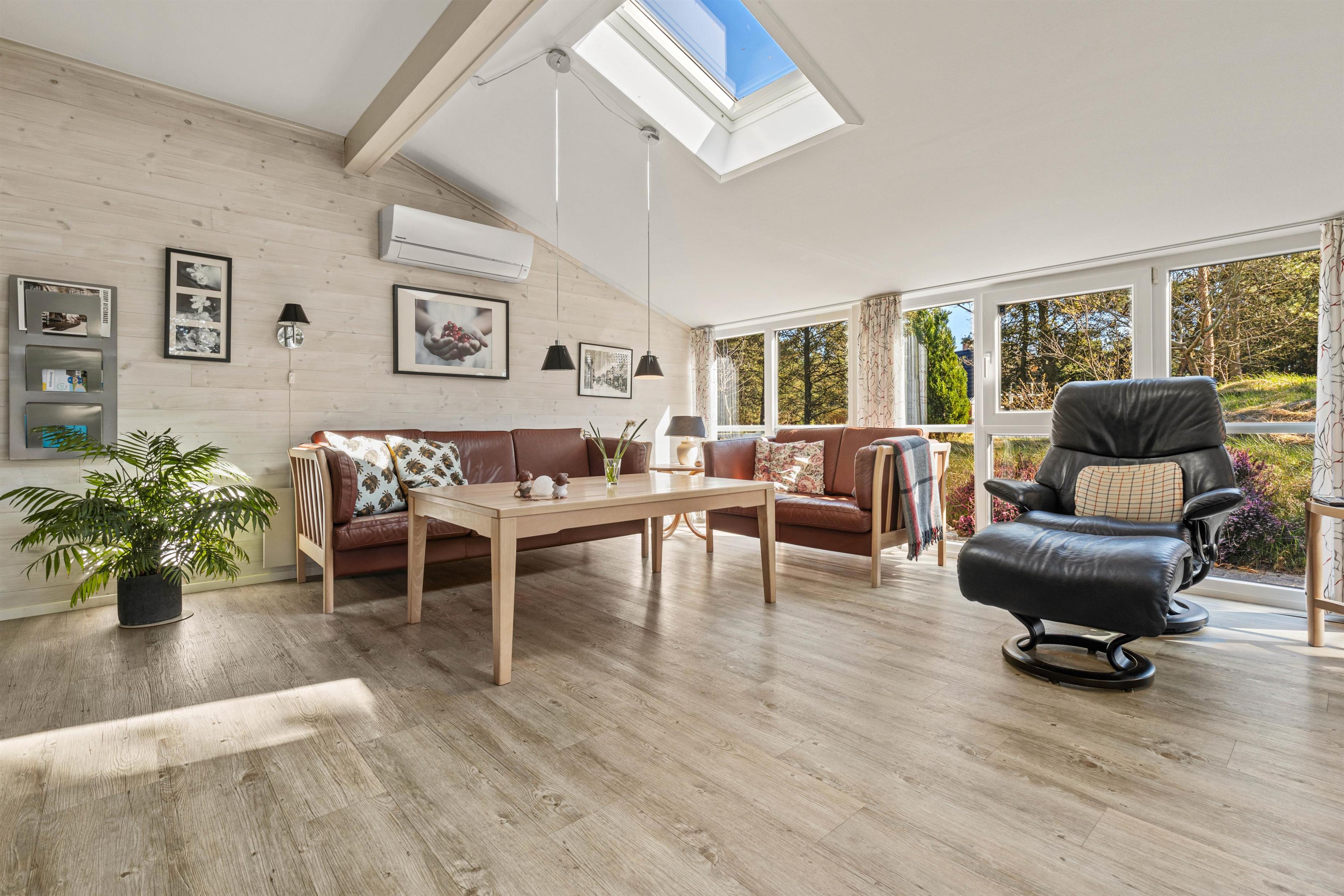 Huset hjerte er den åbne stue, som næsten fungerer som udestue med sine mange vinduer. Her har I en flot udsigt fra sofaen, så I selv på de kølige og regnfulde dage kan nyde naturen, mens brændeovnens knitren spreder hyggelig feriestemning og masser af varme.