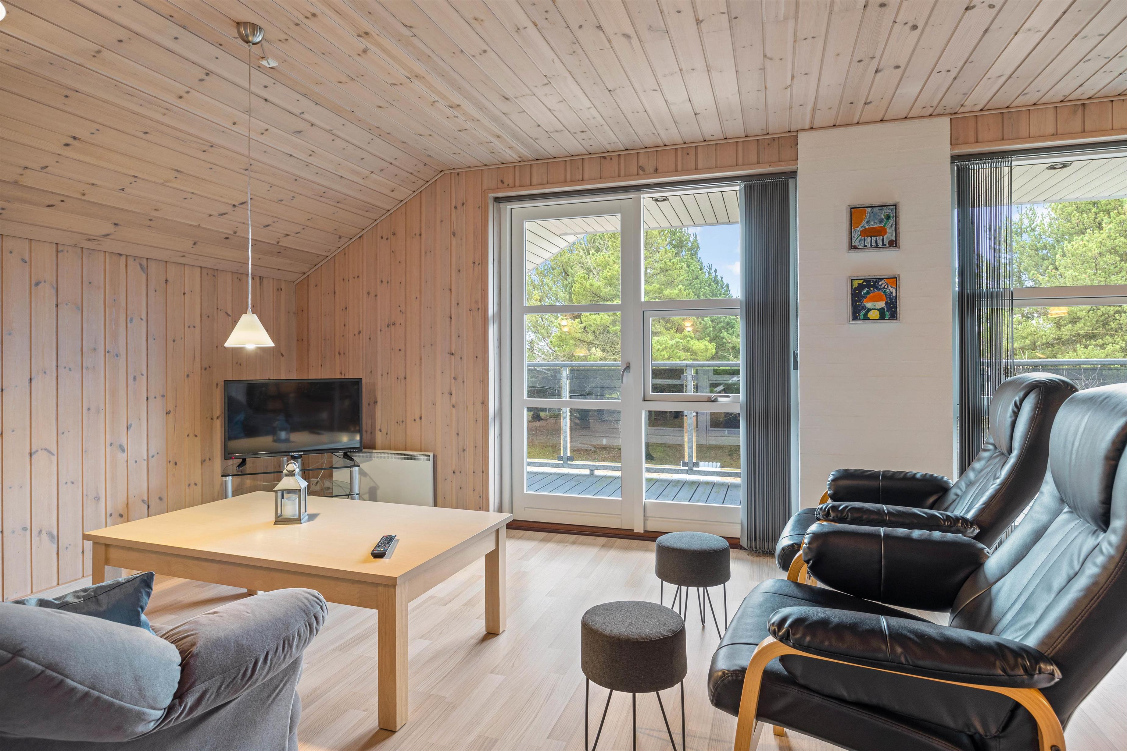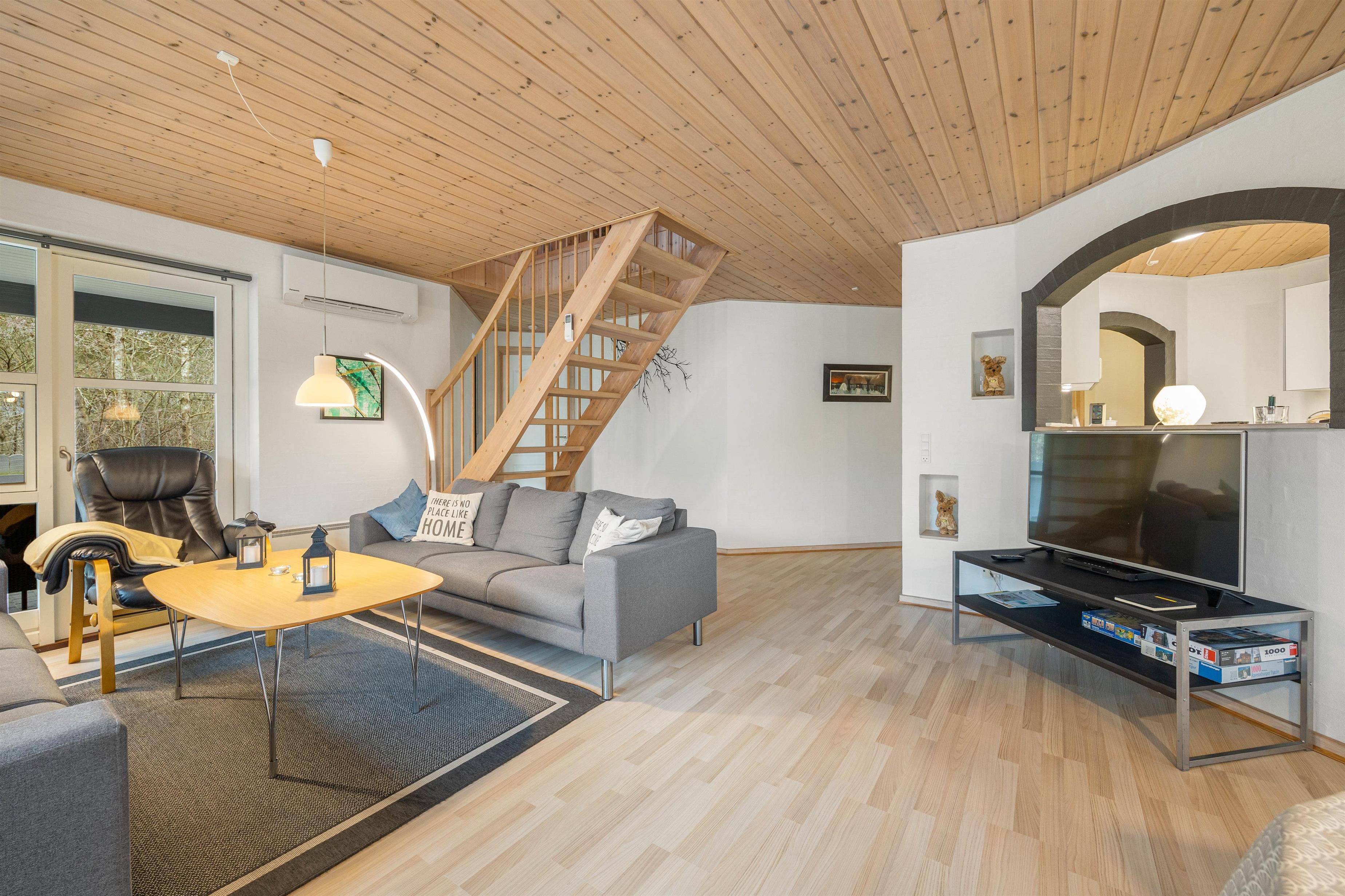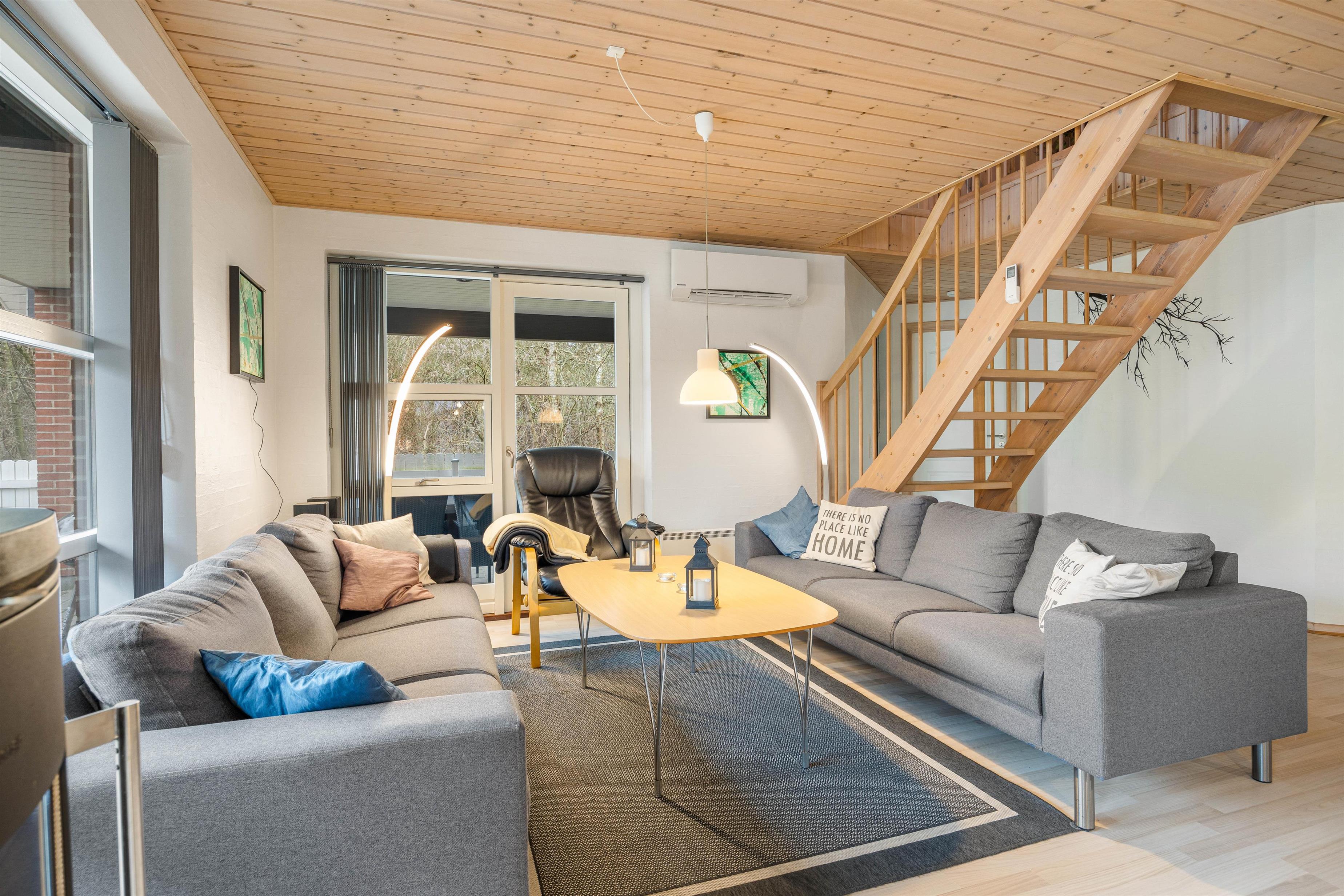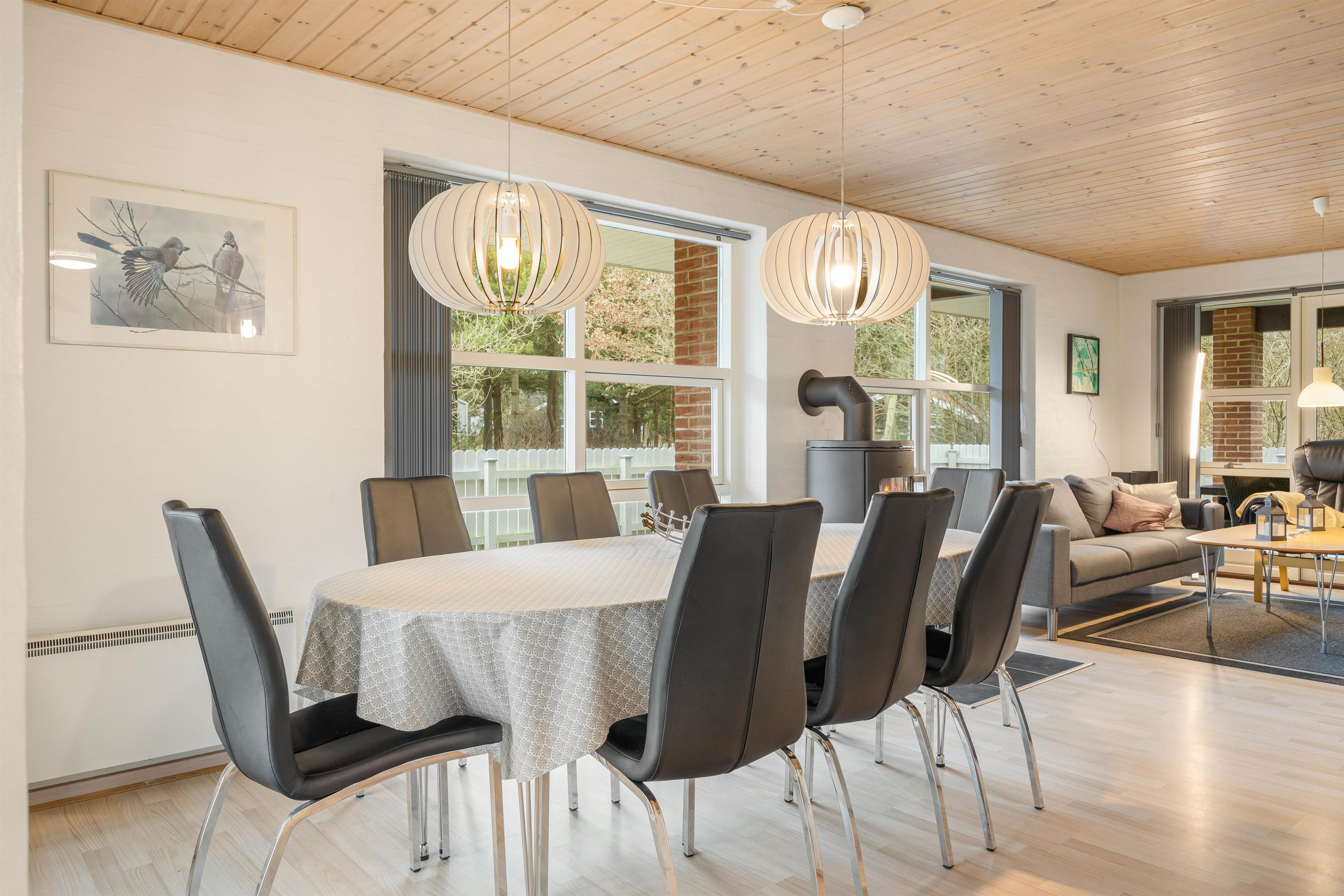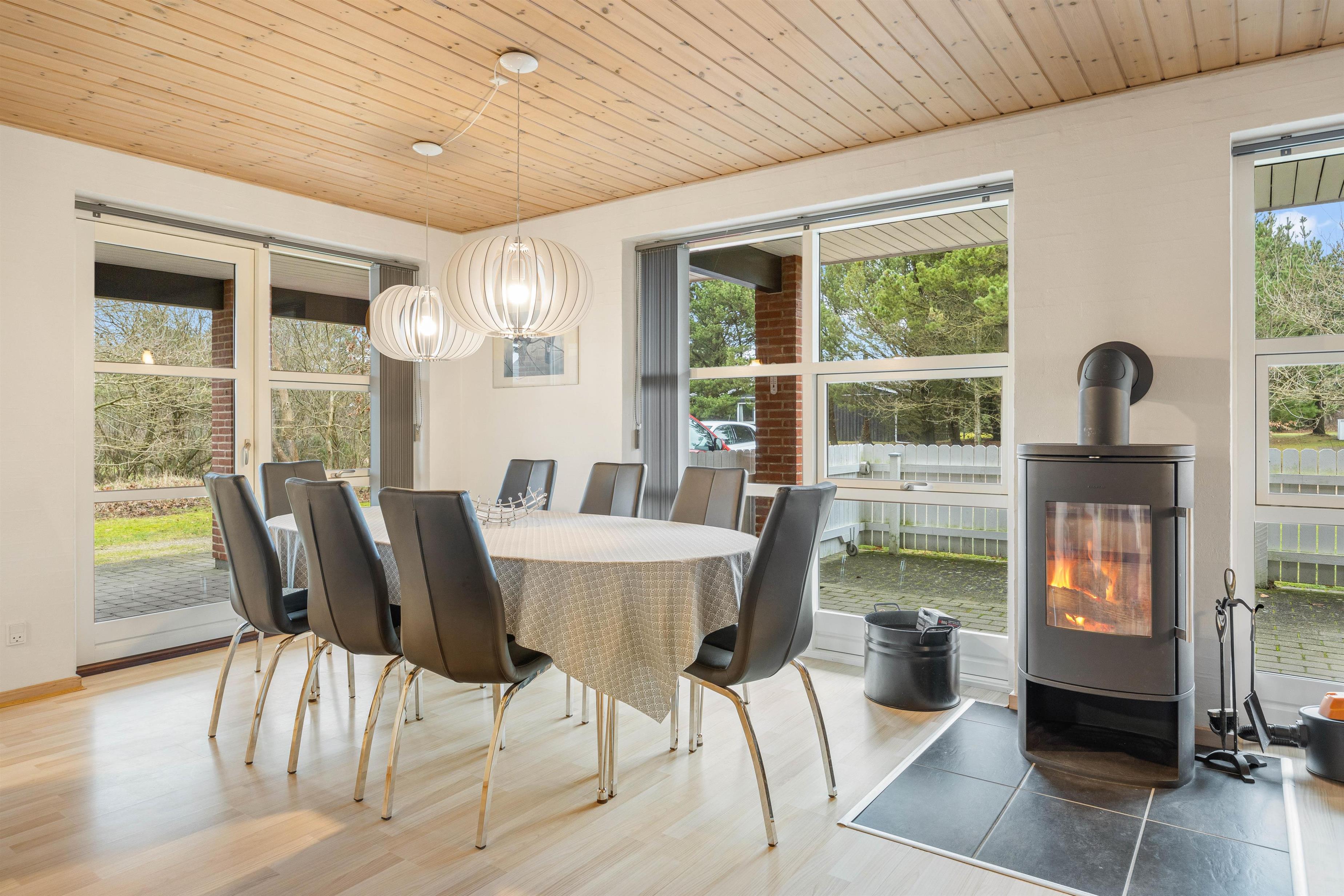 Gennem de mange vinduer skinner solen ind og lyser det hyggelige og venlige opholdsrum på stueetagen op. Her står sofagruppen sammen med brændeovnen og fjernsynet klar til jer, så I kan slappe af på bedste vis, mens I nyder udsigten ud over den naturskønne grund.