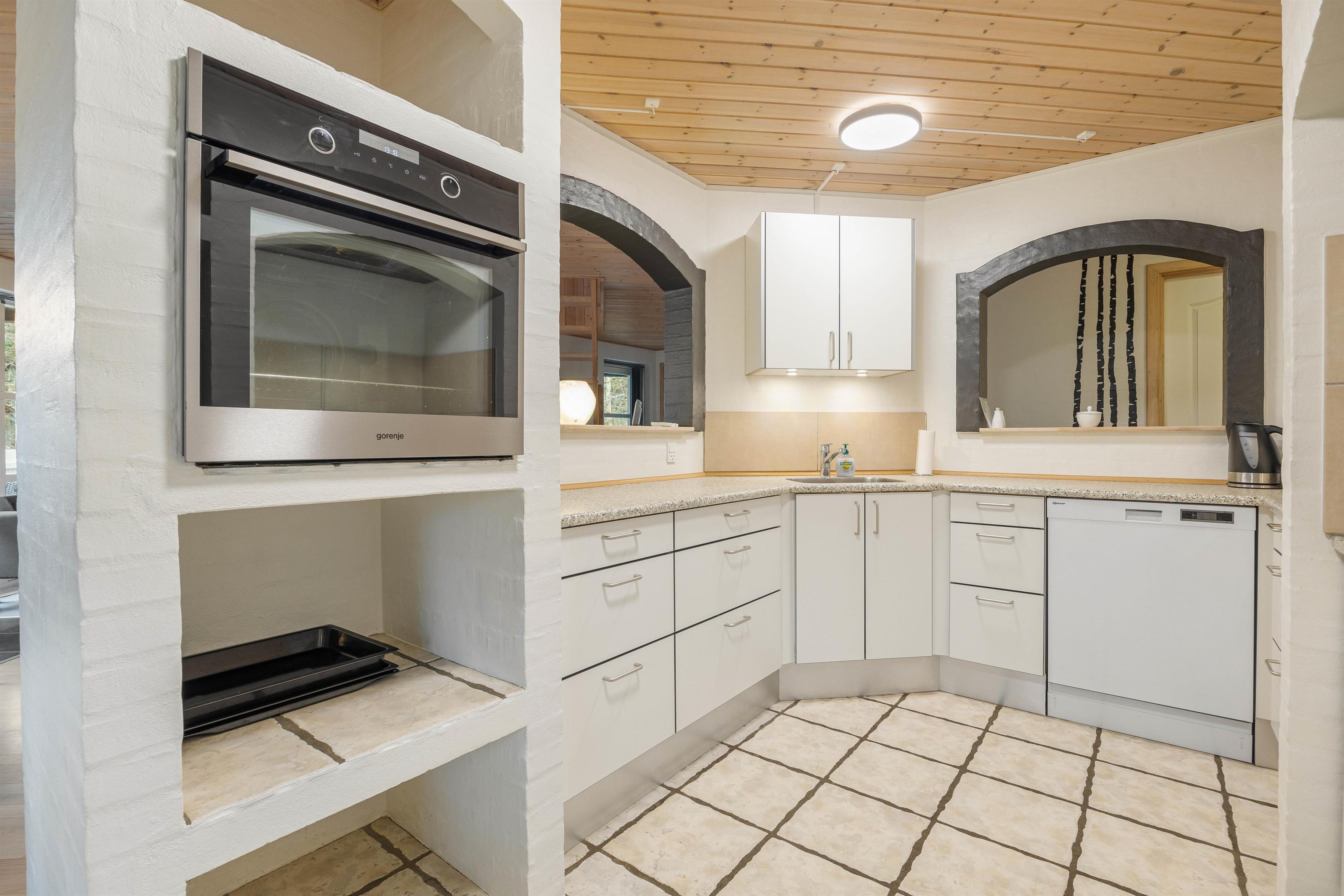 Det vinklede køkken har sin helt egen charme, og her kan I tilberede mange lækre feriemåltider fra morgen til aften. Her kan hele familien kokkerere sammen, og efter maden tager opvaskemaskinen sig af de huslige pligter for jer.