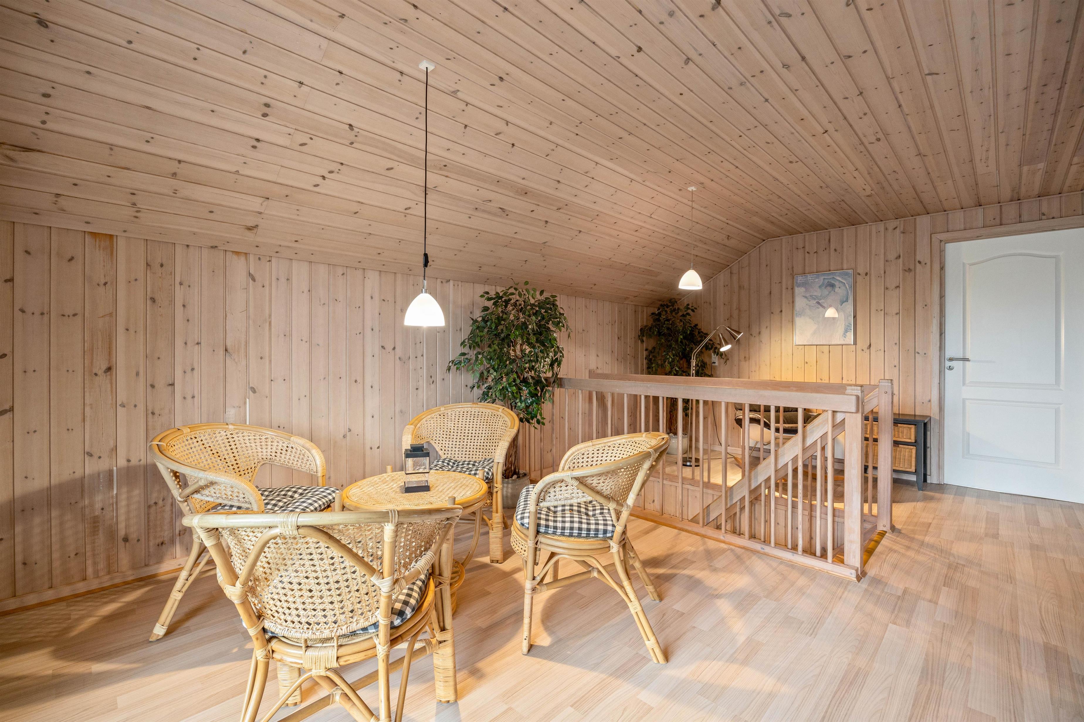 På første sal finder I endnu en lille stue, der er udstyret med både fjernsyn, radioer med cd afspiller, sofa og lænestol, så I i god ro og fred kan læse en bog, mens der nedenunder bliver set film eller spillet kort.