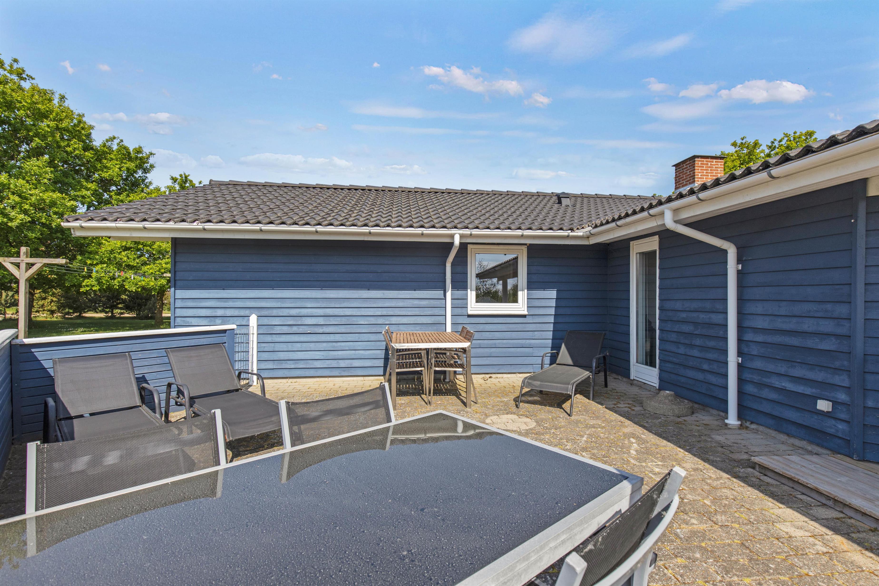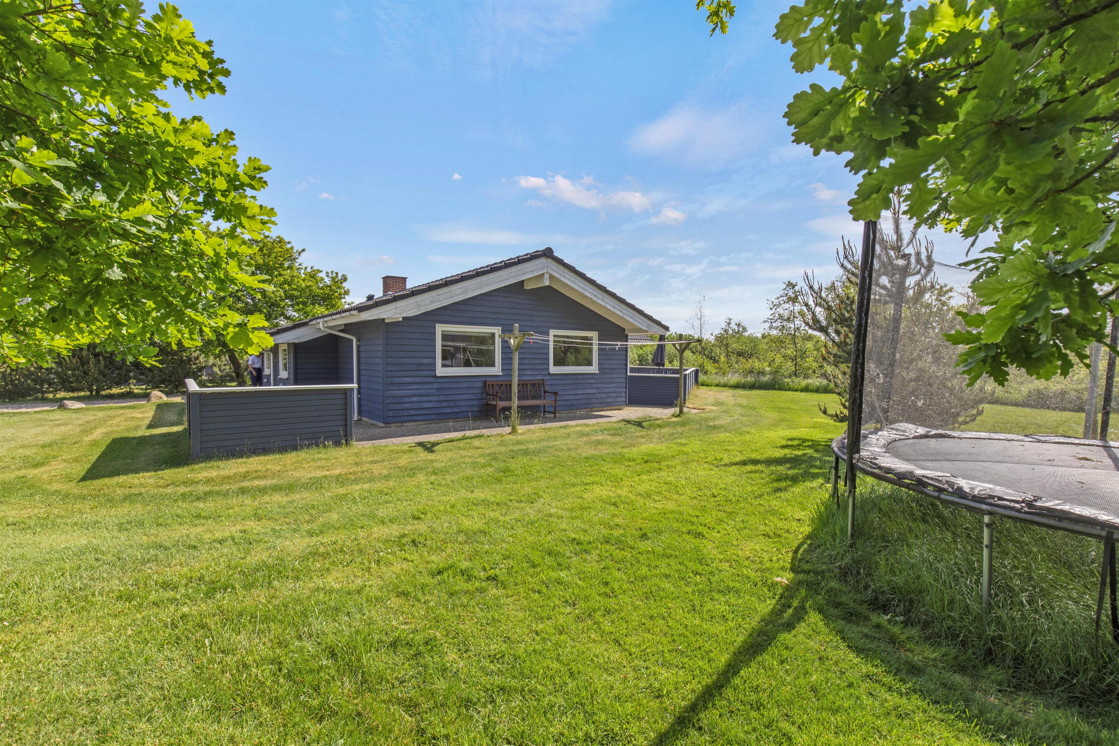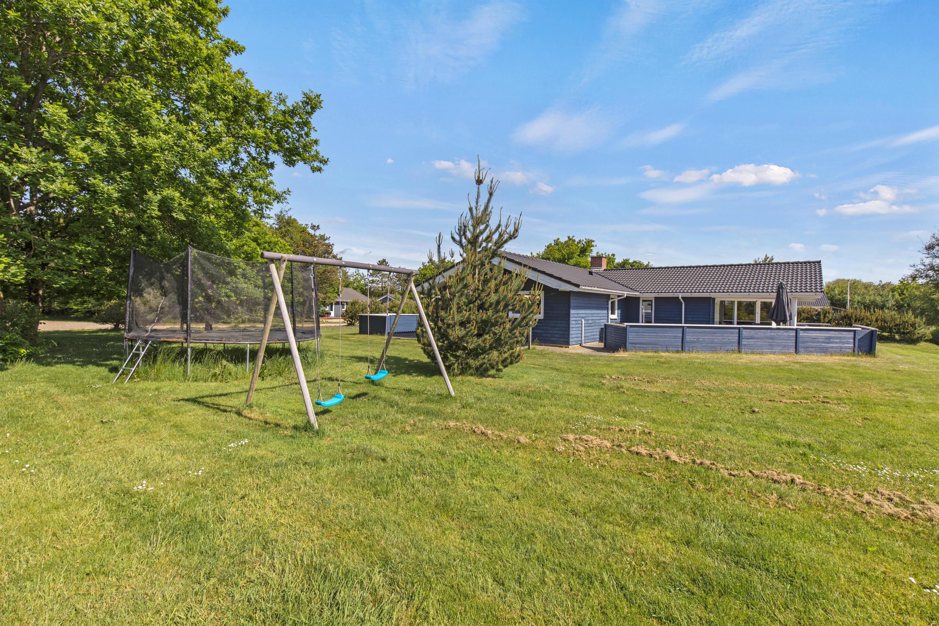 Med til sommerhuset hører et skønt udeareal med underholdning og afslapning for både store og små. På den lukkede terrasse kan I helt ugeneret nyde solens varme stråler fra liggestolene, og børnene og hundene kan helt sikkert hurtigt få dagene til at gå i den velholdte have med boldspil og leg. Der står også et gyngestativ til de små feriegæster.