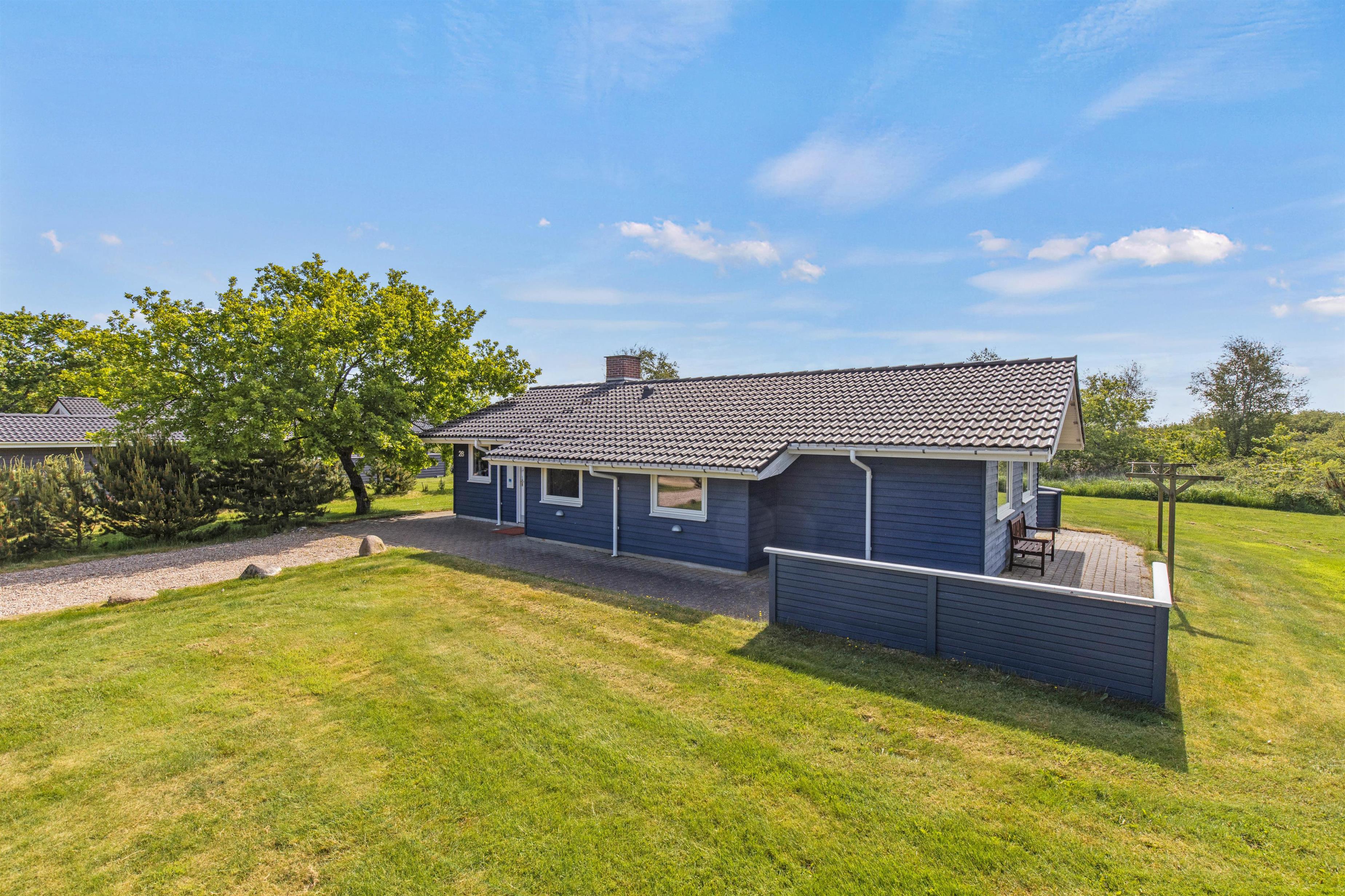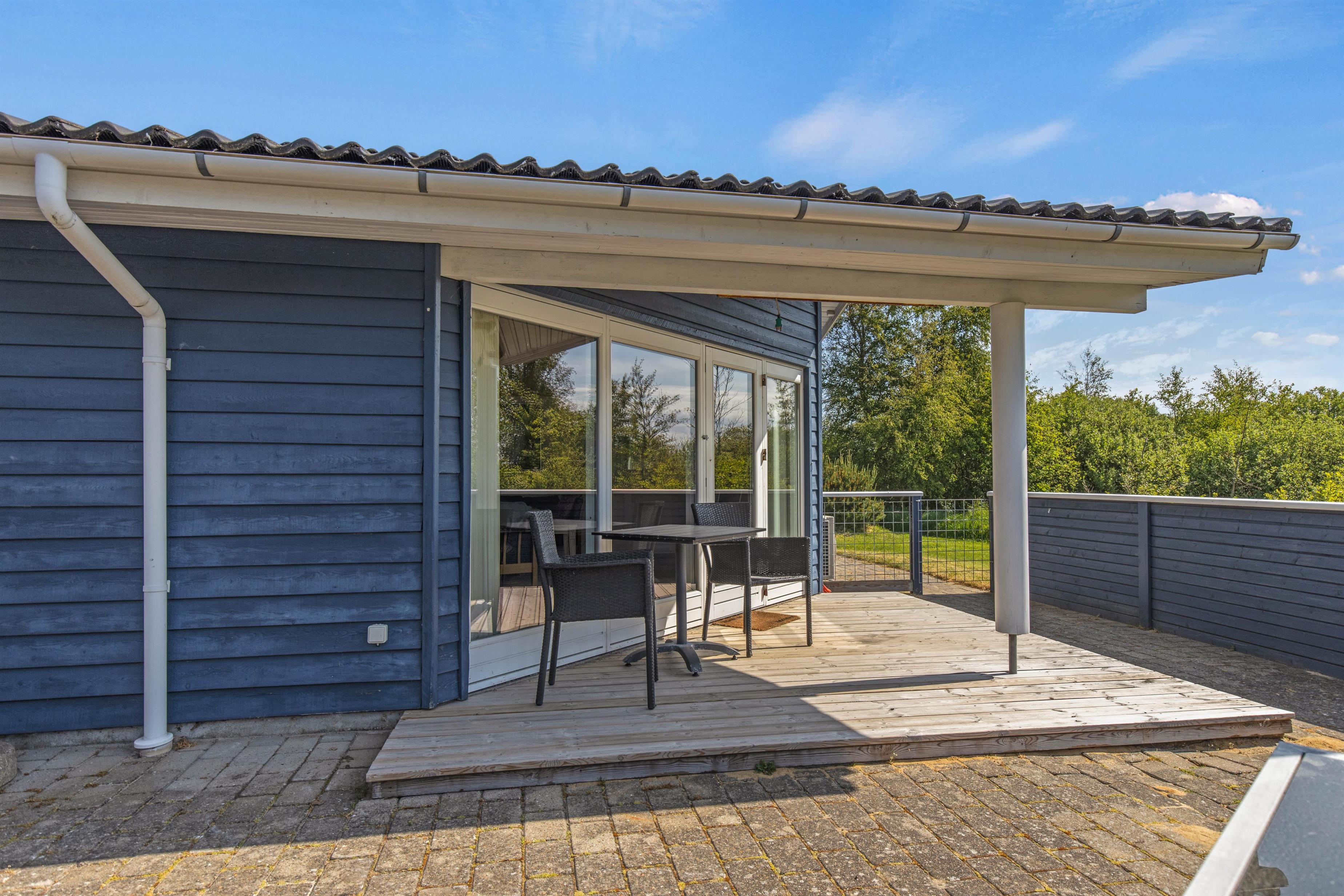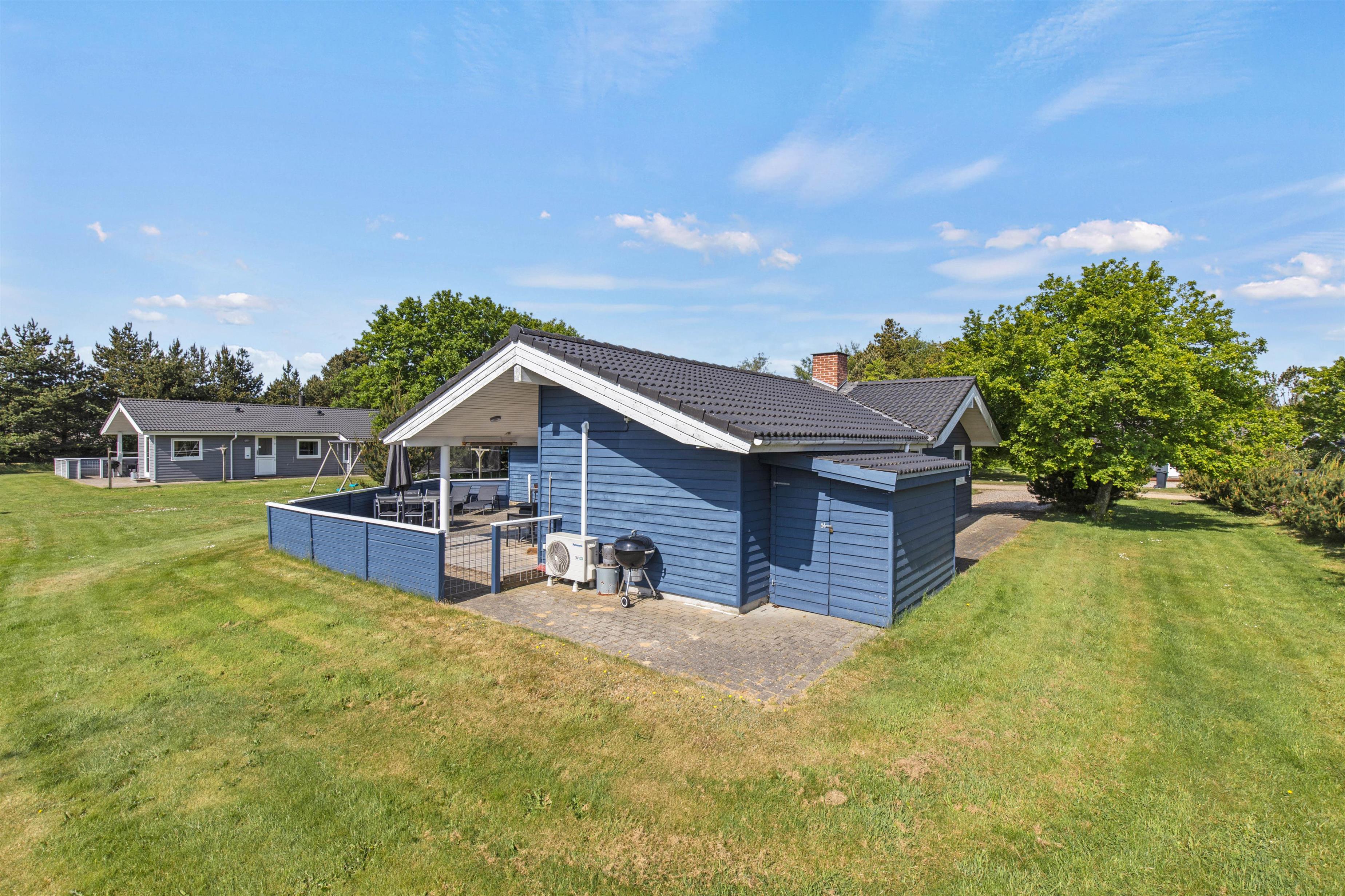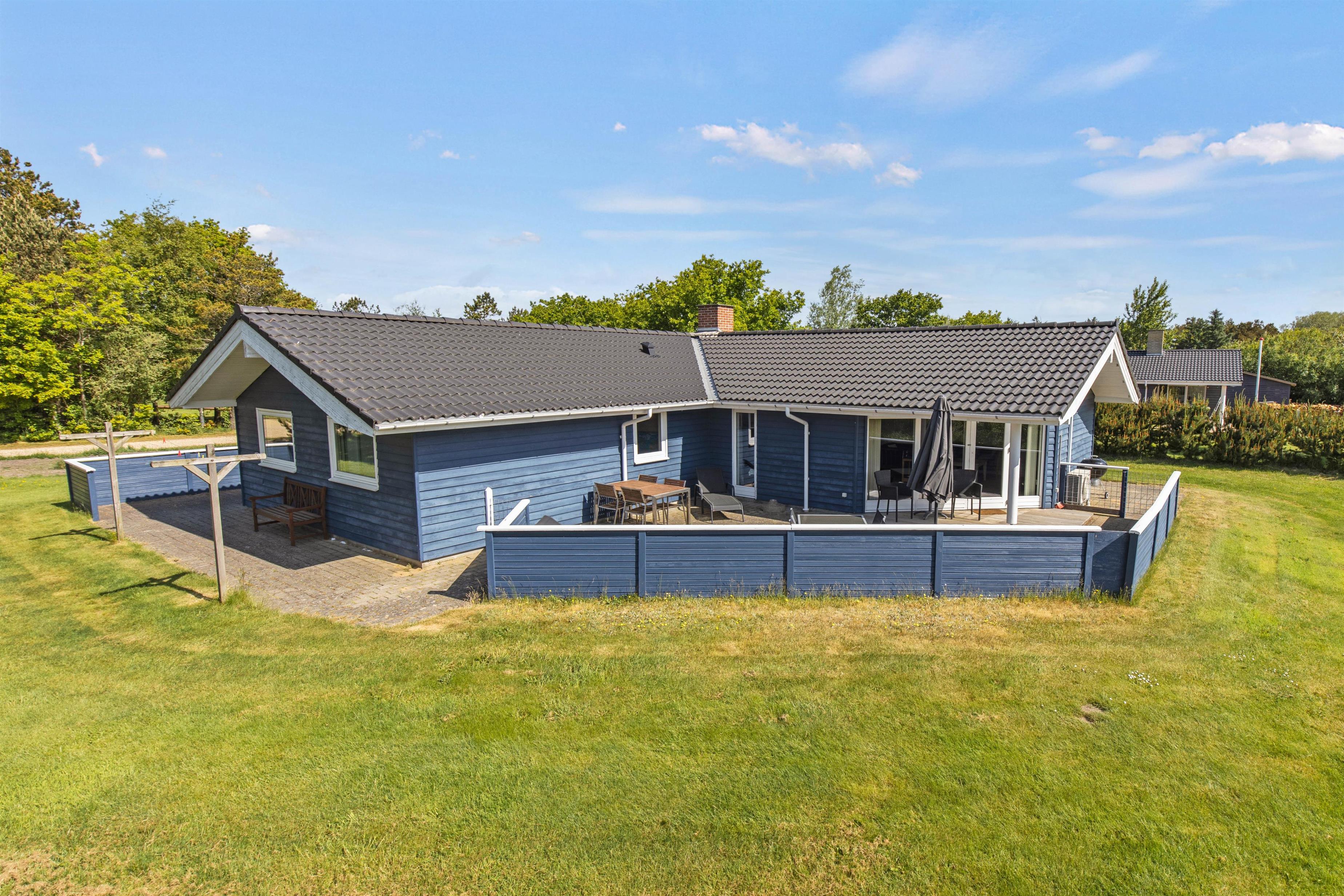 Med til sommerhuset hører et skønt udeareal med underholdning og afslapning for både store og små. På den lukkede terrasse kan I helt ugeneret nyde solens varme stråler fra liggestolene, og børnene og hundene kan helt sikkert hurtigt få dagene til at gå i den velholdte have med boldspil og leg. Der står også et gyngestativ til de små feriegæster.