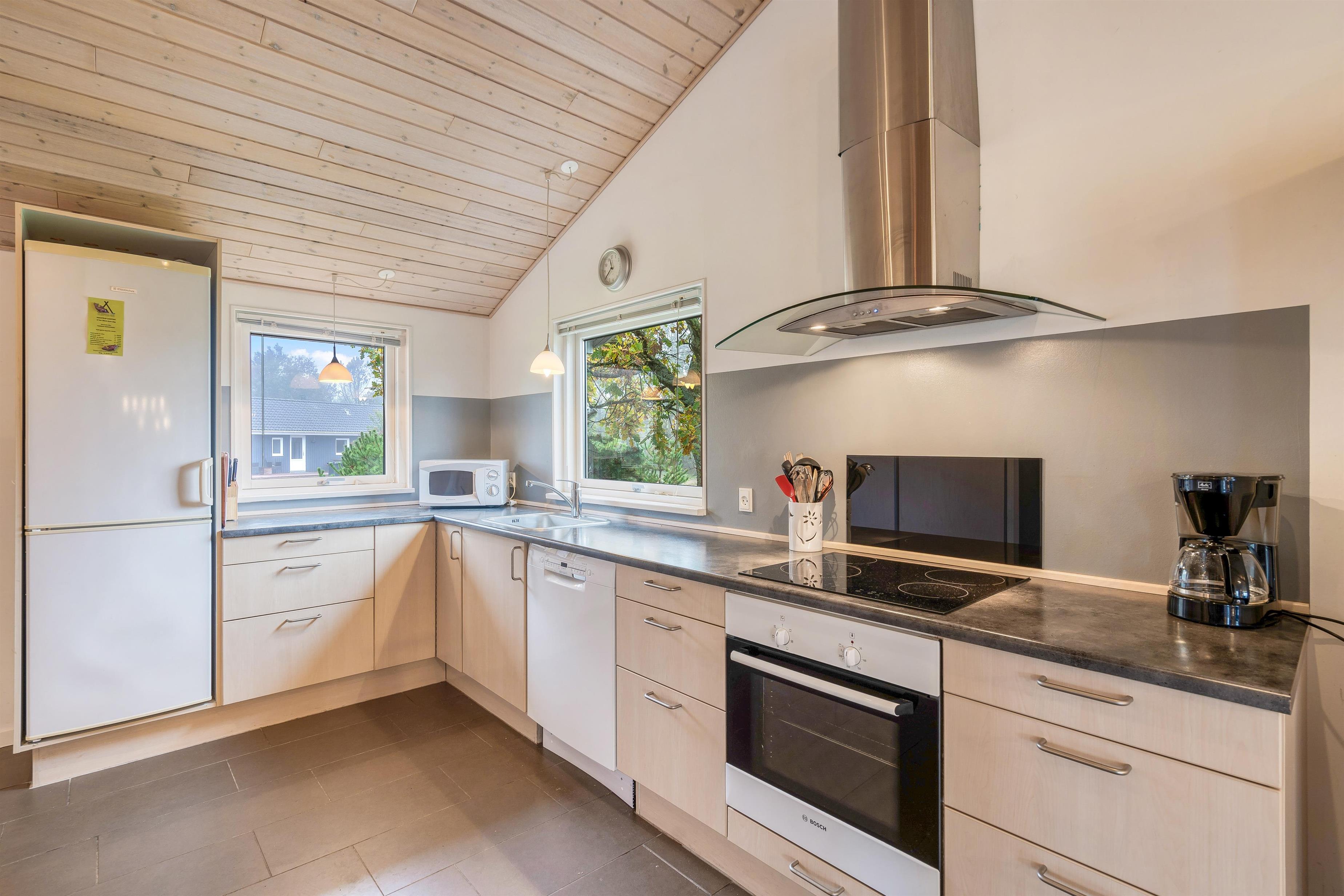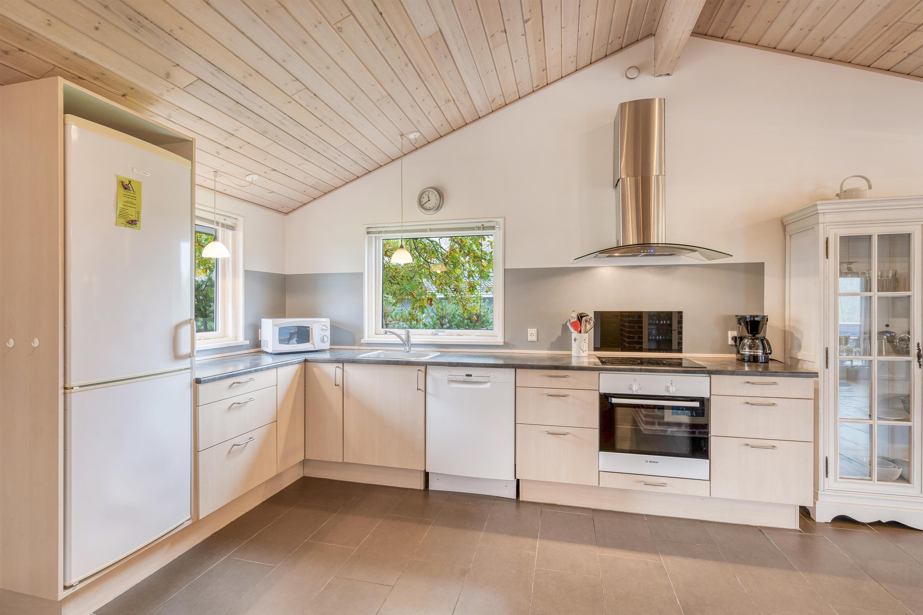 Opholdsrummet fungerer som husets hjerte og kombinerer stuen og det veludstyrede køkken. Her vil I med garanti komme til at tilbringe mange hyggelige stunder i løbet af ferien i familiens skønne samvær. I midten af rummet står også brændeovnen, som spreder varme og god stemning hele året rundt.